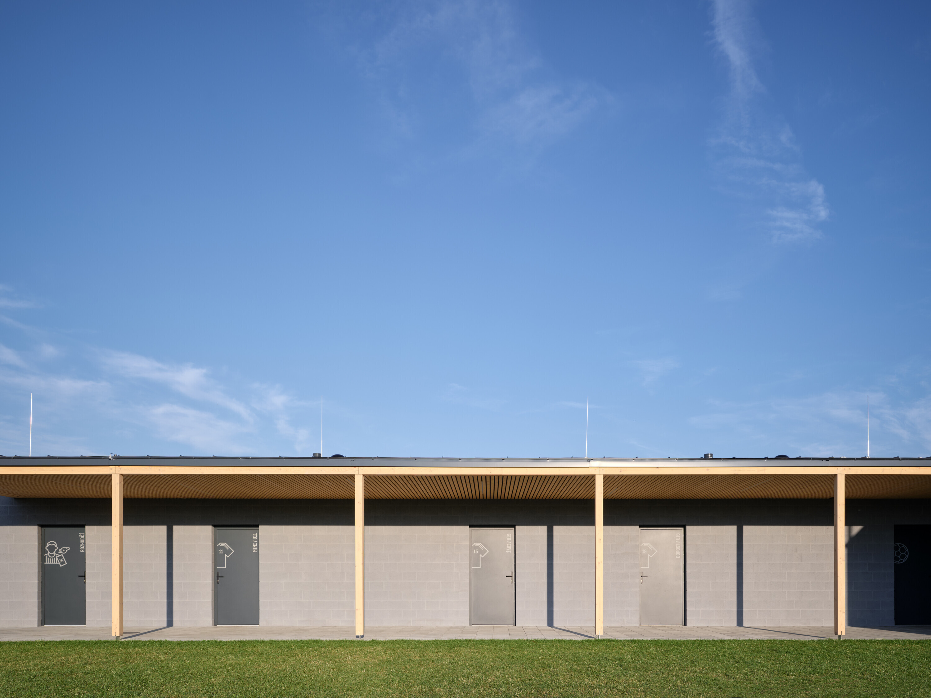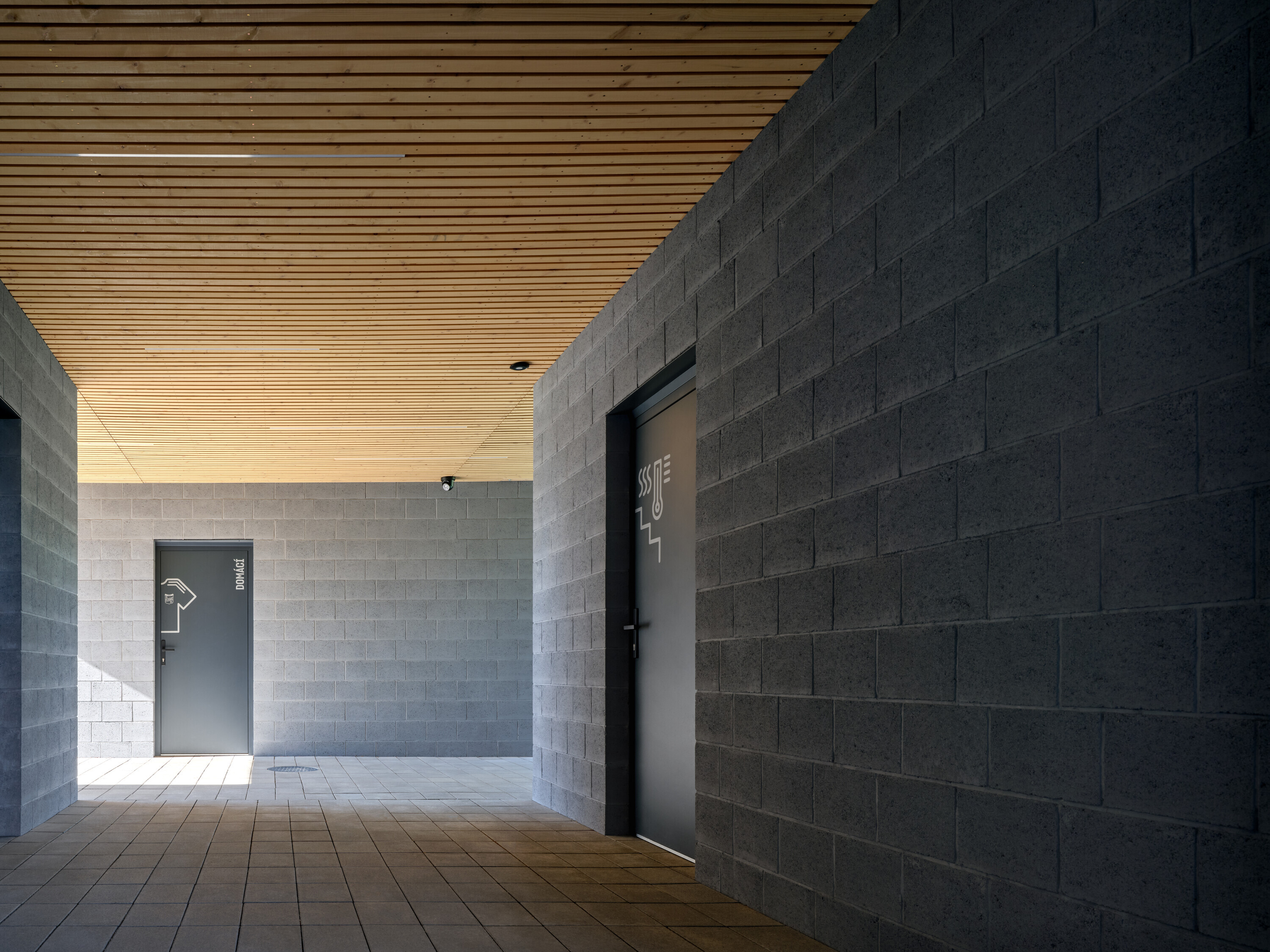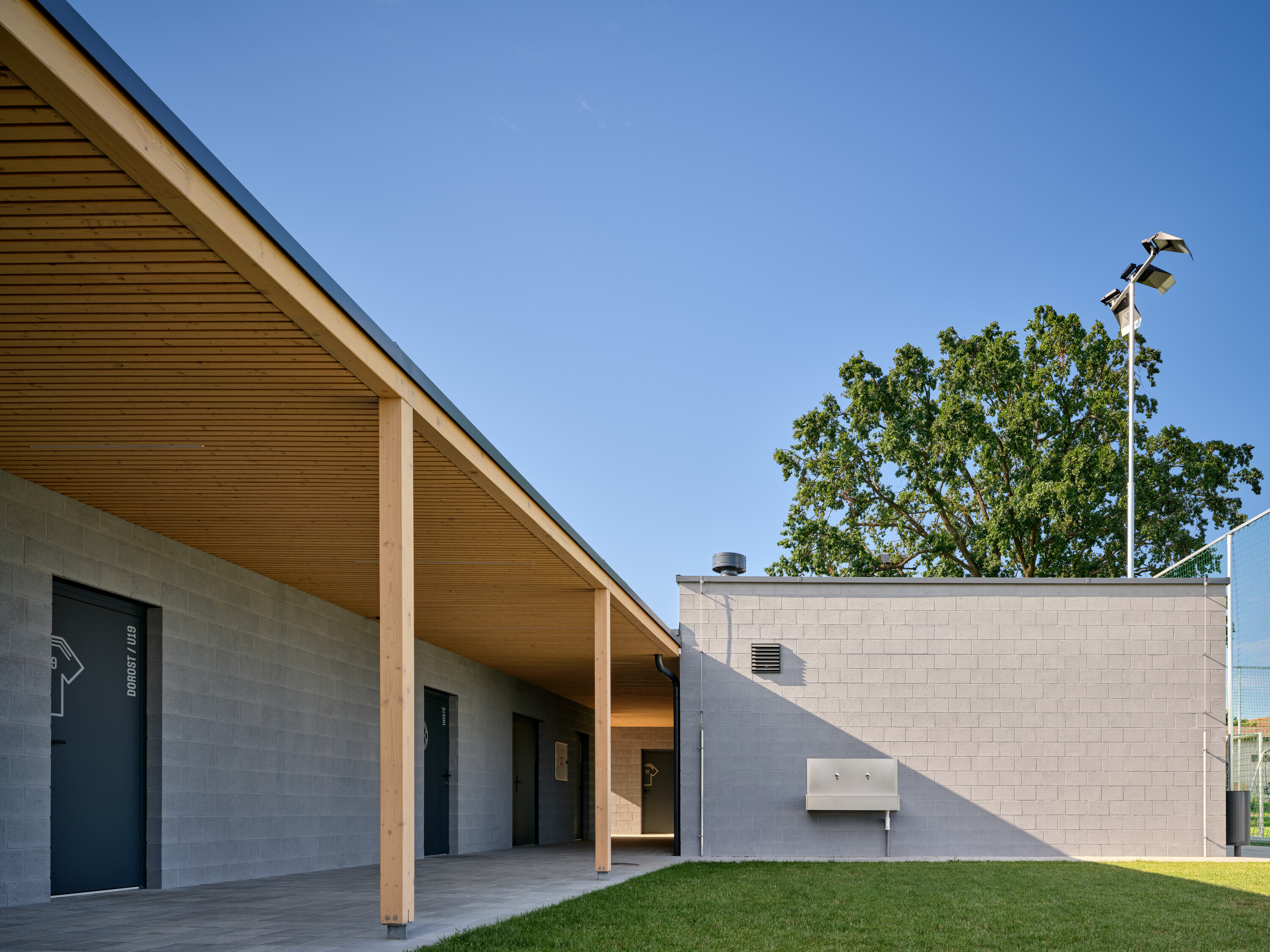Výplne otvorov sú hliníkové. Pergoly sú zastrešené falcovaným plechom, ploché strechy s fotovoltickými panelmi vďaka batériovému úložisku vo veľkej miere pokrývajú spotrebu budovy aj osvetlenia ihriska.