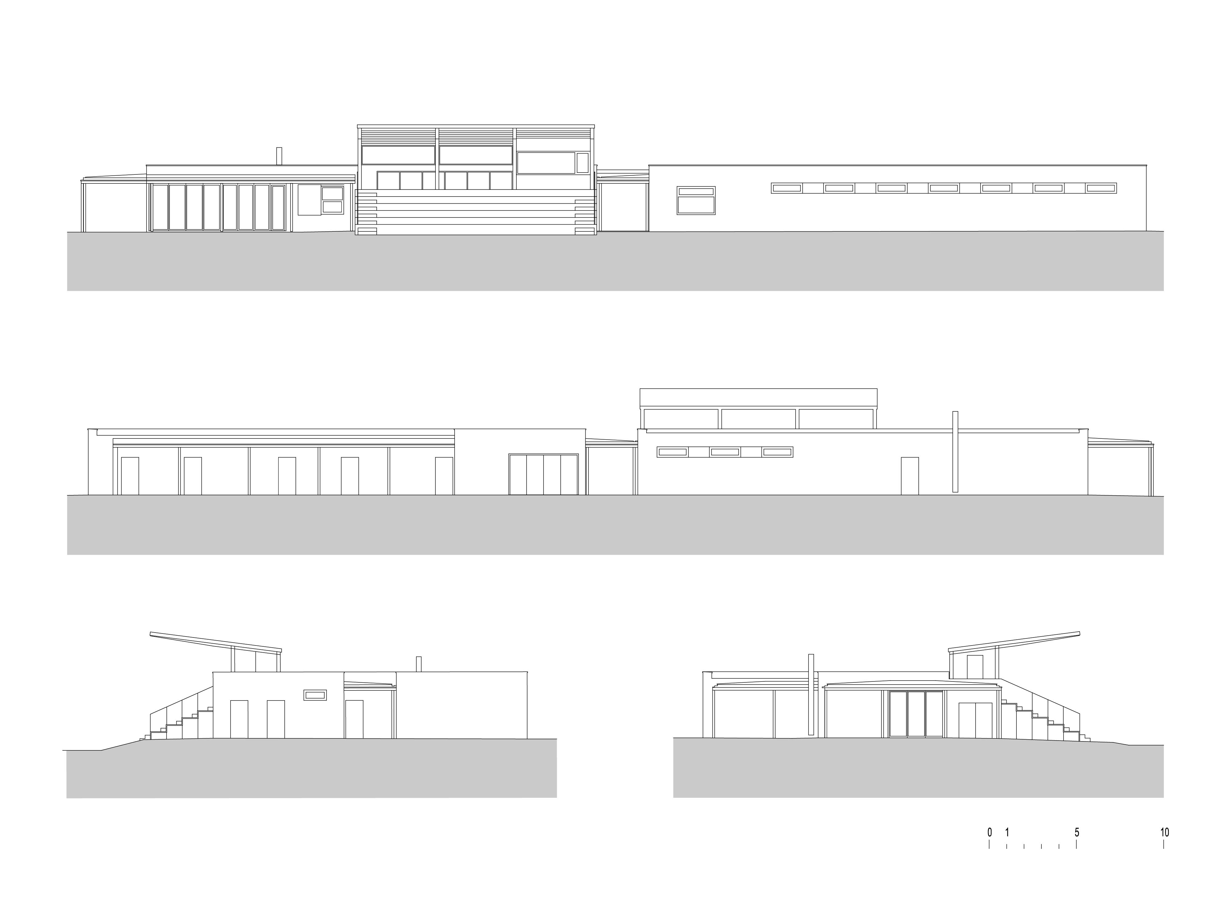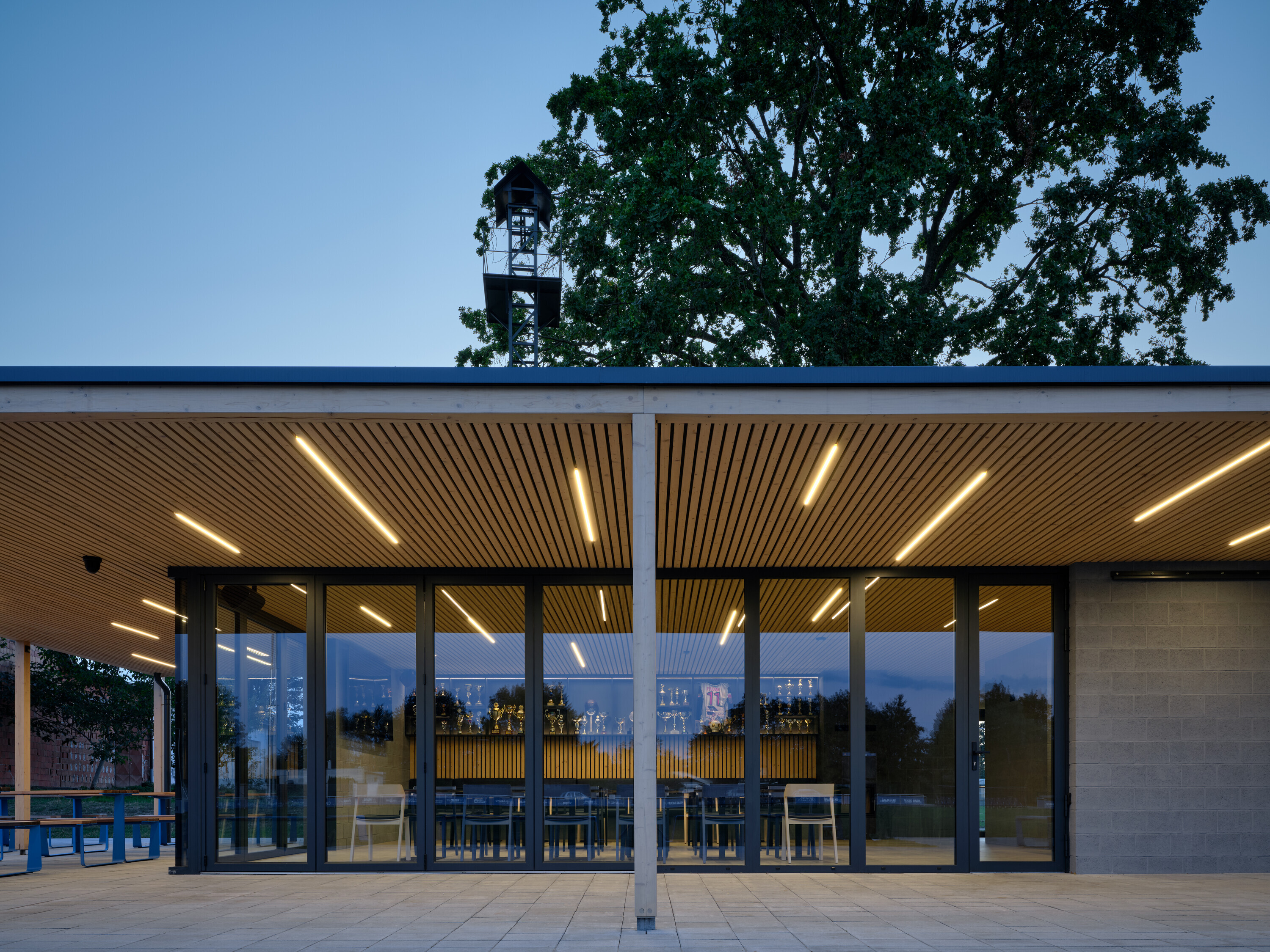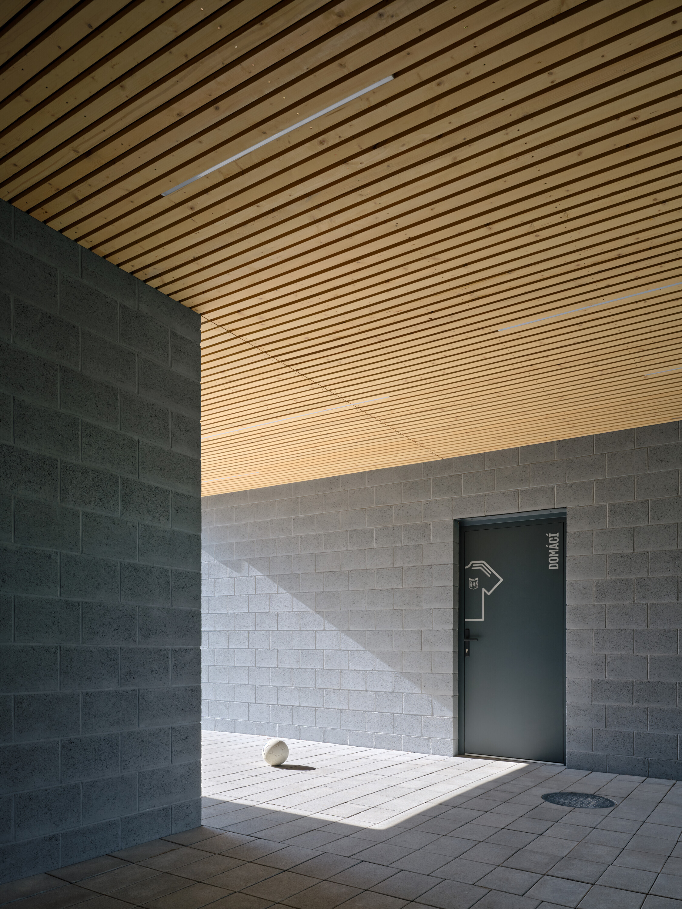 Výplne otvorov sú hliníkové. Pergoly sú zastrešené falcovaným plechom, ploché strechy s fotovoltickými panelmi vďaka batériovému úložisku vo veľkej miere pokrývajú spotrebu budovy aj osvetlenia ihriska.