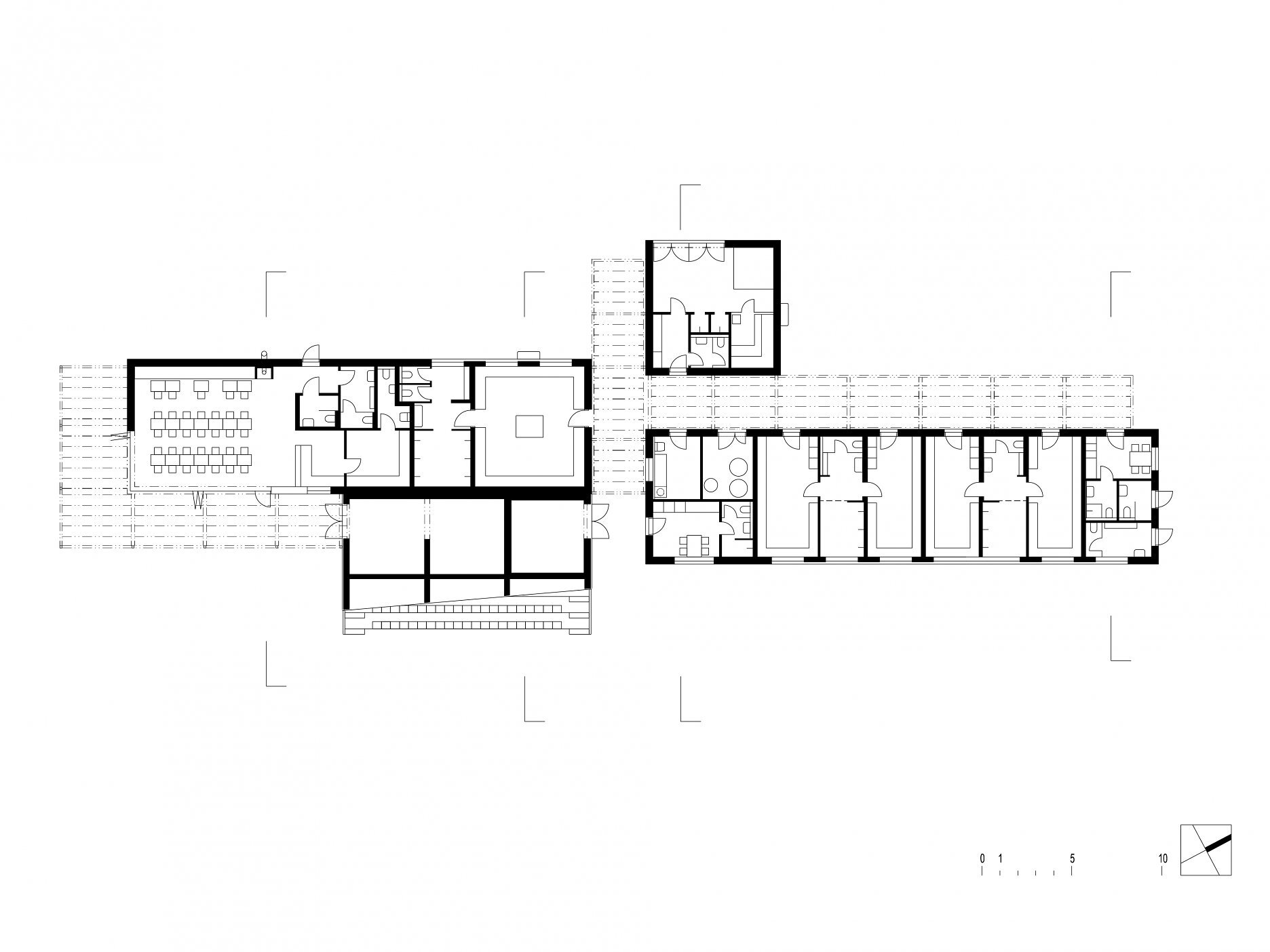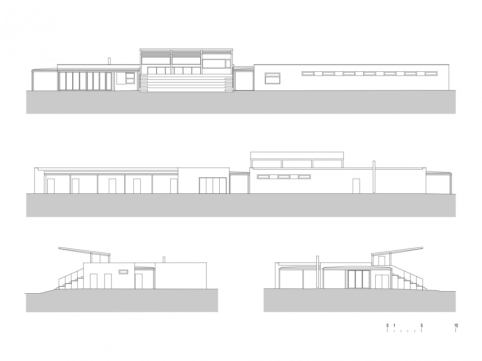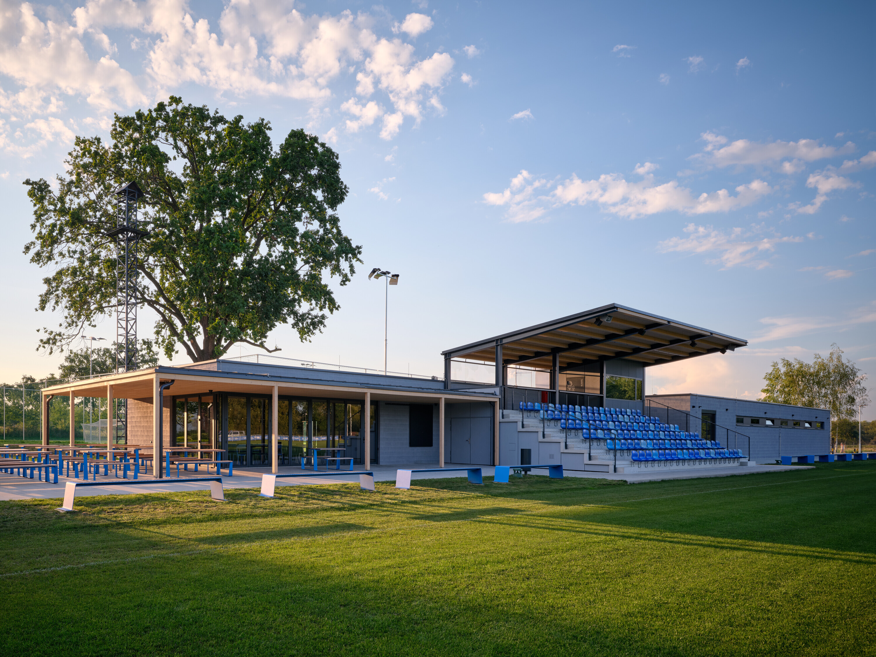 Budova je rozdelená do štyroch prevádzkovo samostatných objemov, prepojených vonkajšou krytou komunikáciou – dreveným podlubím. Napriek jednoduchej forme objektov vznikol komplexný celok, rešpektujúci mierku okolitej zástavby. Trojicu hmôt z betónových tvárnic dopĺňa tribúna s kabínou hlásateľa a skladmi pod priestorom pre divákov. Drevené pergoly slúžia ako komunikačný aj pobytový priestor, chránený pred slnkom a dažďom. Pergola pri klubovni sa vďaka skladacej presklenej stene mení na sezónne rozšírenie priestoru s občerstvením.