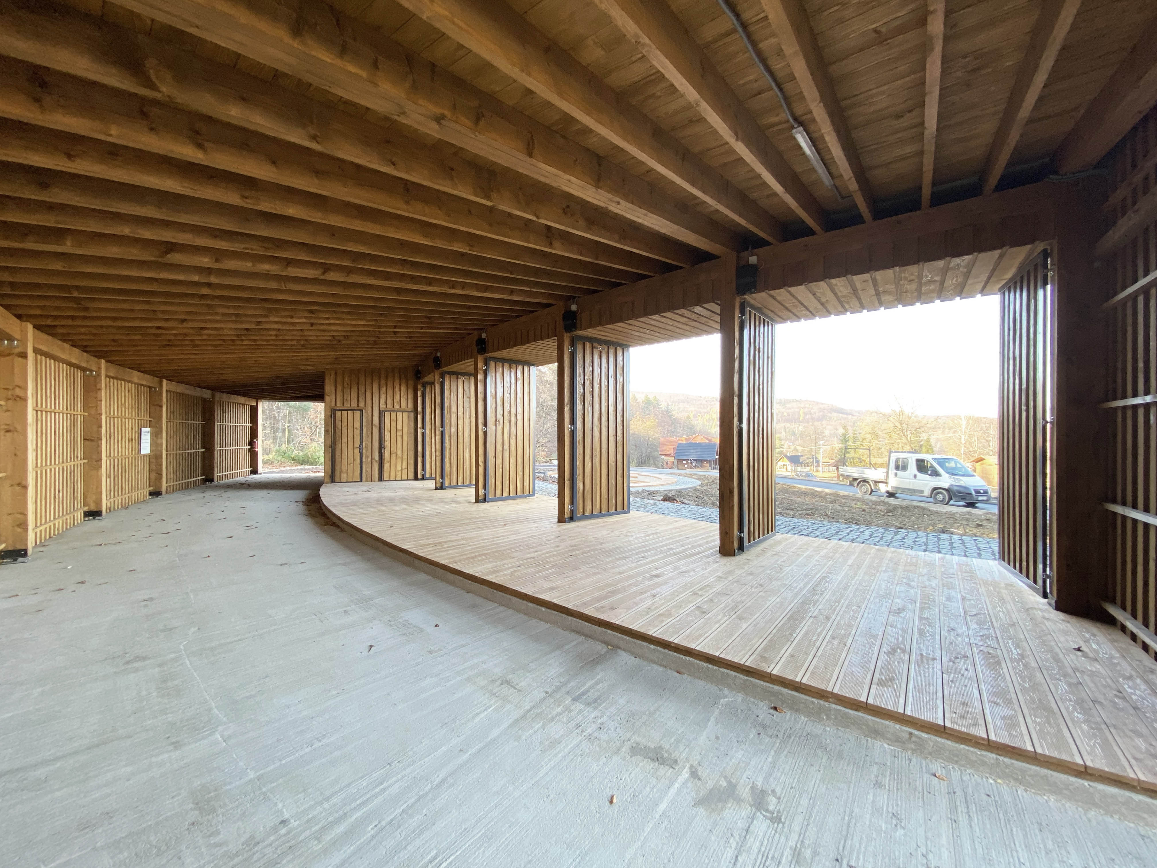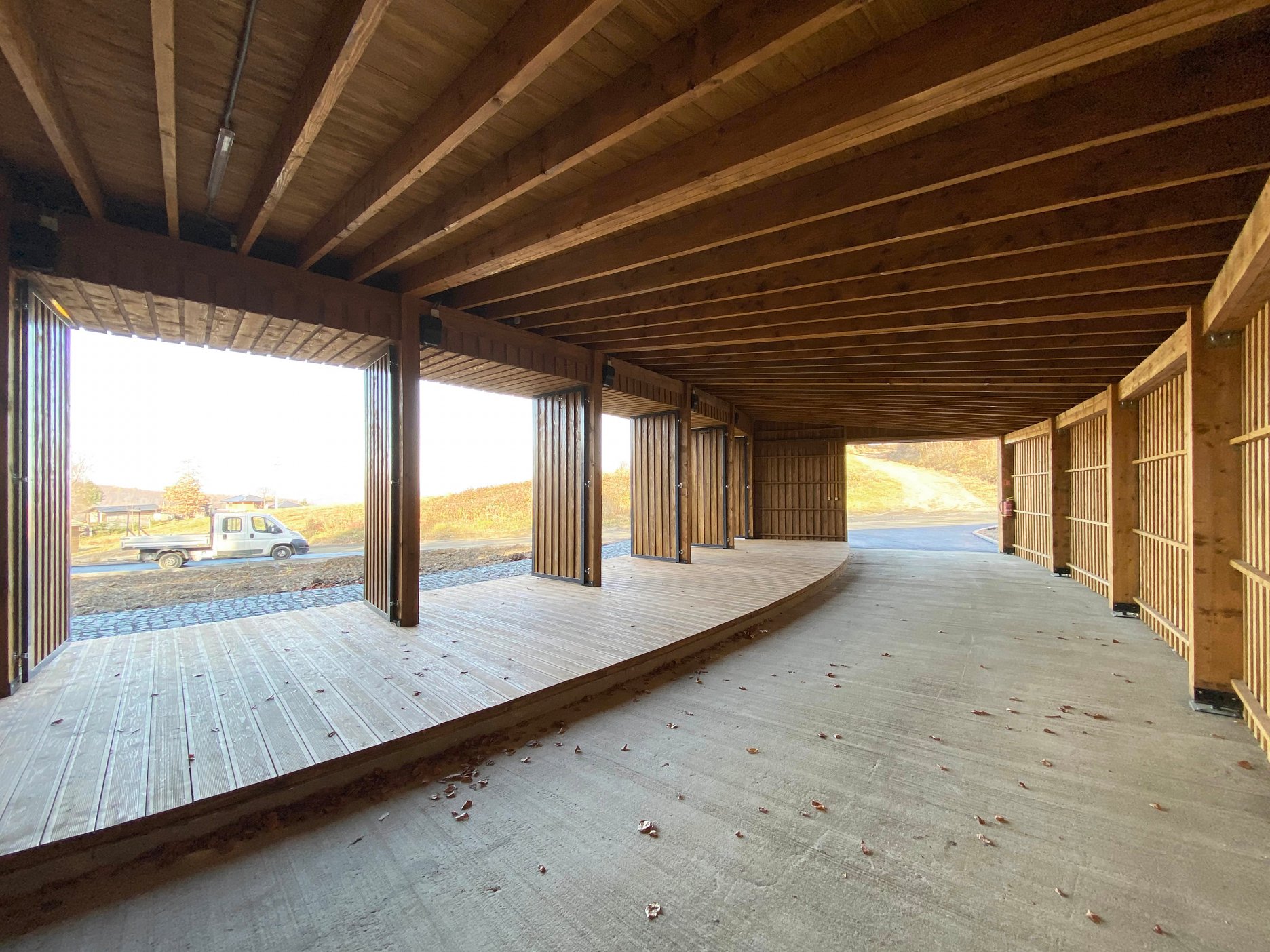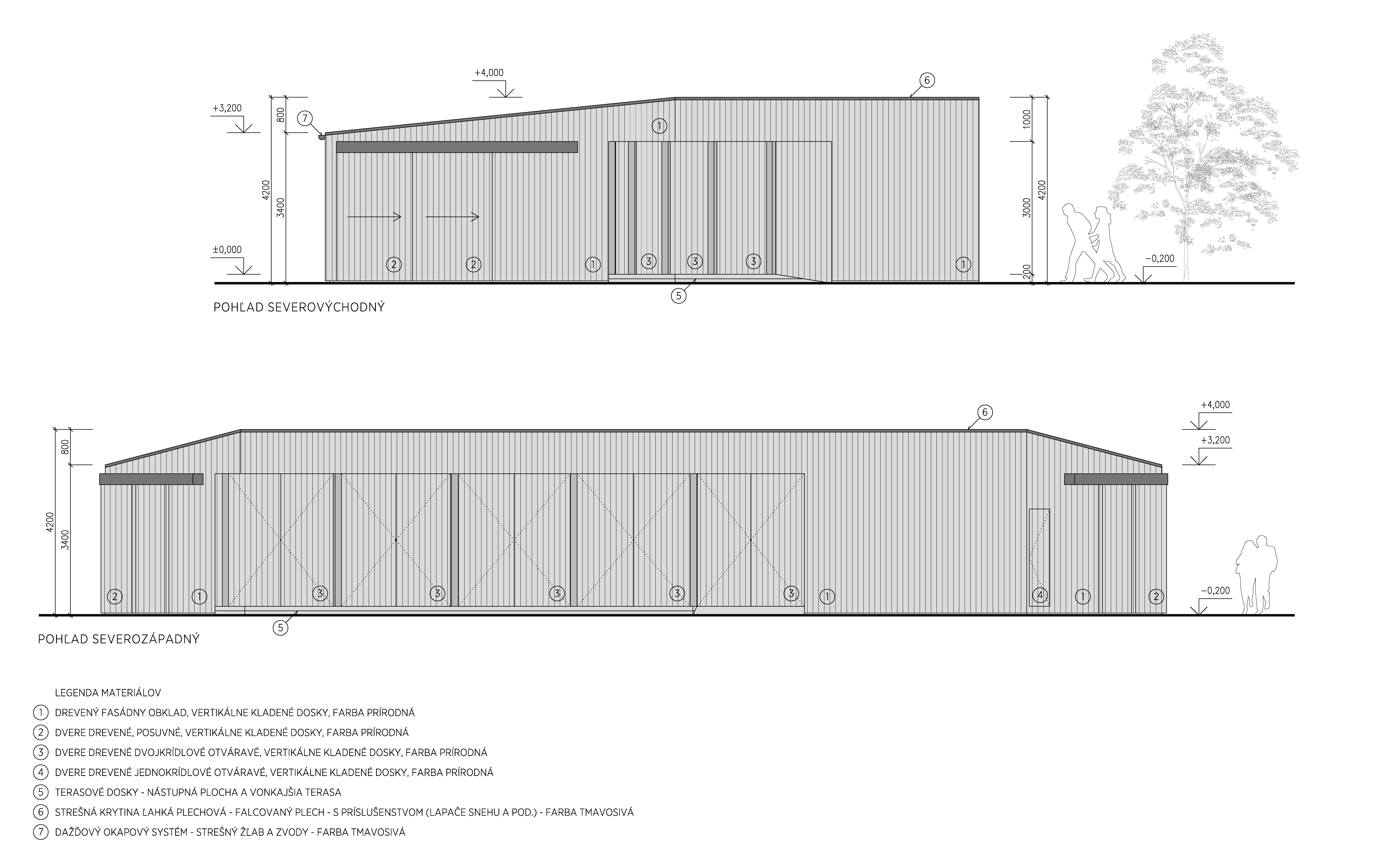 Vertikálne kladený obklad fasády, plynulo pokračuje aj na krídlach otváravých a posuvných dverí. Finálnu vrstvu strechy tvorí ľahká plechová krytina. Uzavreté skladové a hygienické priestory sú obložené keramickým obkladom a keramickou dlažbou.