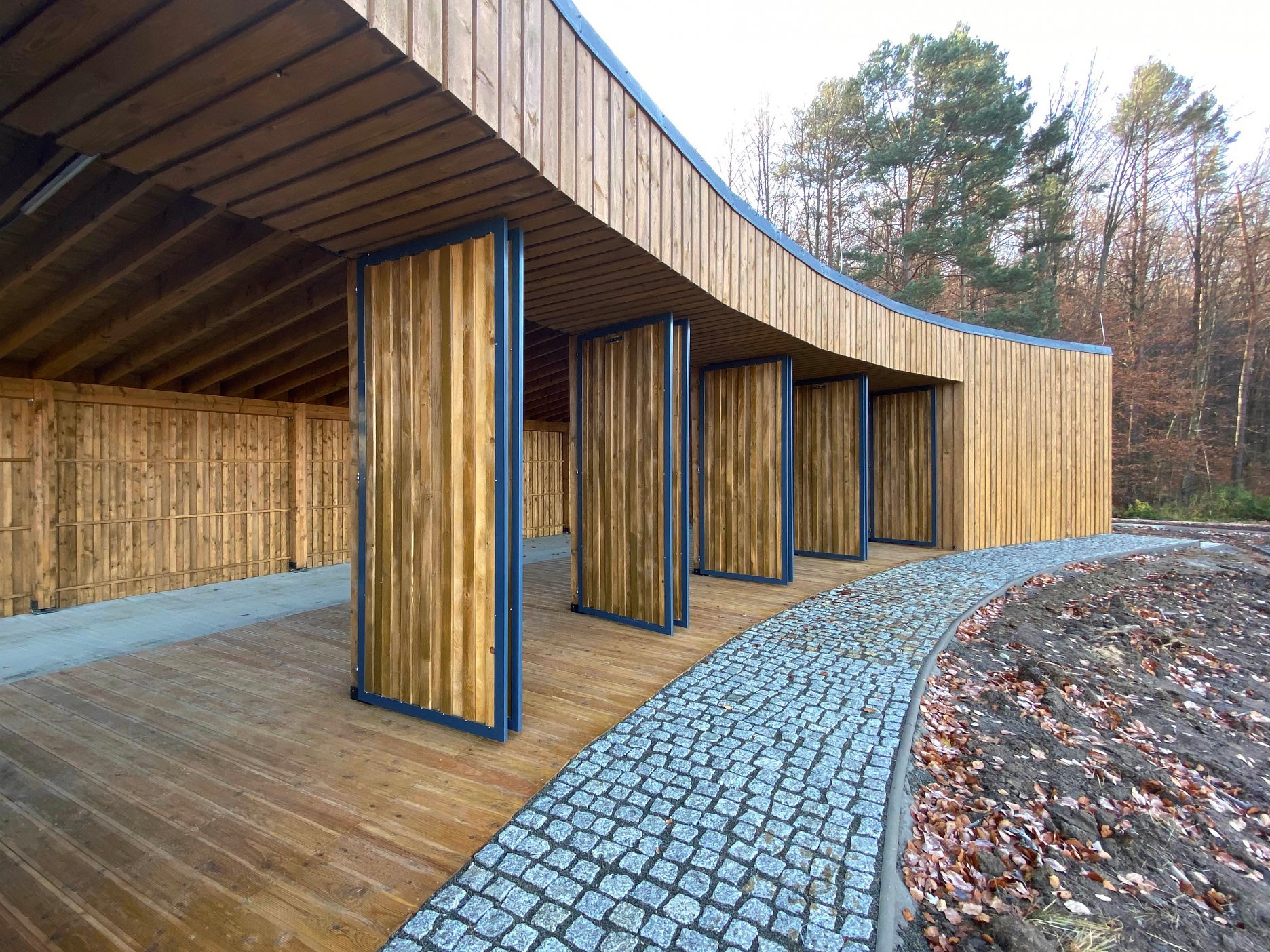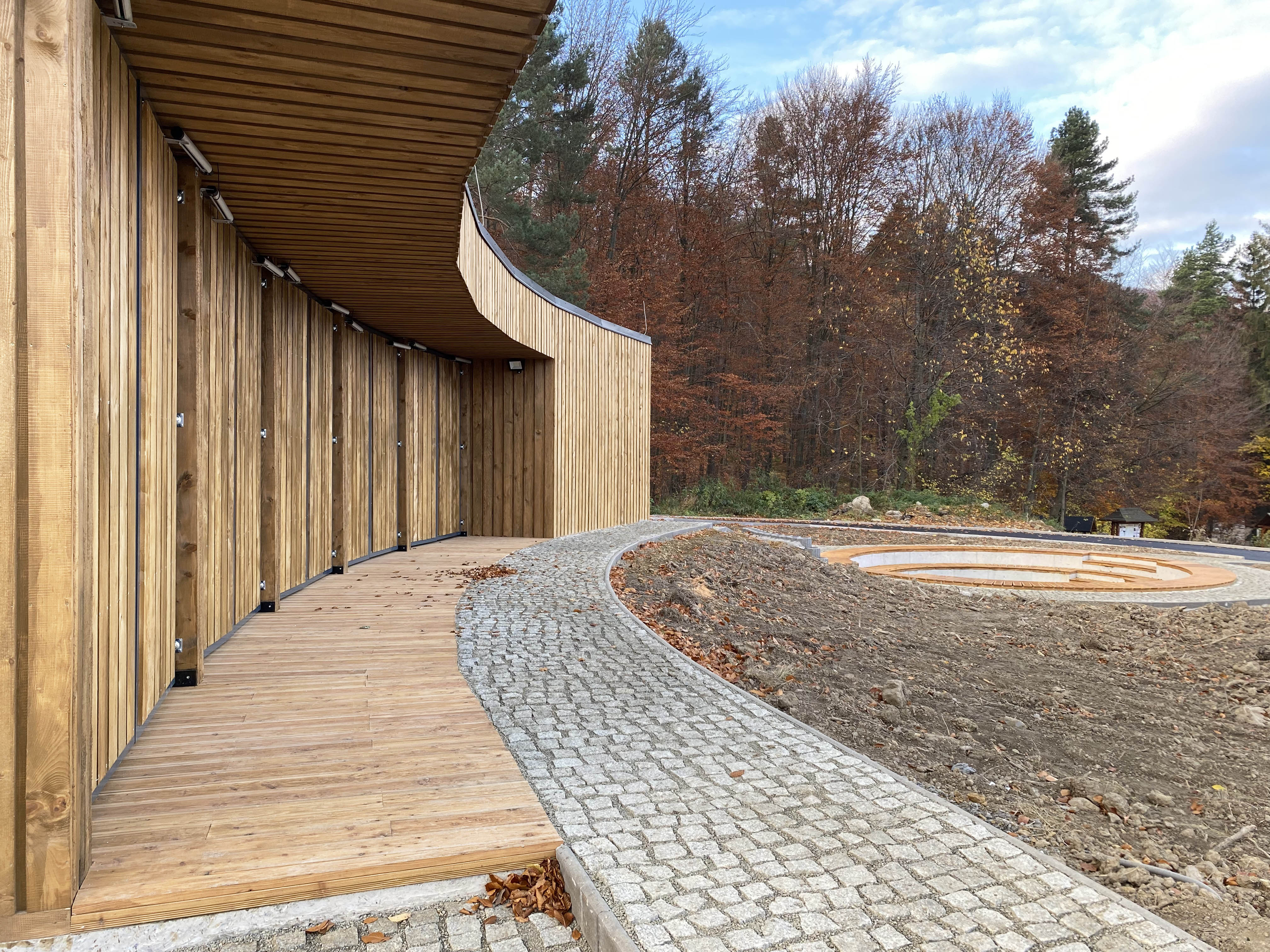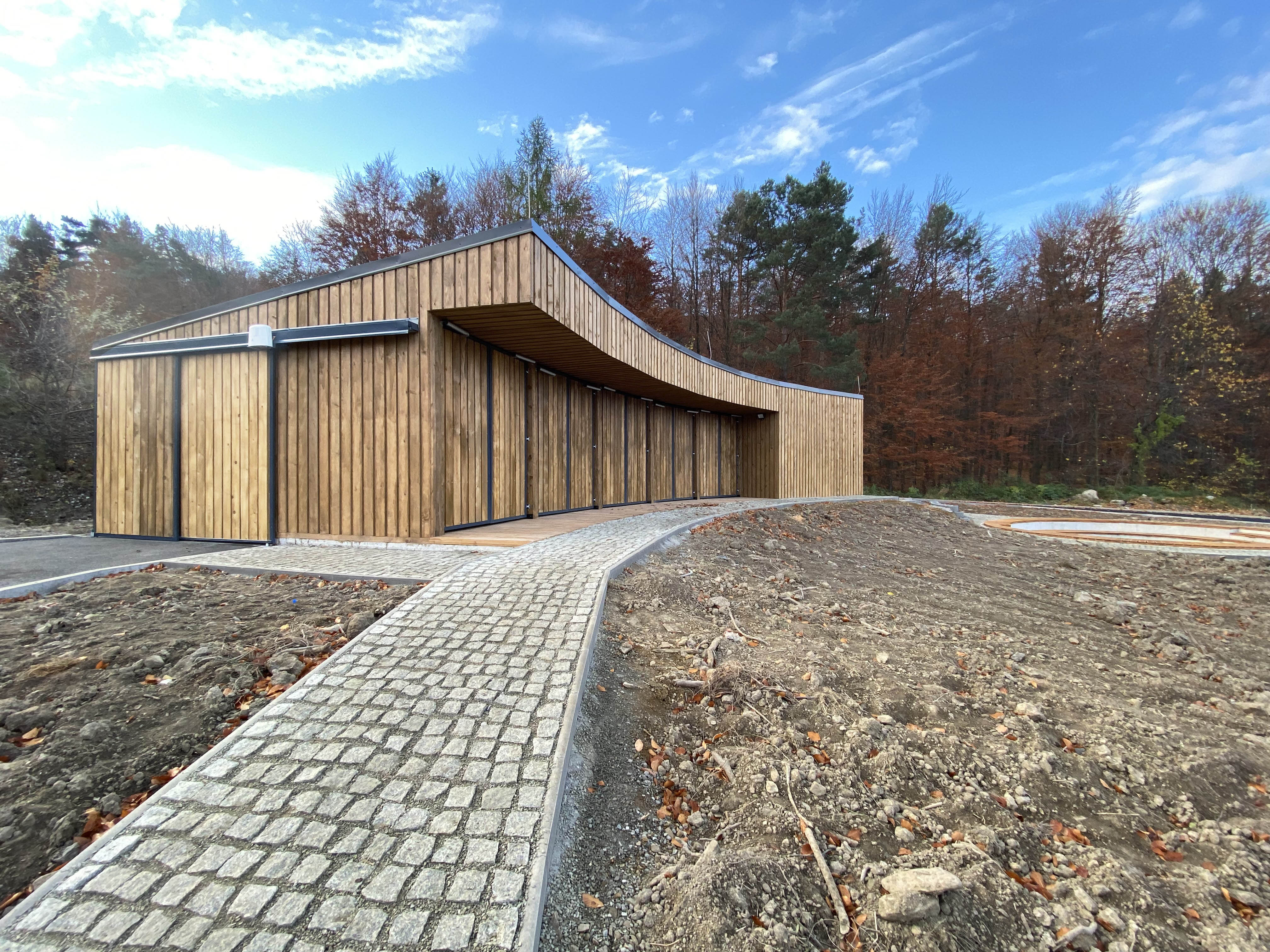 Vertikálne kladený obklad fasády, plynulo pokračuje aj na krídlach otváravých a posuvných dverí. Finálnu vrstvu strechy tvorí ľahká plechová krytina. Uzavreté skladové a hygienické priestory sú obložené keramickým obkladom a keramickou dlažbou.