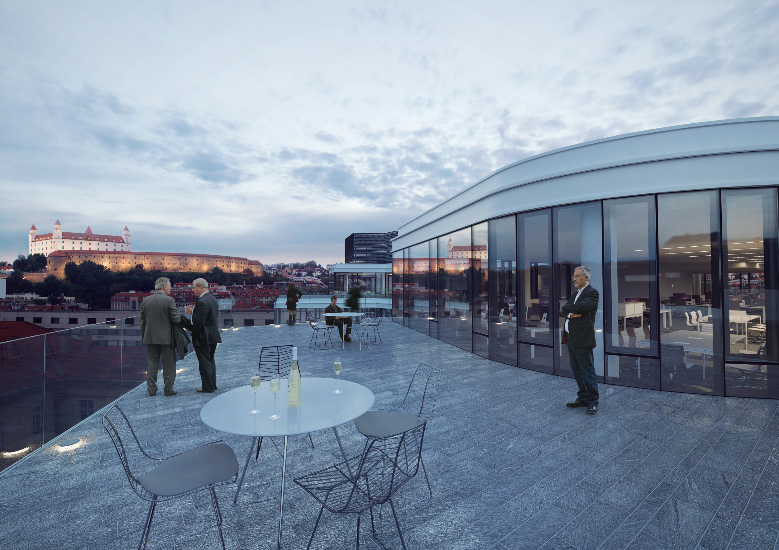 Terasa ktorá sa nachádza na najvyššom podlaží budovy poskytuje výhľad na Primaciálny palác, Katedrálu sv. Martina či Bratislavský hrad, ktoré sú v pešej dostupnosti.