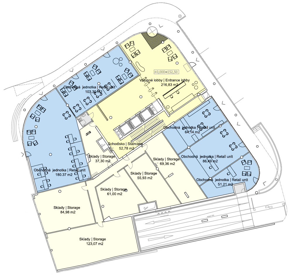 Okrem administratívnych priestorov bude k dispozícii vyše 1 500 m2 priestorov na obchody a na služby, čím projekt výrazne prispeje k občianskej vybavenosti historického centra. Podzemné garáže majú dostatočnú kapacitu 138 parkovacích miest. Objekt je ľahko dostupný, keďže sa nachádza na spojnici hlavných dopravných tepien Bratislavy a len pár minút od diaľničného obchvatu mesta. Parter je oproti hmote budovy ustúpený, čím vzniká čiastočne krytá pešia komunikácia a rozptylový priestor. Návštevníci sú vedení rovno do priestoru hlavného vstupu situovaného v najexponovanejšom rohu budovy. Vertikálne členenie fasády reaguje na hmotu budovy Najvyššieho súdu.