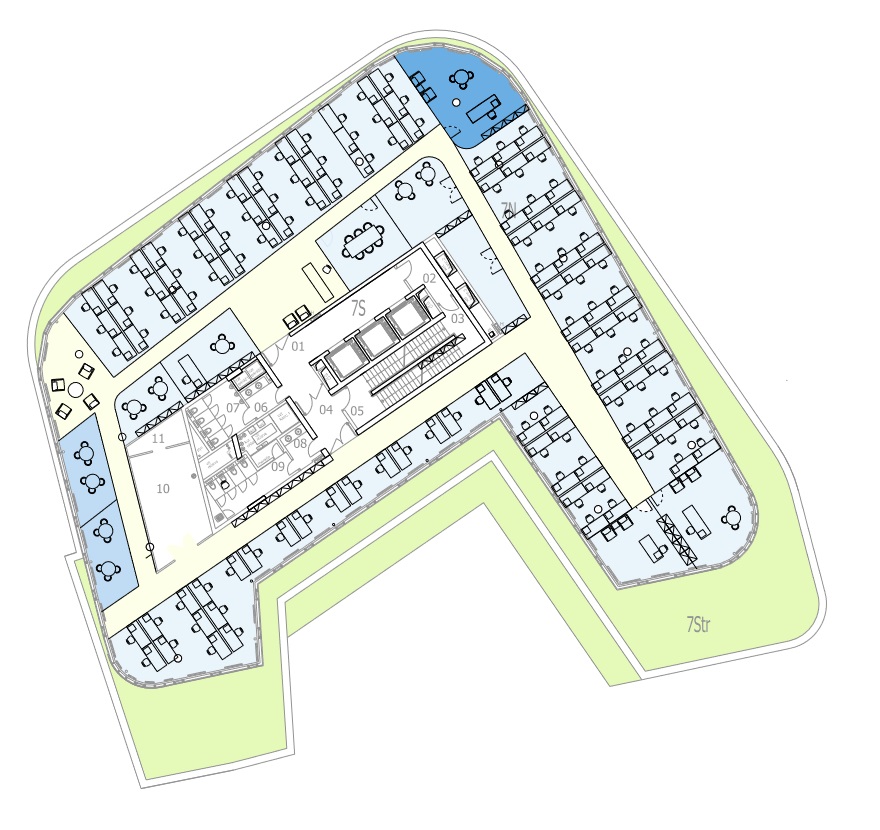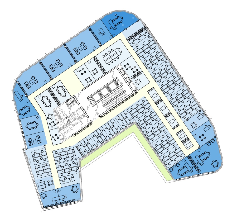 Pôdorys typického podlažia s kancelárskymi priestormi. V centre dispozície je umiestnené kompaktné jadro s vertikálnymi komunikáciami, a sociálnym a technickým zázemím.