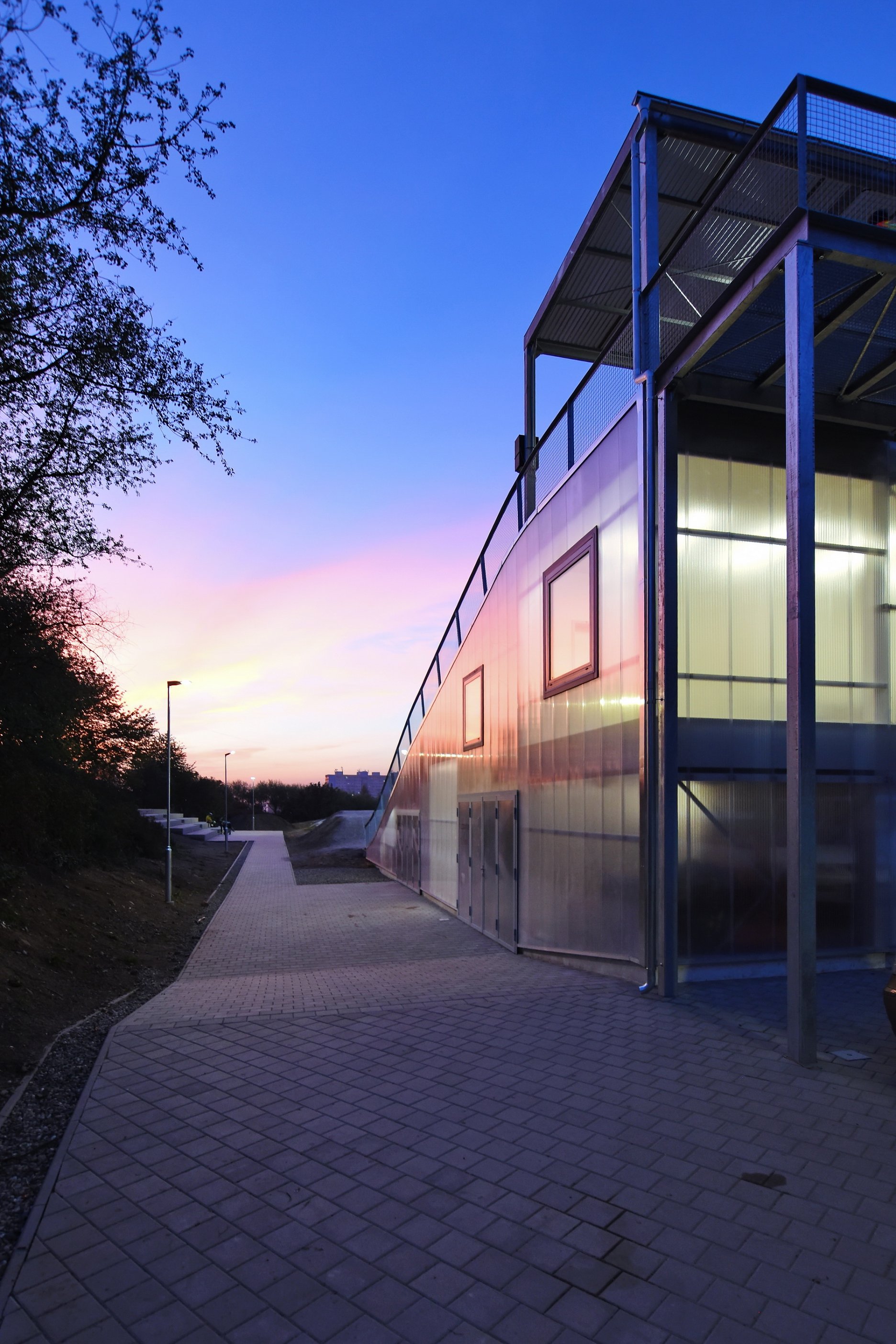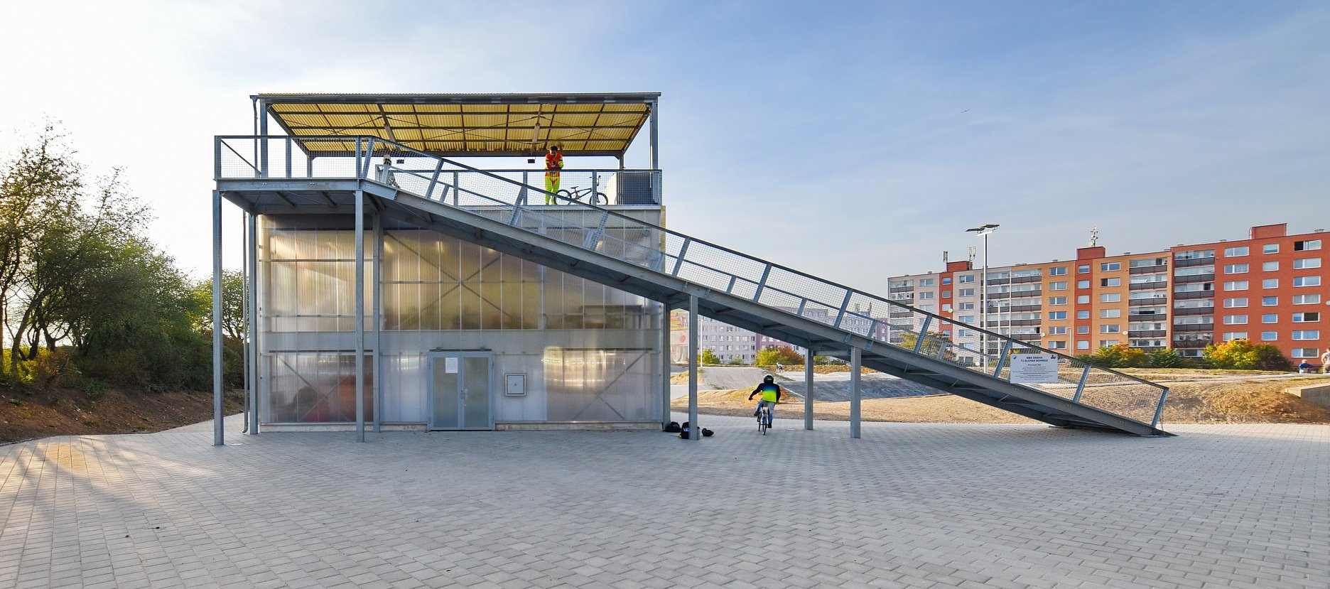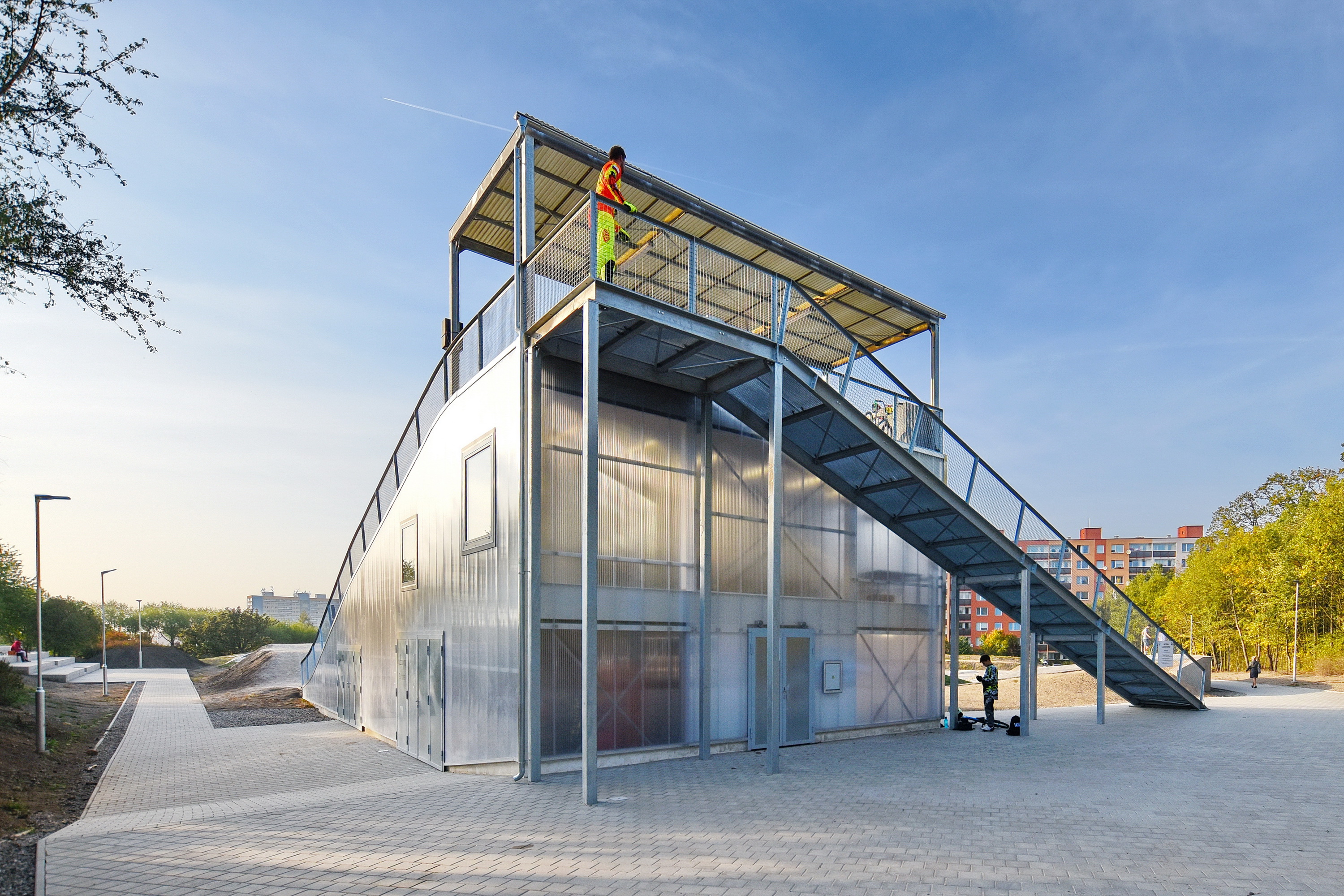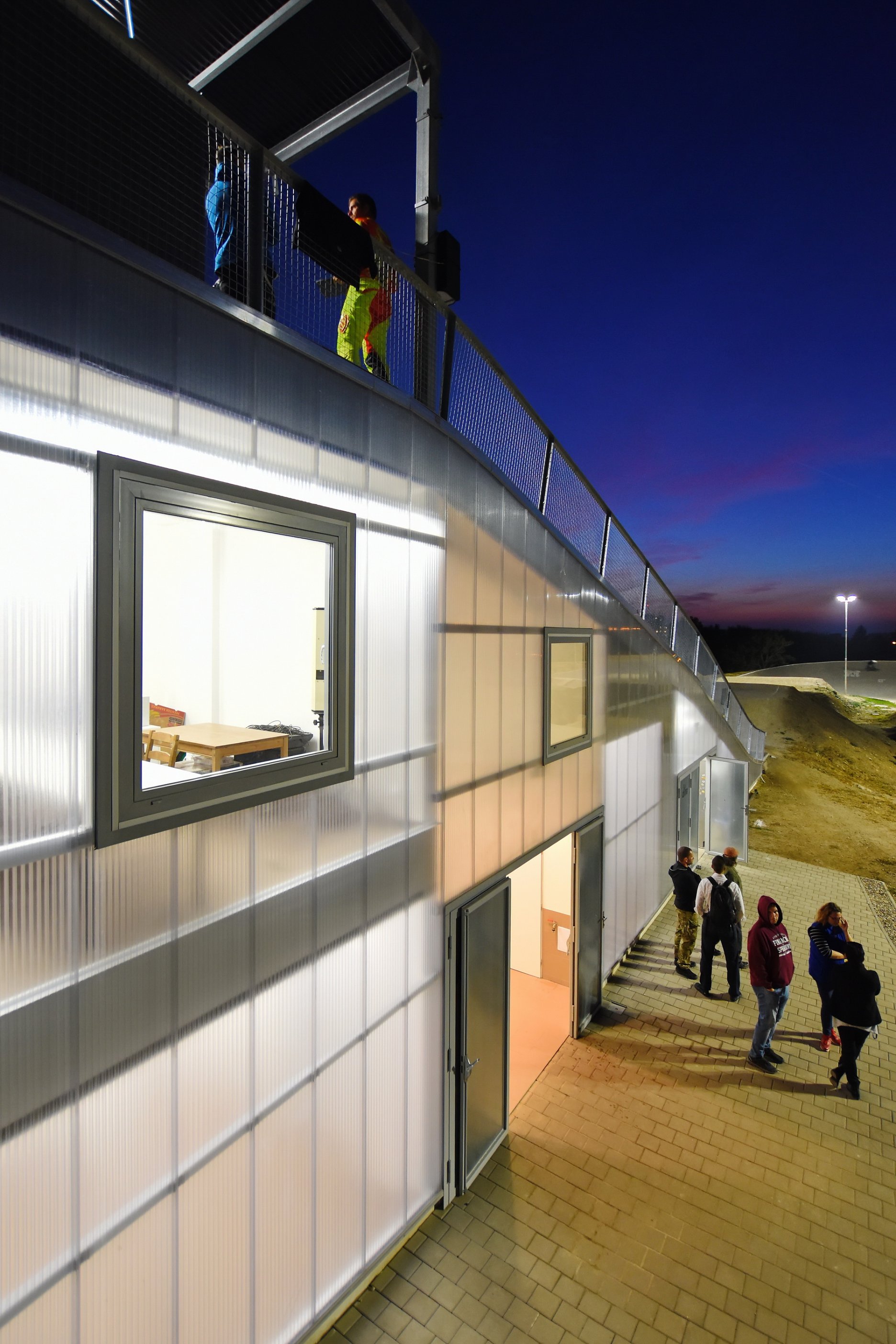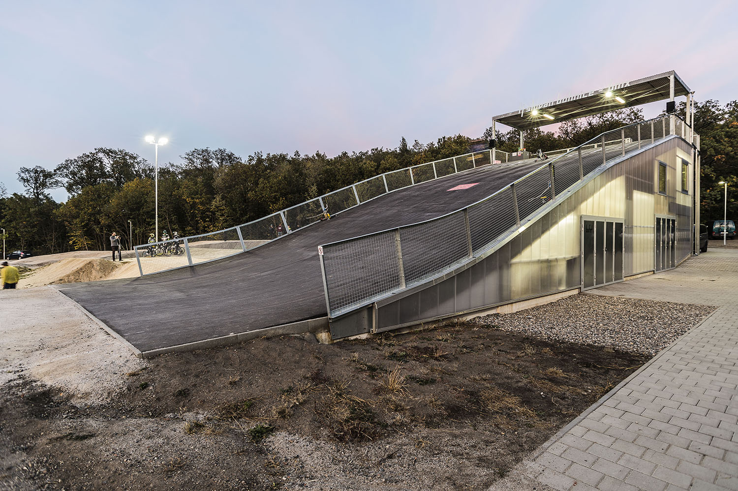 Keďže areál je využívaný len sezónne, obvodové konštrukcie nemusia byť zateplené. Ľahká oceľová montovaná konštrukcia je prekrytá ľahkými polykarbonátovými komôrkovými panelmi. Priestory nie sú vykurované. Cyklisti pri nástupe na štart využívajú nástupnú pororoštovú šikmú lávku.