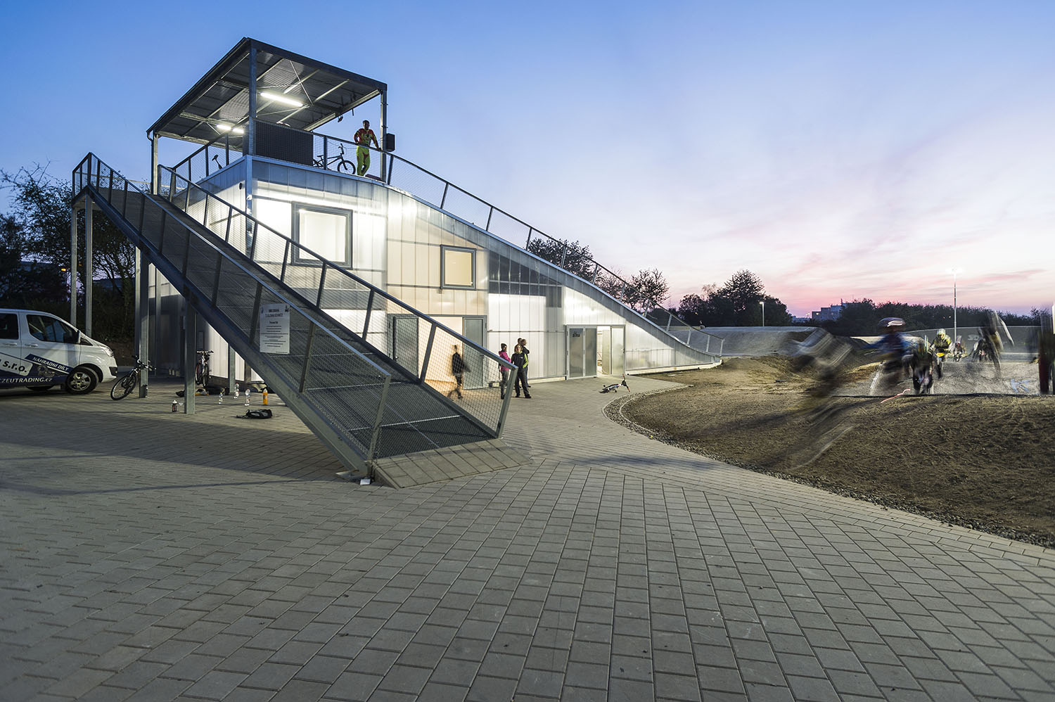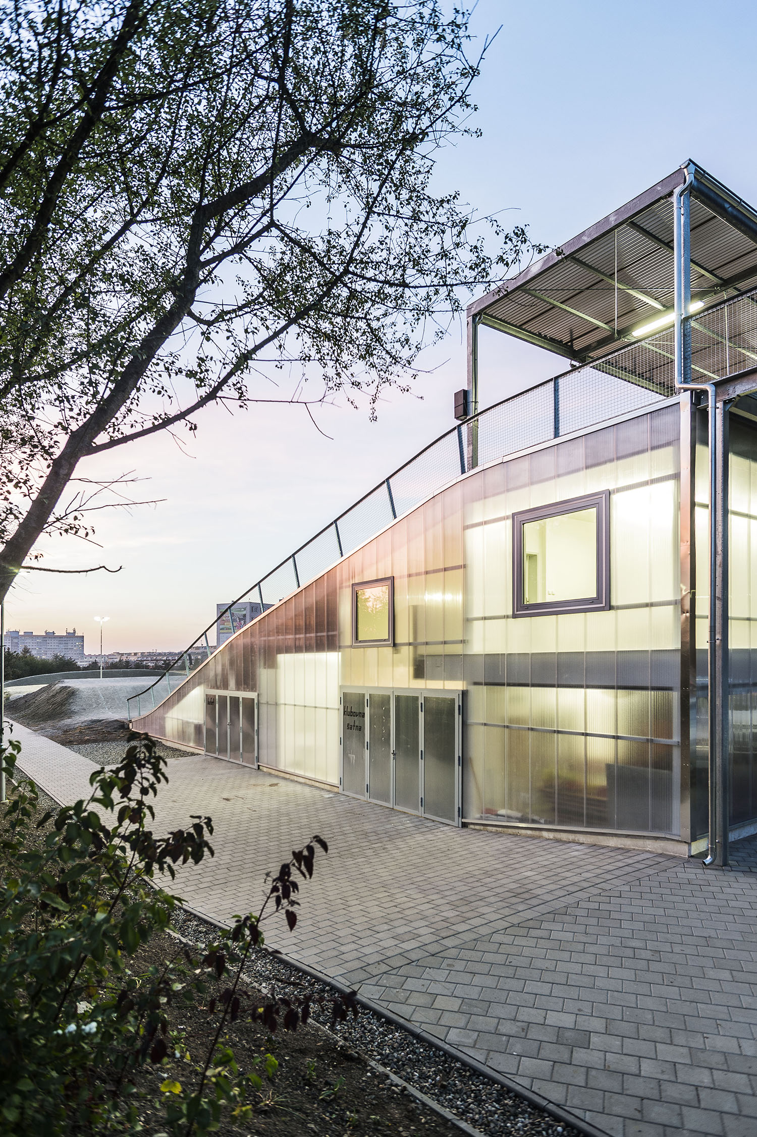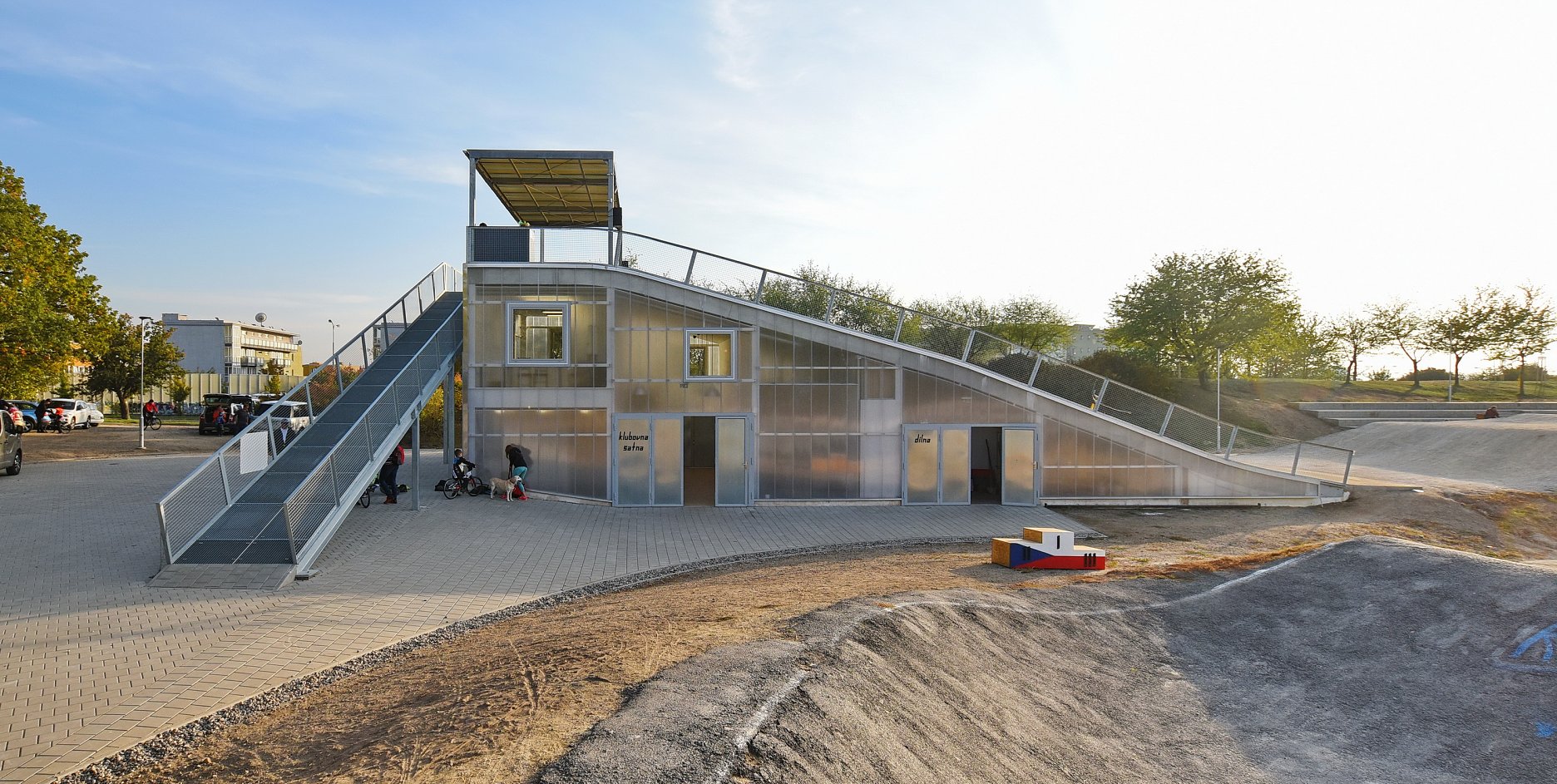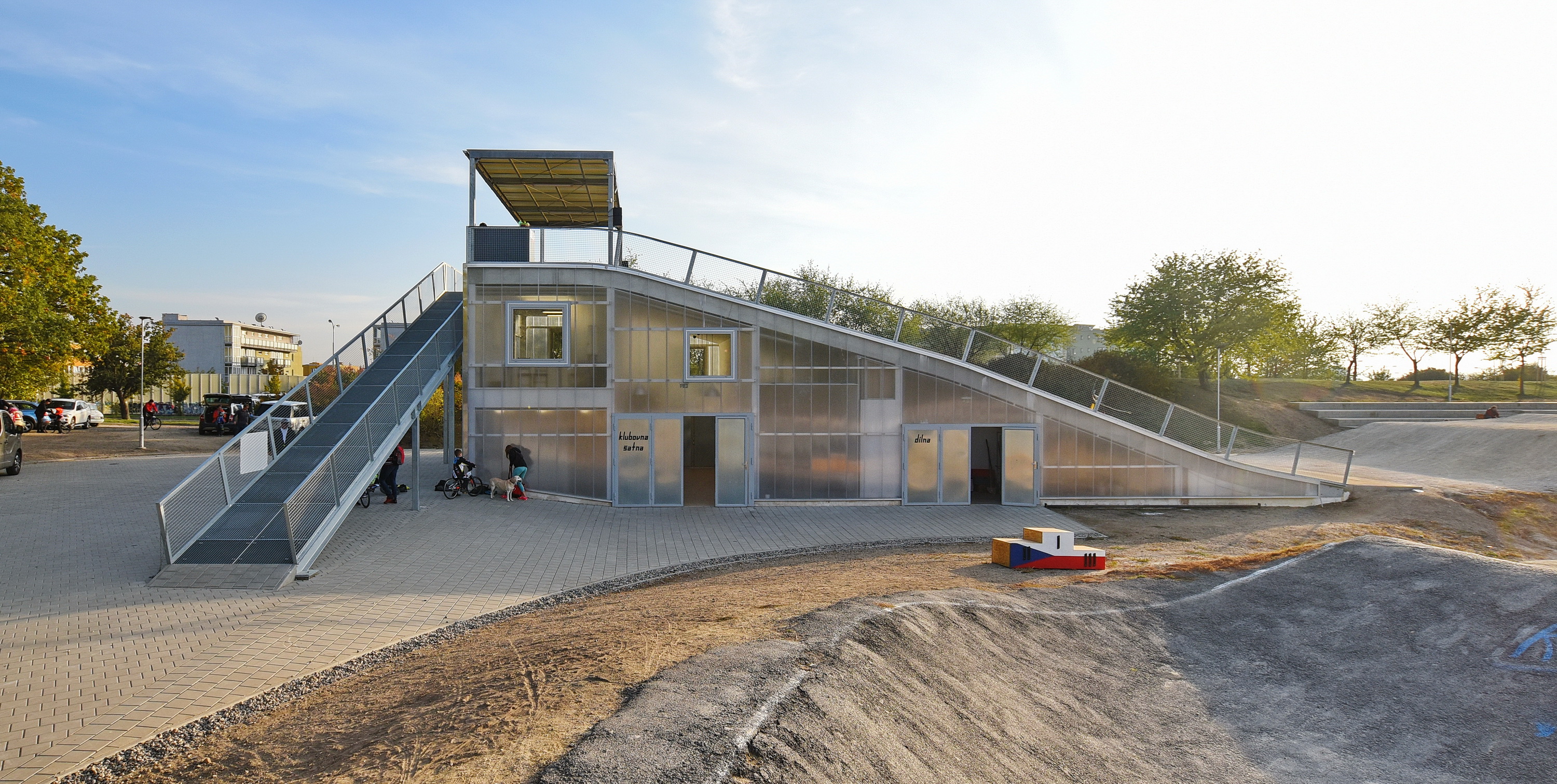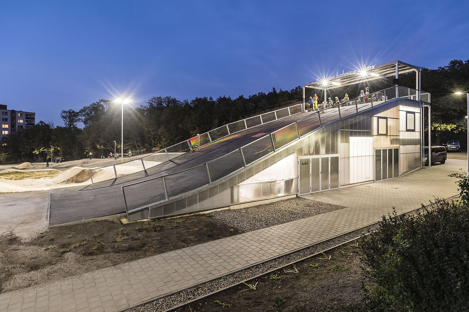 Keďže areál je využívaný len sezónne, obvodové konštrukcie nemusia byť zateplené. Ľahká oceľová montovaná konštrukcia je prekrytá ľahkými polykarbonátovými komôrkovými panelmi. Priestory nie sú vykurované. Cyklisti pri nástupe na štart využívajú nástupnú pororoštovú šikmú lávku.