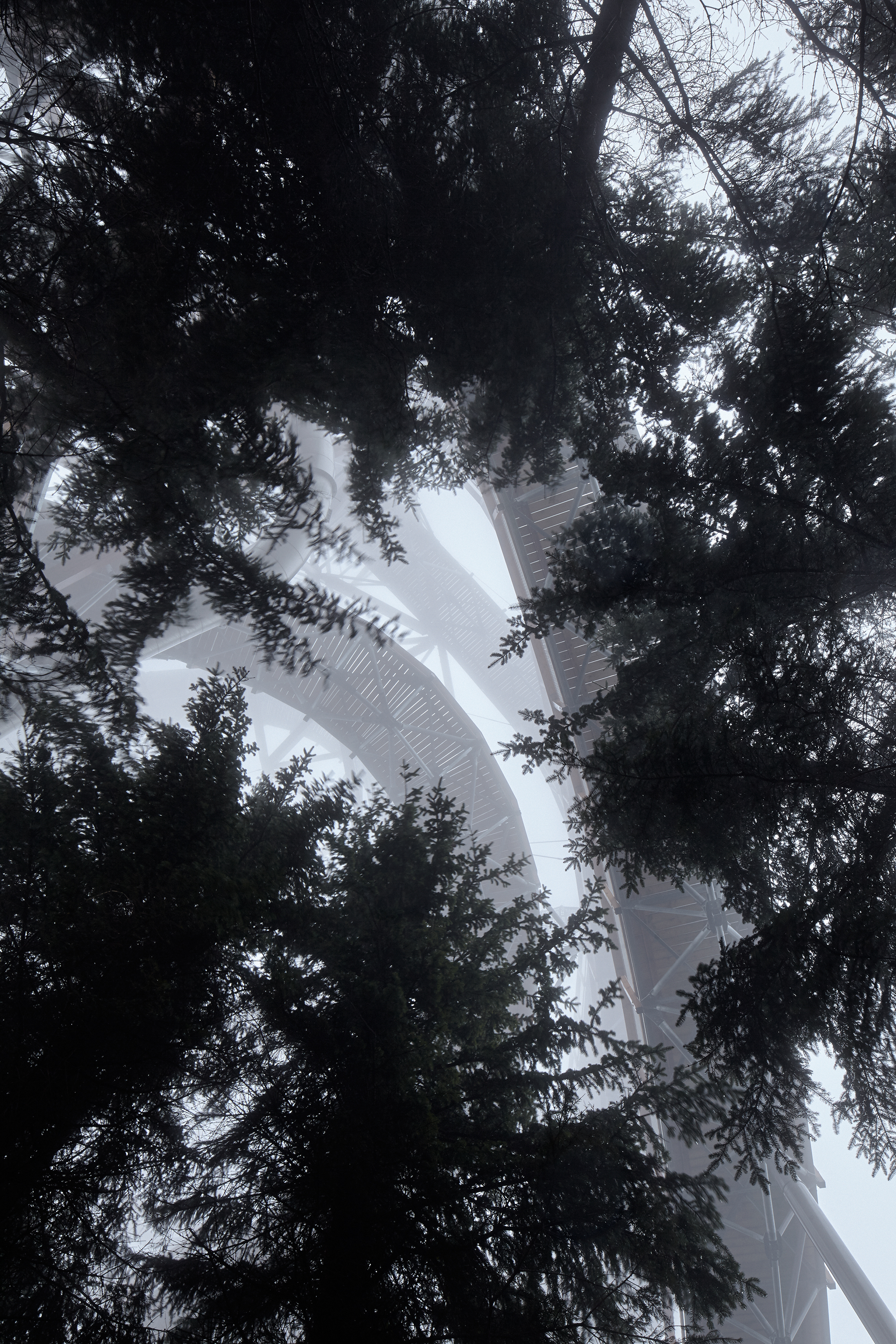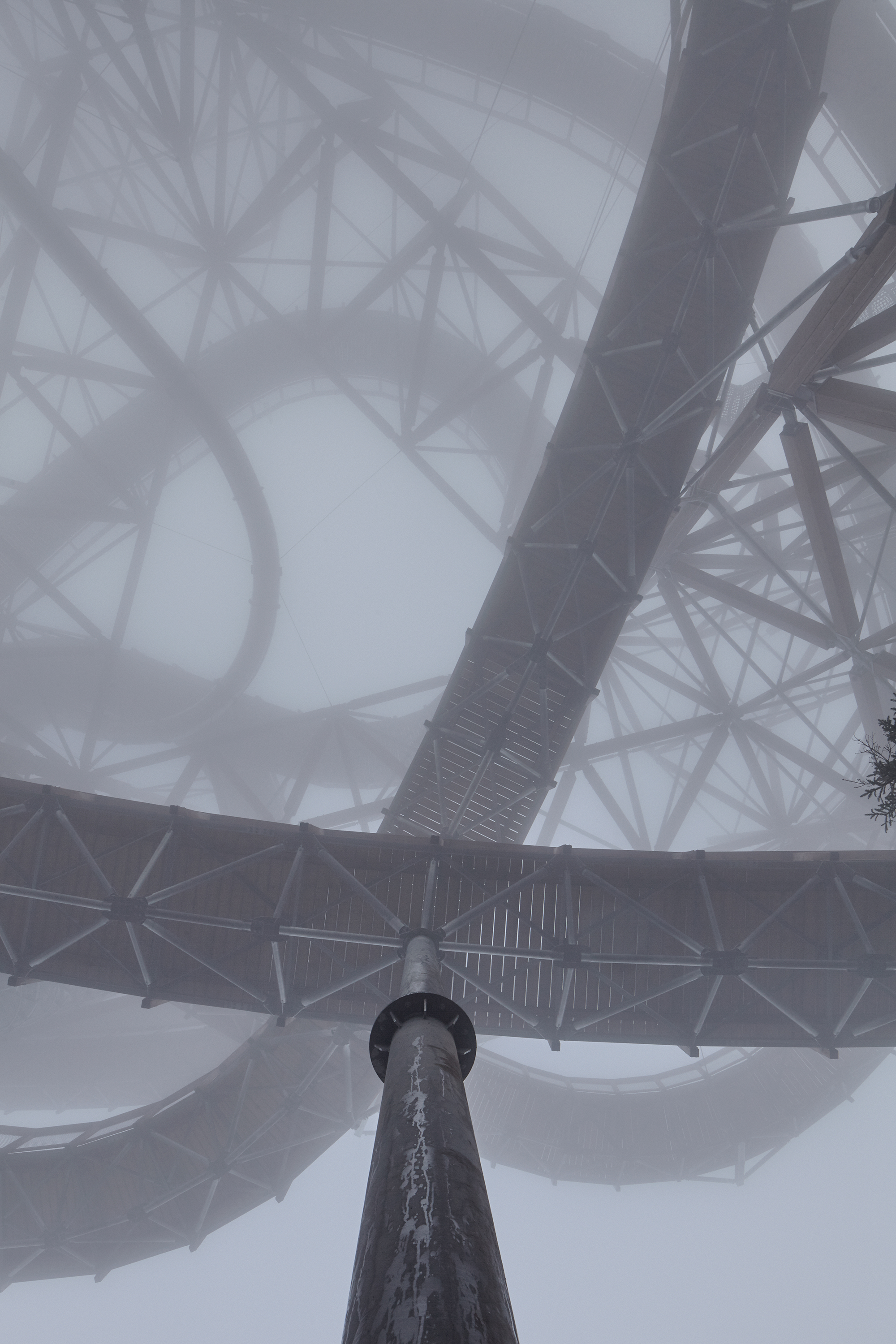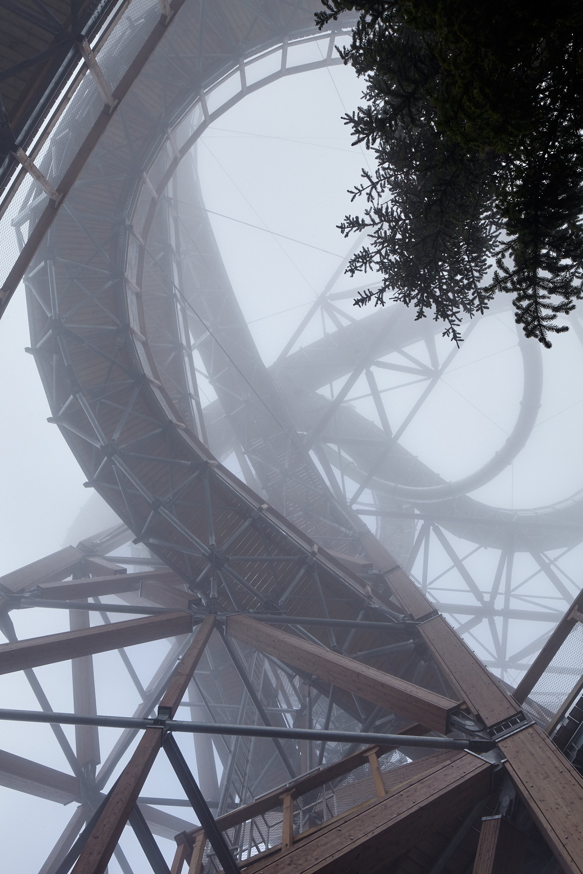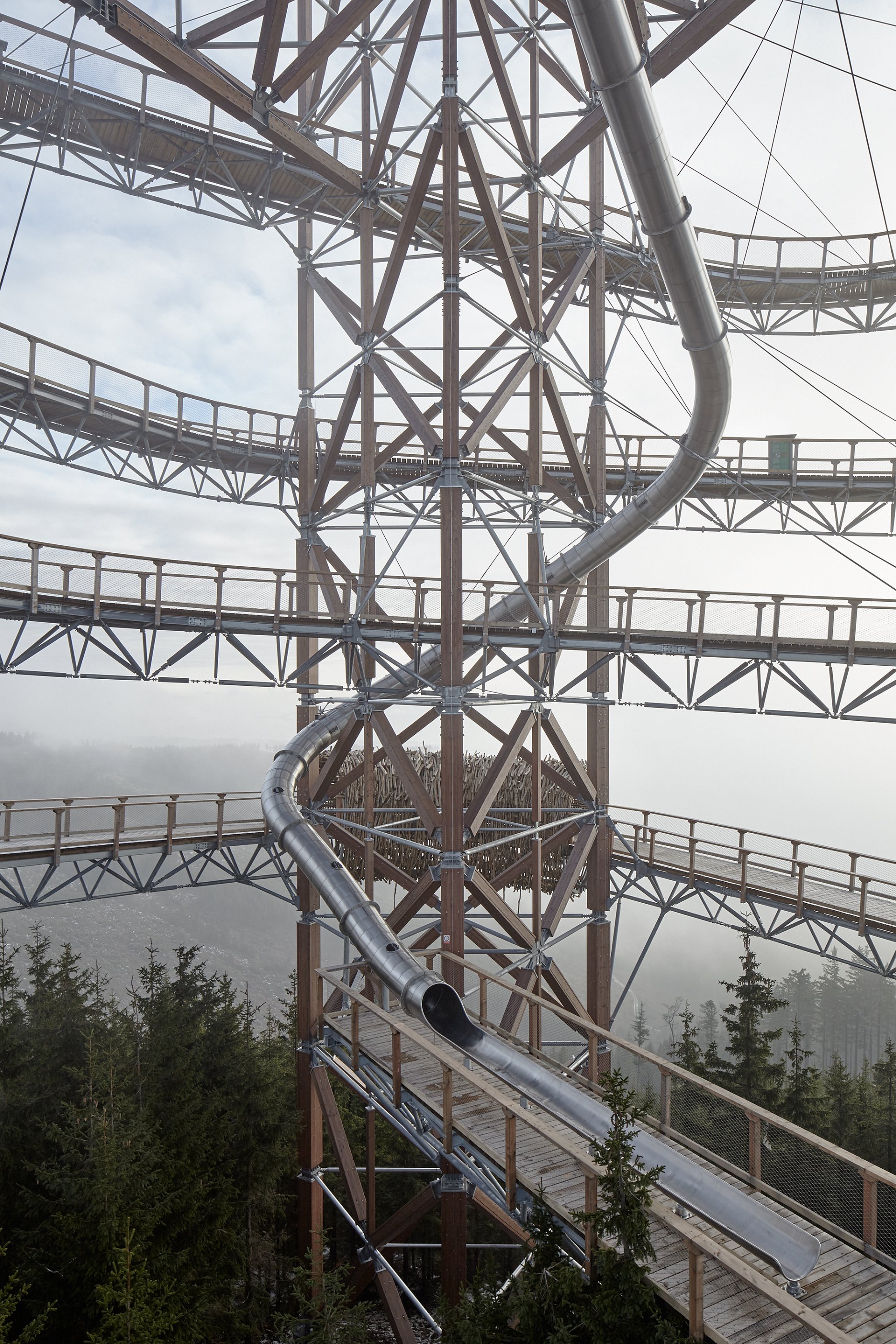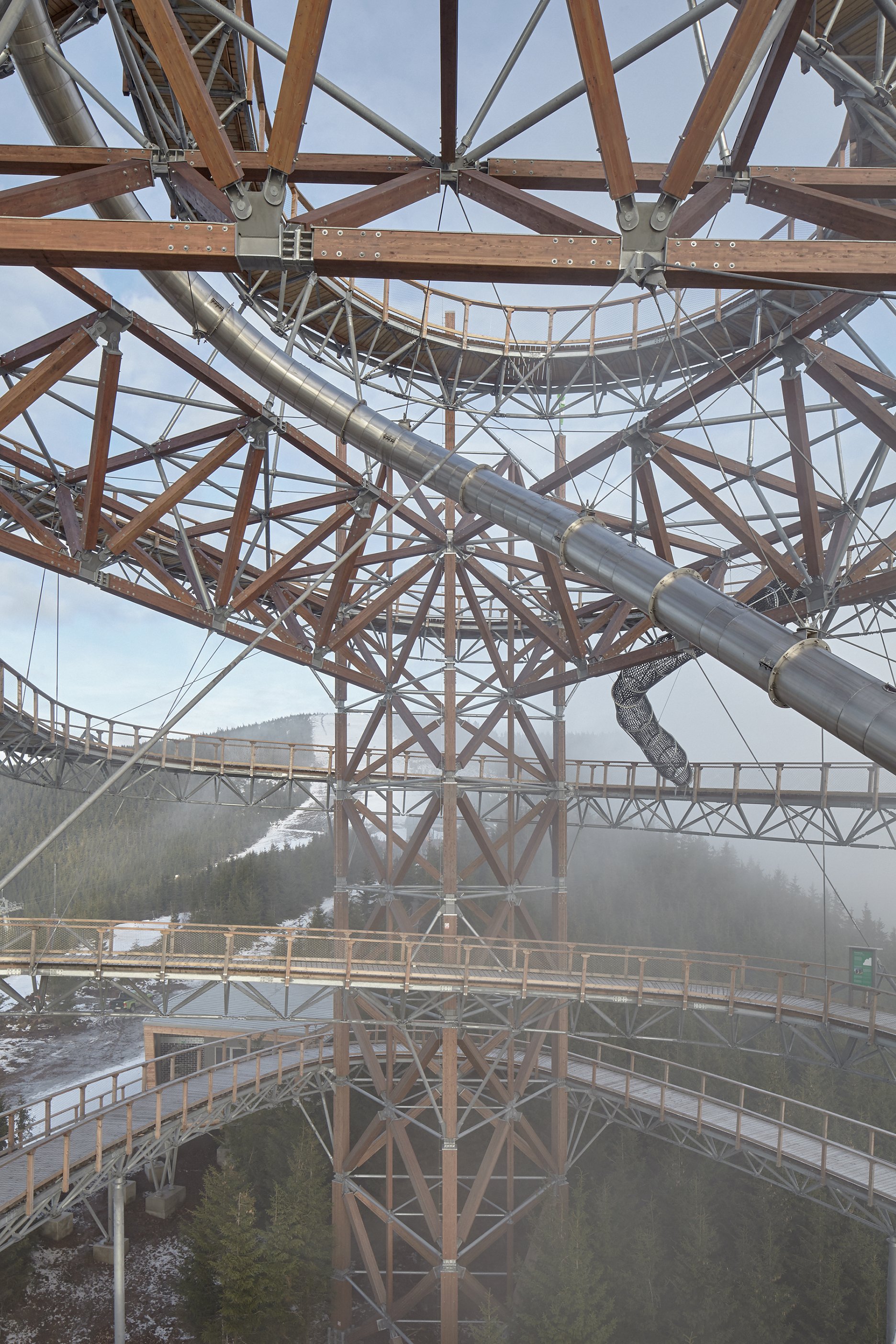 Ľudia sa na vrchol a späť nemusia dostať len jednou trasou. "Stezka v oblacích" ponúka návštevníkom celý rad nevšedných zážitkov a s týmto zámerom bola tiež podľa projektu architekta Zdeňka Franka postavená. Na vežu, ktorá nie je pravidelnou špirálou, sa stúpa po chodníkoch v niekoľkých úrovniach. Medzi poschodiami sa dá prestúpiť takzvanou pavúčou sieťou. Pri ďaľšej adrenalínovej atrakcii "kvapka" ľudia vstúpia na sieť mimo os stavby a pod sebou majú hĺbku 55 metrov. Tobogán pre cestu dole bude v zime kvôli hrozbe zrážania vlhkosti z bezpečnostných dôvodov uzatvorený.