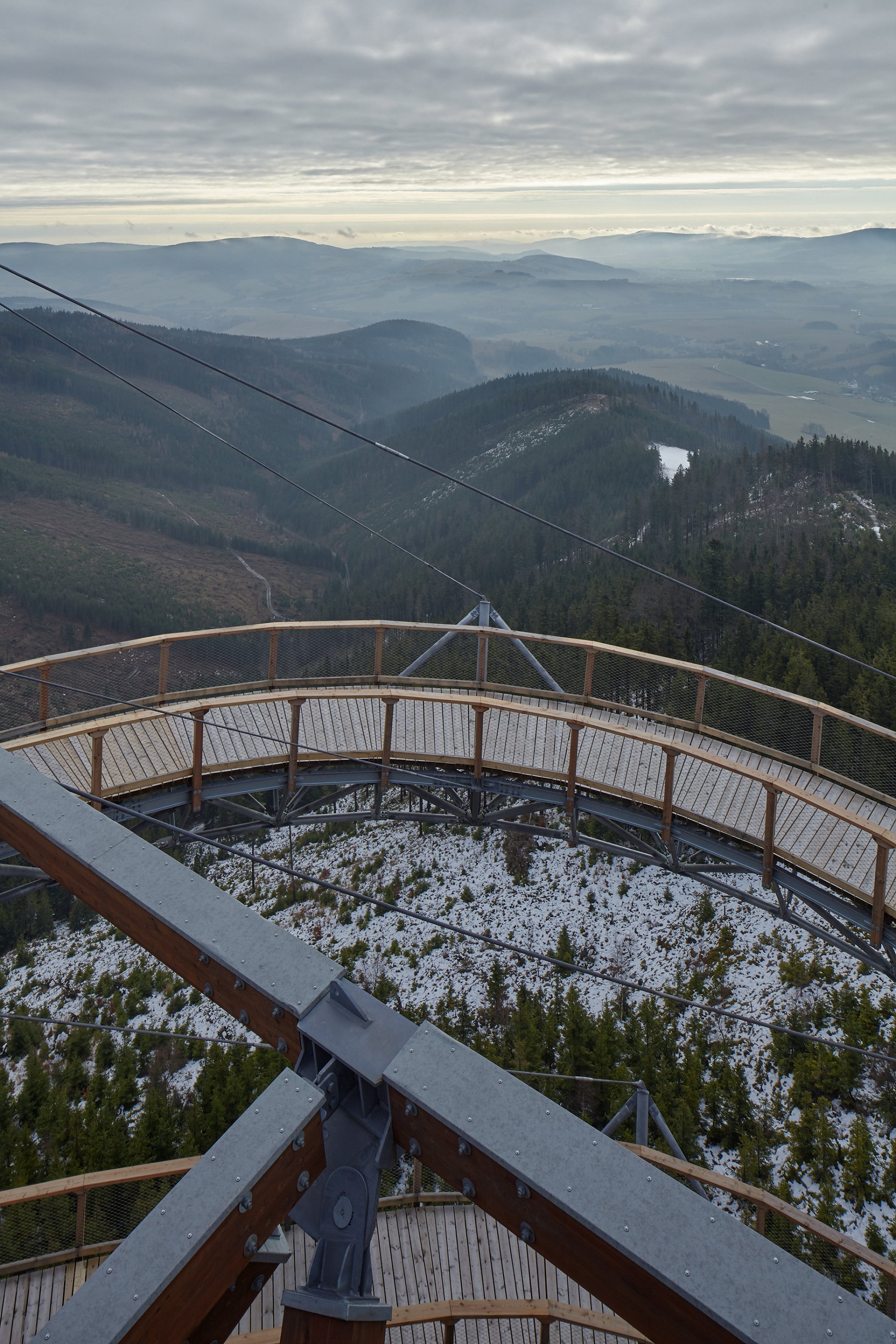 Konštrukcia zo smrekovcového dreva a oceľových prvkov, ktorá výrazne prevyšuje okolitý smrekový les, je spleťou rôzne sa prelínajúcich chodníkov v celkovej dĺžke 750 metrov. Cesta je bezbariérová, na vrchol sa pohodlne dostanú aj ľudia na invalidných vozíkoch, aj s kočíkmi. Odvážlivci môžu dole zísť 101 metrov dlhým tubusom tobogánu. Z vrcholu možno vidieť masív Králického Sněžníku s údolím rieky Moravy. V prípade dobrého počasia sa dá dohliadnuť až na hlavný hrebeň Jeseníkov, Suchý vrch a Krkonoše so Sněžkou.