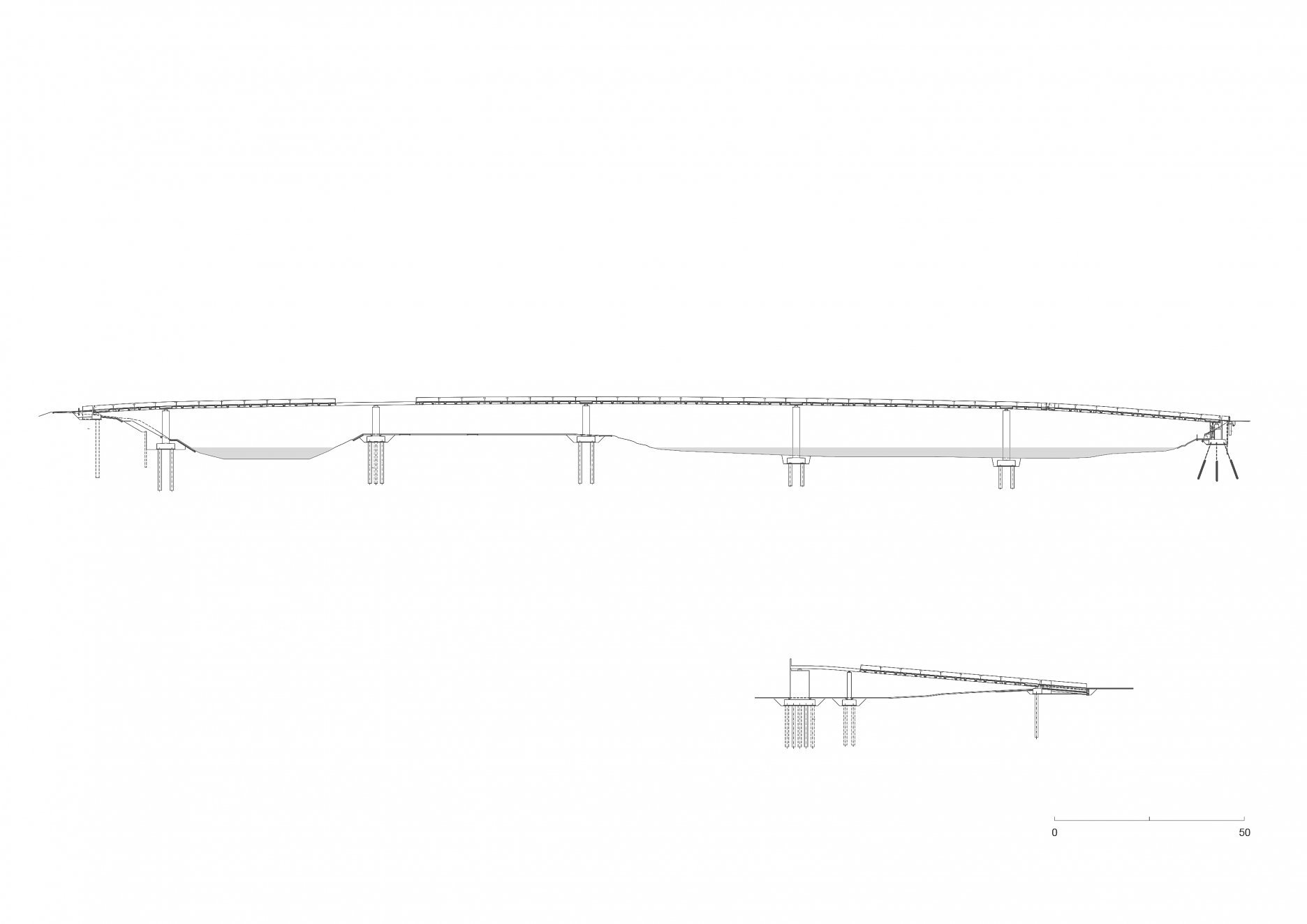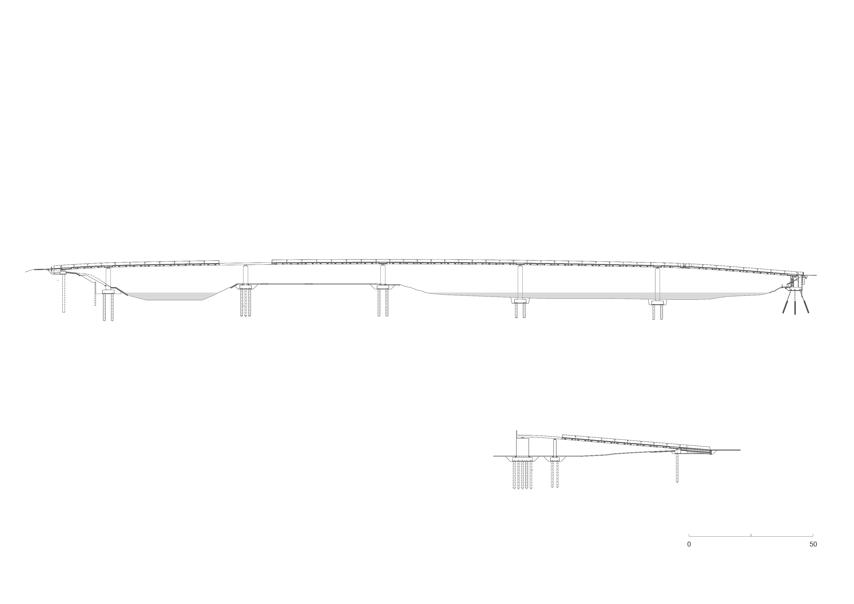 Hlavnú nosnú konštrukciu mosta tvorí spojitý nosník s pozdĺžnym predpätím a priečnym rezom v tvare písmena H. Plnostenné bočné parapetné nosníky zvierajú dosku mostovky, ktorú vystužujú priečne rebrá. Segmentovú konštrukciu mosta tvorí celkom 57 prefabrikátov.