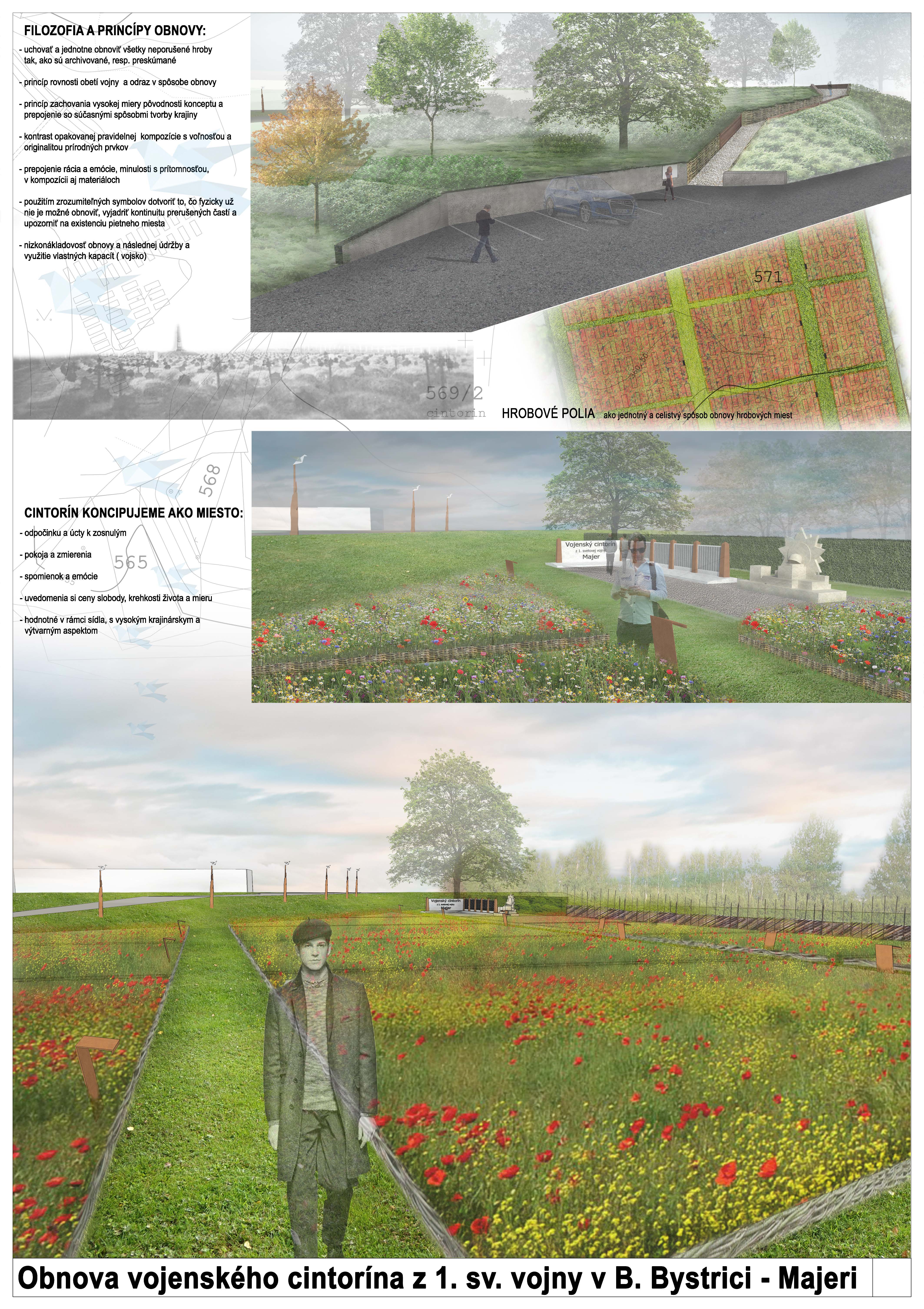 Návrh predstavuje odlišný pohľad na spôsob obnovy areálu cintorína ako ostatné súťažné návrhy. Autori sa rozhodli vložiť do priestoru „novú životaschopnú vrstvu“ a to „bez zničenia pôvodných vrstiev. “ Pozdĺž západnej hranice pôvodného vojenského cintorína navrhli lineárne MÓLO (spevnená mlatová plocha), ktoré vnáša do územia novú organizáciu a objekt MONUMENTu, ktorý okrem toho, že sám o sebe je pamätníkom dokumentujúcim a pripomínajúcim históriu cintorína, „prináša do existujúcej periférie“ aj „nadhľad.“ MONUMENT v sebe spája funkcie pietneho miesta, náhrobnej dosky s menami pochovaných, kaplnky, vyhliadky, prezentačnej steny, zázemia, aj výrazného symbolu miesta - viditeľného z okolia. MONUMENT je veža 10 m vysoká a 2 m úzka, ktorú tvorí oceľová konštrukcia s cortenovými stenami (corten - patinovaná, počasiu odolná oceľ), na ktorých sú „vyrezané“ údaje rokov a mien. Autori sa vyhli akýmkoľvek stavebným zásahom v miestach hrobových polí a navrhli po odstránení náletovej zelene realizovať LÚKU osiatu lúčnymi kvetmi. LÚKA chráni vrstvu hrobov pod sebou a súčasne „dokáže v sebe integrovať aj možnosť lokálnych sond a obnovení hrobov.“ Forma označenia hrobových miest s nedominantným „jednotným systémom označenia hrobov cortenovými doskami osadenými pri hlave hrobu“ je zdokumentovaná v textovej časti návrhu. Pre prístup do areálu autori navrhujú „úpravu krajnice existujúcej cesty rozšírením o chodníkový pruh a pohotovostné parkovanie“ pozdĺž okraja južného civilného cintorína. V ďalšej fáze uvažujú s realizáciou vstupu a parkovania smerom od elektrárenského kanála.