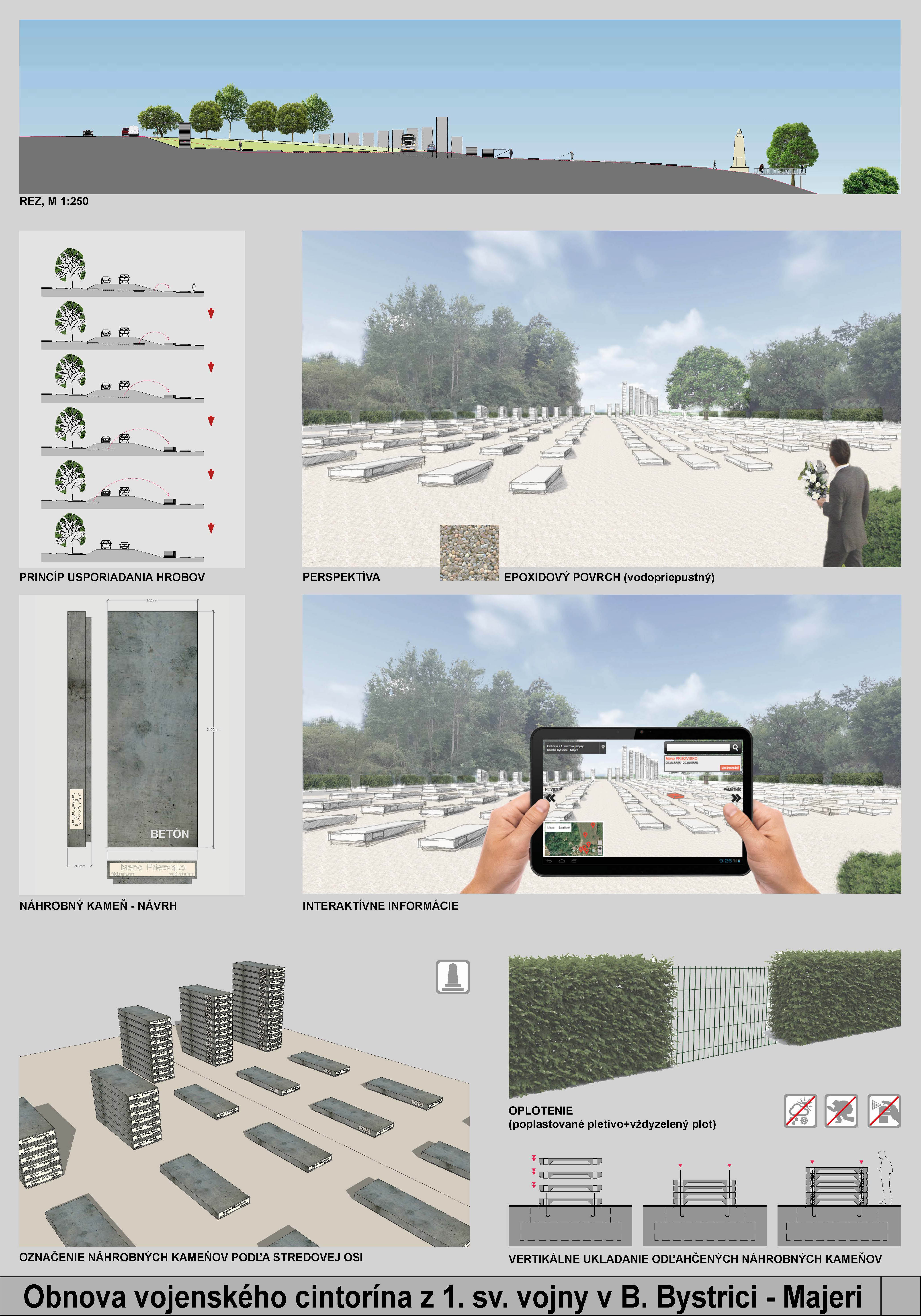 Porota oceňuje moderné a progresívne riešenie. Návrh úpravy hrobových miest ich zdvihnutím z úrovne terénu, do korténových plechových obrúb, je bez potreby akýchkoľvek ďalších doplňujúcich prvkov (oplotenie cintorína, ústredný pamätník) plne dostačujúcou, priamočiarou a jednoznačnou prezentáciou cintorína. Za jeden z najväčších kladov návrhu pokladáme zaujímavý a pútavý motív rastra vystupujúcich hrobových miest prechádzajúcich cez cestu v pôdoryse pôvodného areálu. Vynikajúce je vtiahnutie okoloidúcich automobilistov do deja. Cintorín je neprehliadnuteľný. Upozorňuje na seba každého okoloidúceho, núti ho spomaliť a zamyslieť sa. Aj nad necitlivou intervenciou pri stavbe cesty v minulosti, priamo na hroboch pochovaných i nad neúctou k ľuďom a k histórii. Hrobové miesta premietnuté do vrstvy vozovky ešte umocňujú pripomienku na význam lokality. Návrh má vhodne riešený dopravný prístup do areálu, parkovanie aj prístup pre imobilných z južnej strany od elektrárenského kanála.