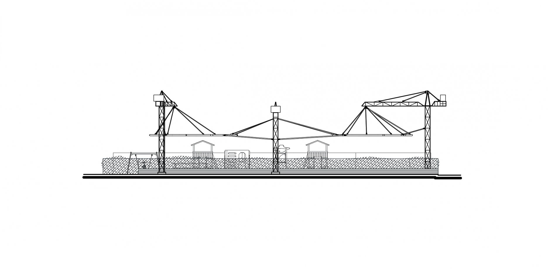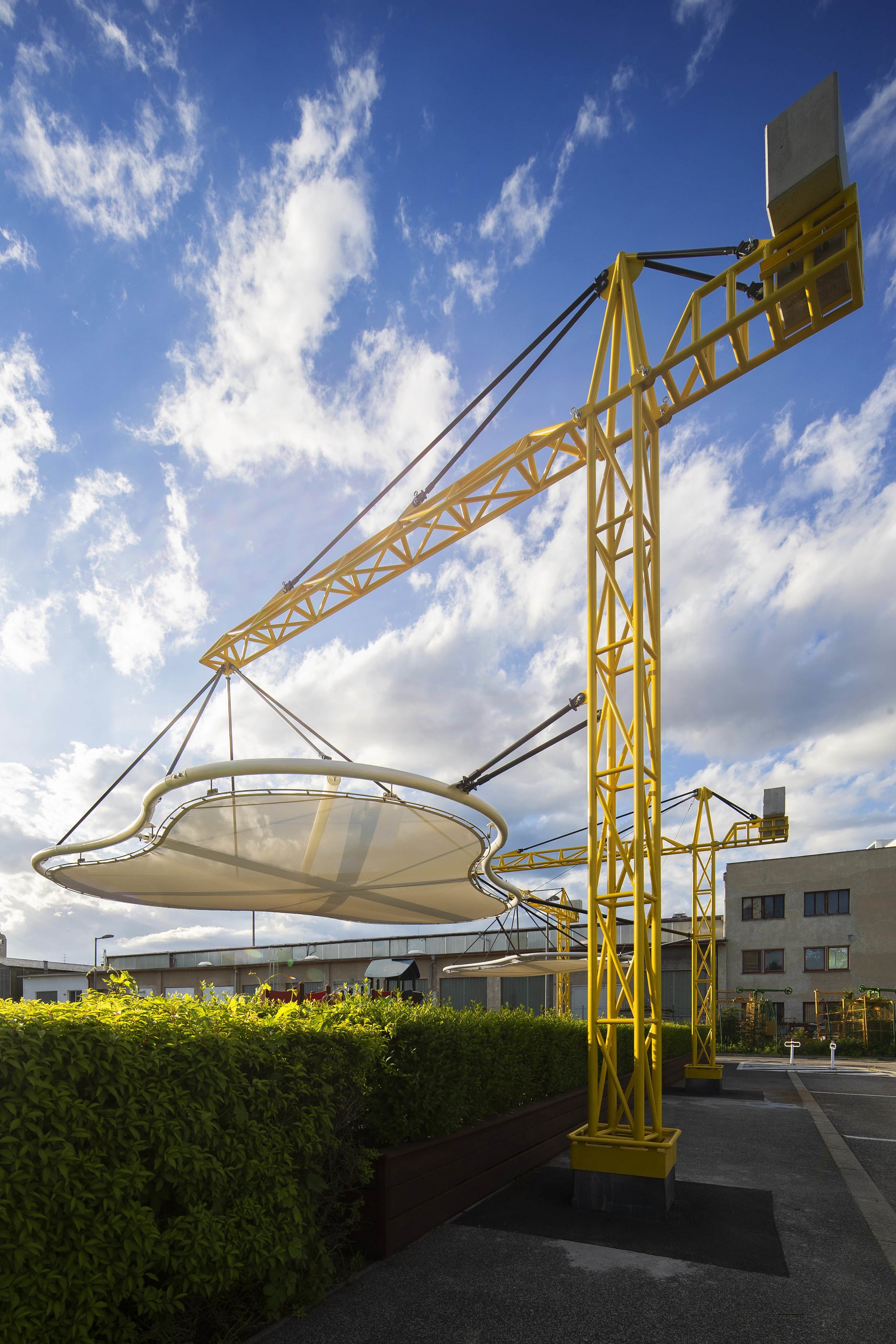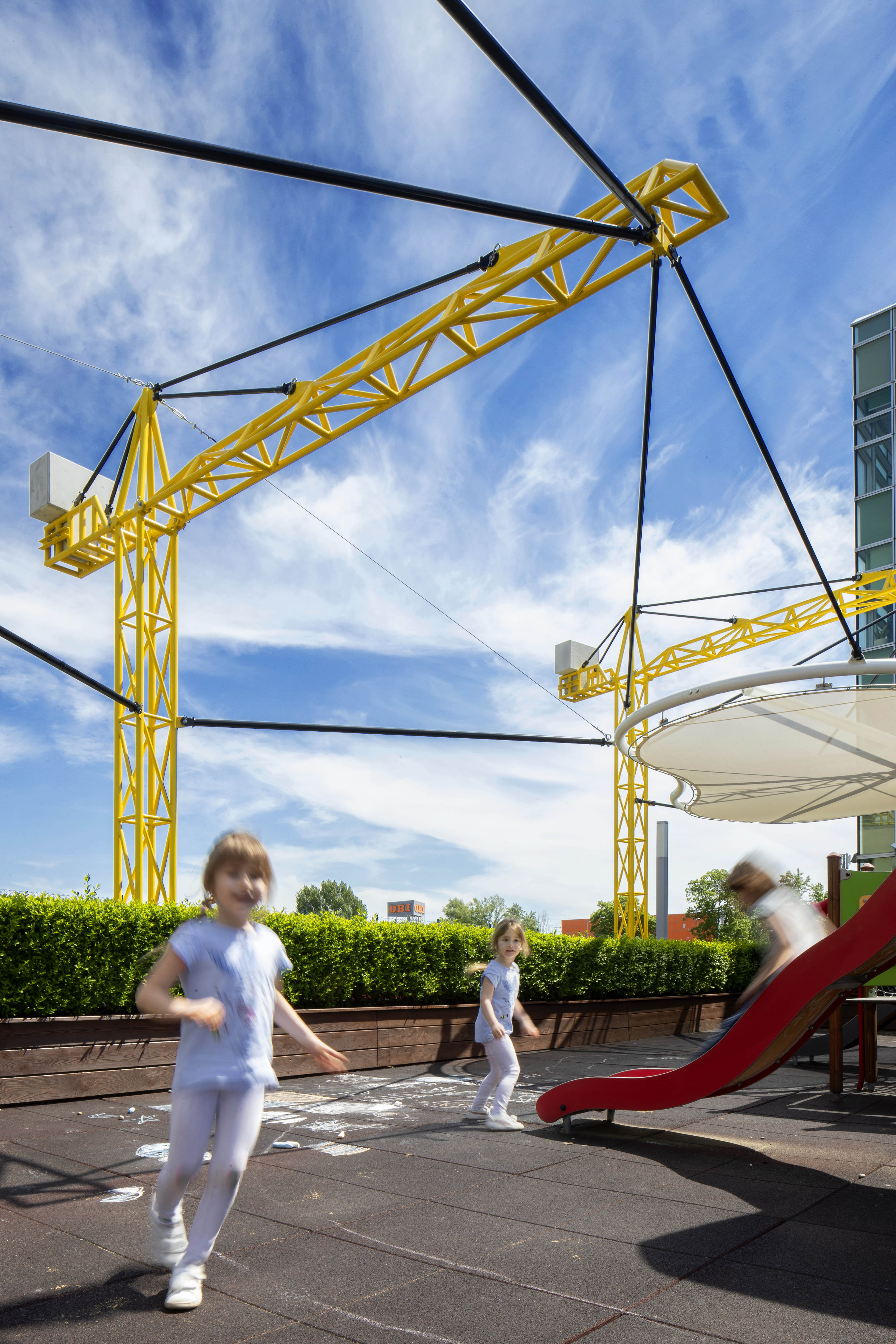 Priestor na pôdoryse podzemného parkoviska, s typovými hernými prvkami, neumožňuje rast vysokej zelene. Tienenie vonkajších okrajov ihriska preto zabezpečuje trojica priehradových žeriavov, ktoré nesú oválne oceľové rámy s napnutou sieťovou membránou. "Žeriavy nesú obláčiky". Funkčné architektonické prvky odkazujú na činnosť klienta a zároveň slúžia ako pútač pre okoloidúcich. Všetky konštrukcie sú fixné, bez možnosti pohybu či otáčania.
