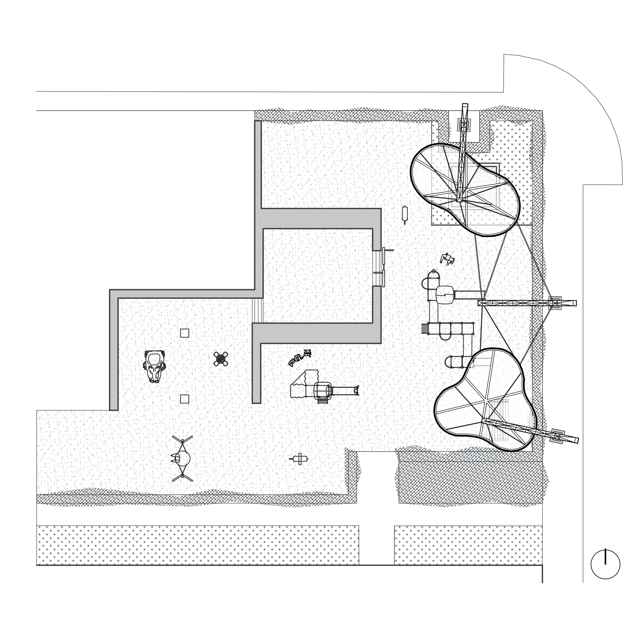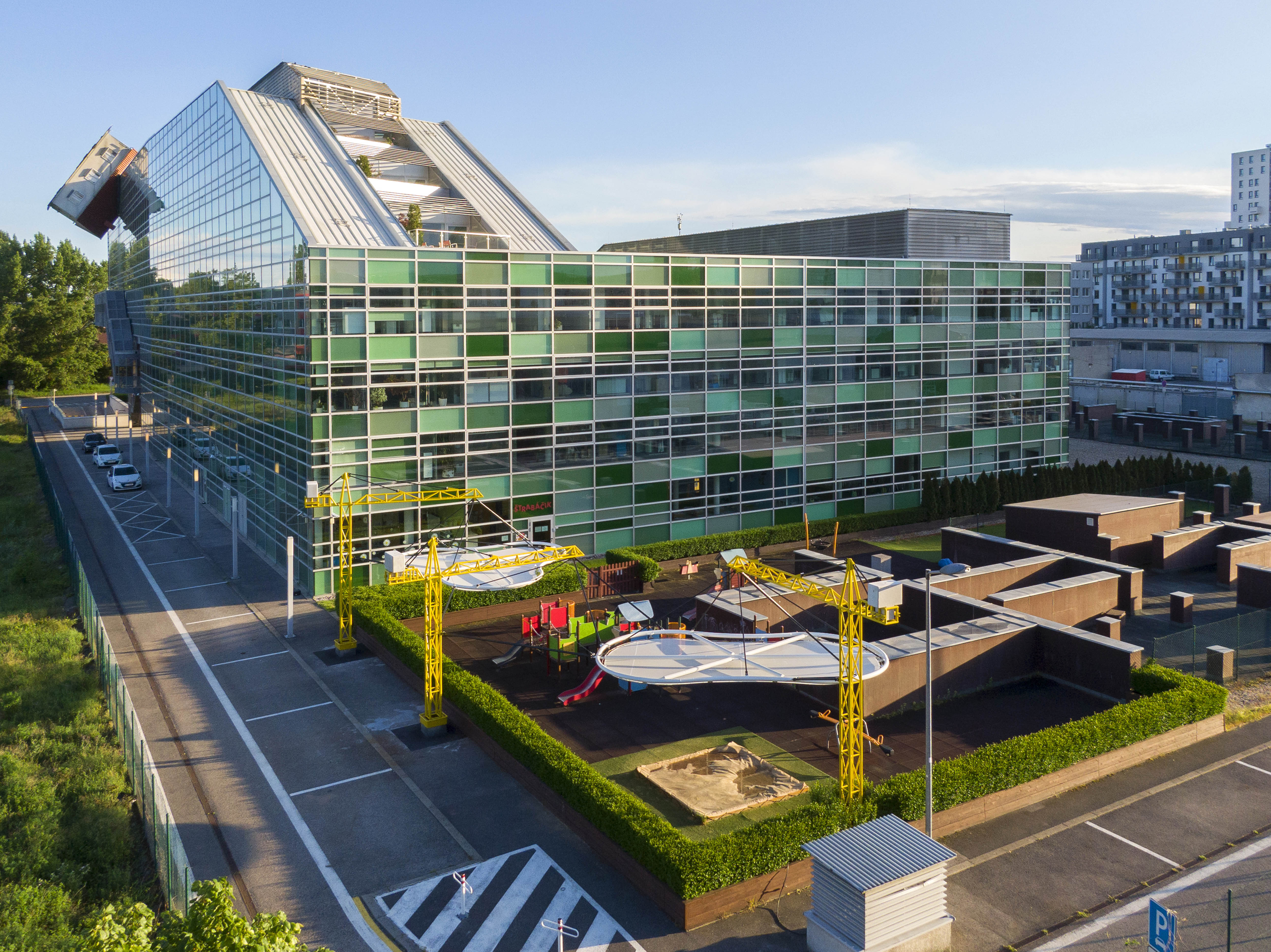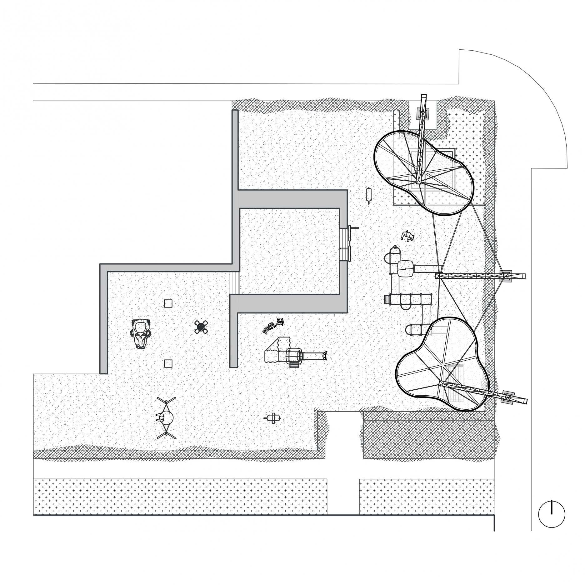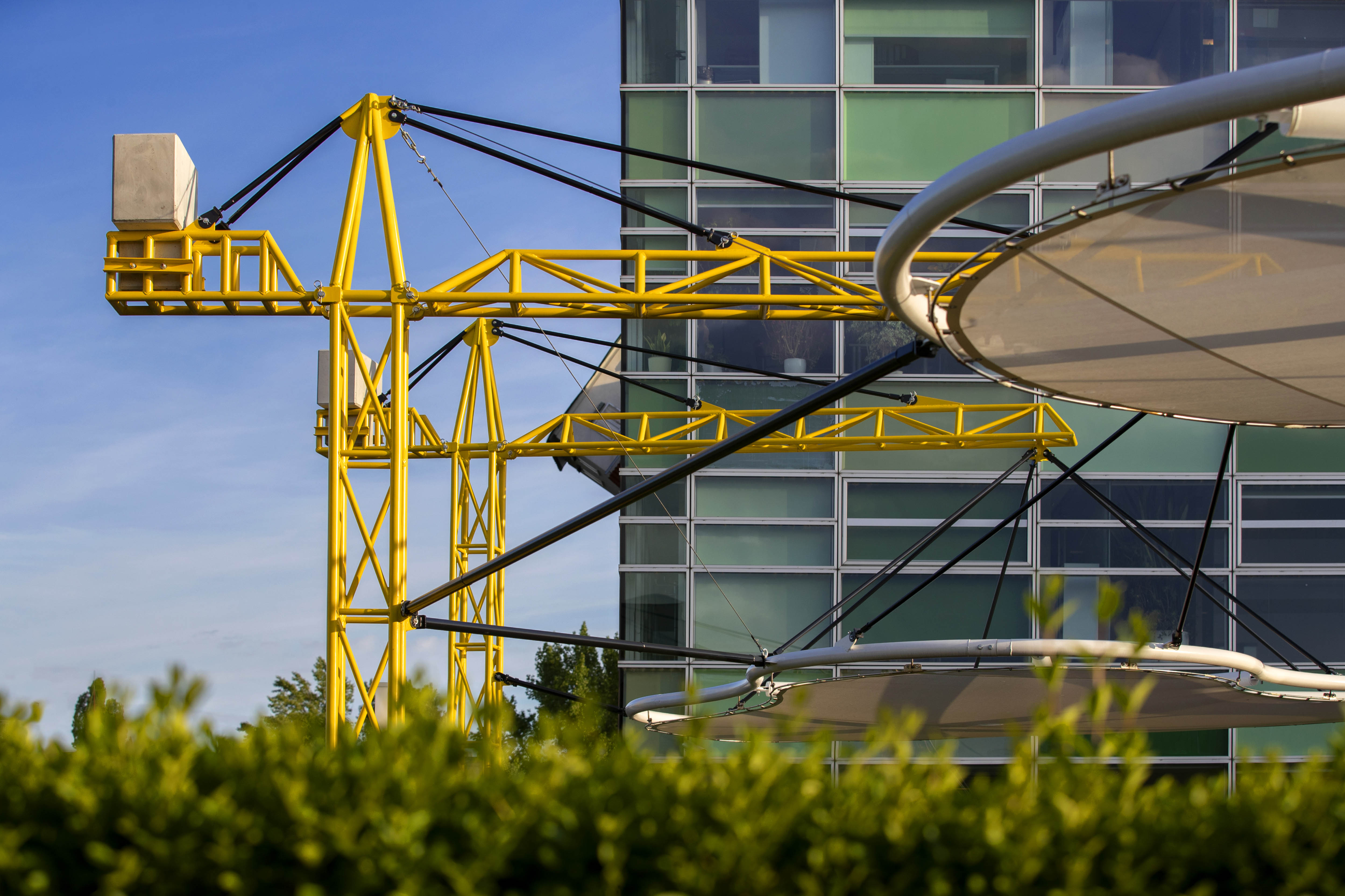 Priestor na pôdoryse podzemného parkoviska, s typovými hernými prvkami, neumožňuje rast vysokej zelene. Tienenie vonkajších okrajov ihriska preto zabezpečuje trojica priehradových žeriavov, ktoré nesú oválne oceľové rámy s napnutou sieťovou membránou. "Žeriavy nesú obláčiky". Funkčné architektonické prvky odkazujú na činnosť klienta a zároveň slúžia ako pútač pre okoloidúcich. Všetky konštrukcie sú fixné, bez možnosti pohybu či otáčania.
