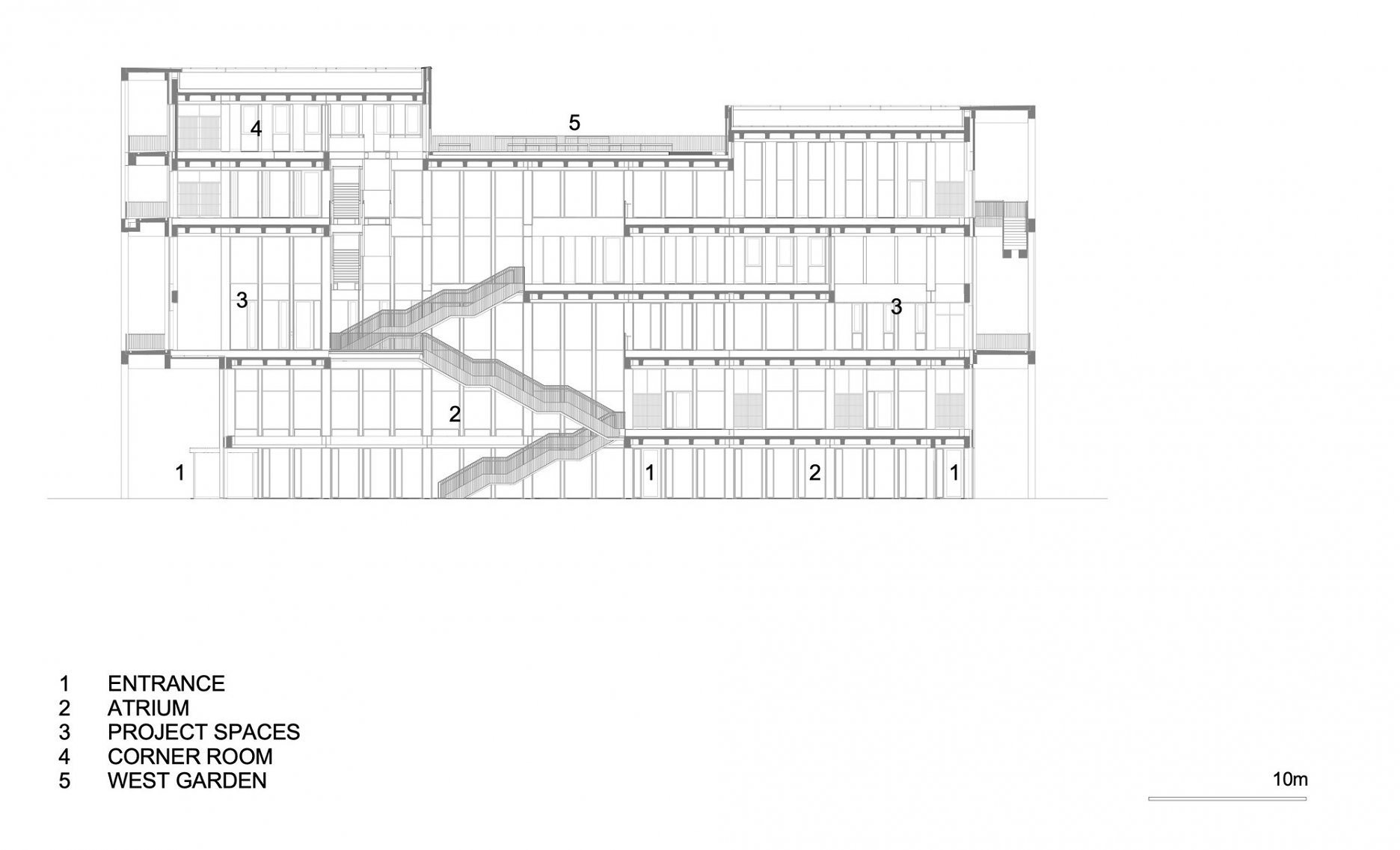 V súčte viac ako 50 percent plochy podlaží tvoria galérie. Priestorový koncept môžeme vnímať už vo foyer, cez ktoré plynie schodisko, ako otvorená spojnica medzi dianím v celej budove. Kaskádovo prepojené terasy na vonkajšom obvode fasády umožňujú voľný pohyb v exteriéri. Od úrovne terénu, až po rozsiahlu strešnú krajinu.