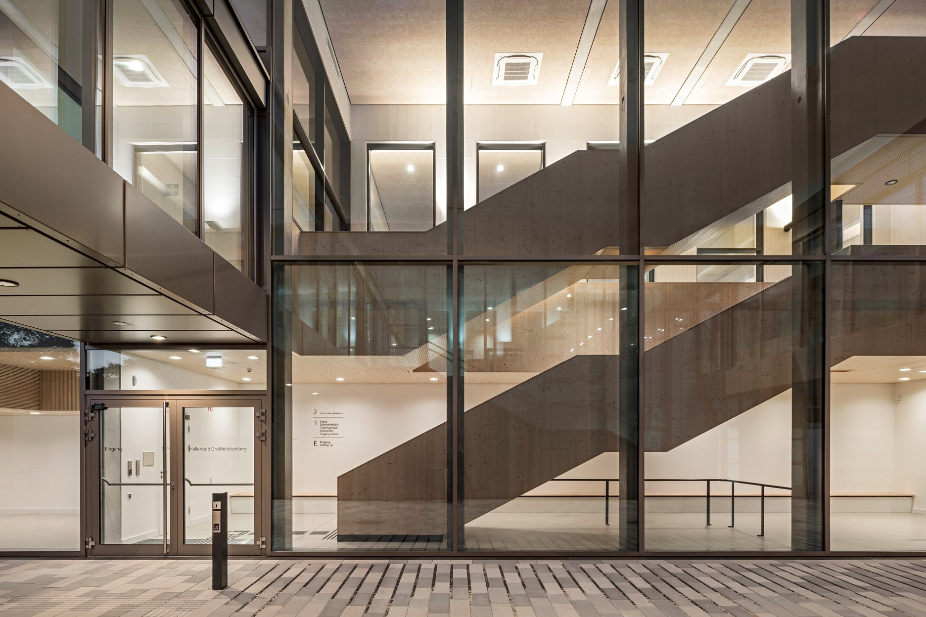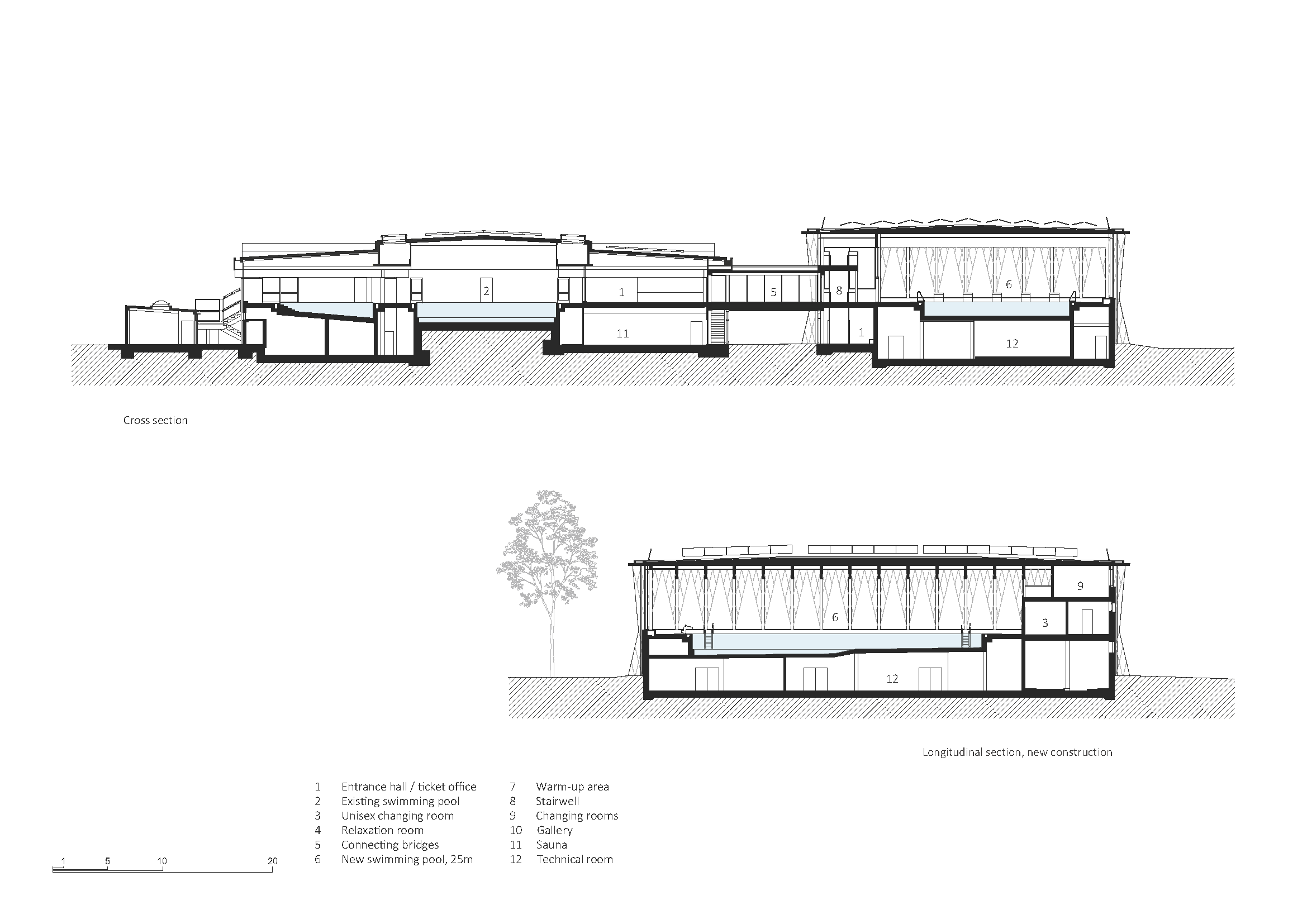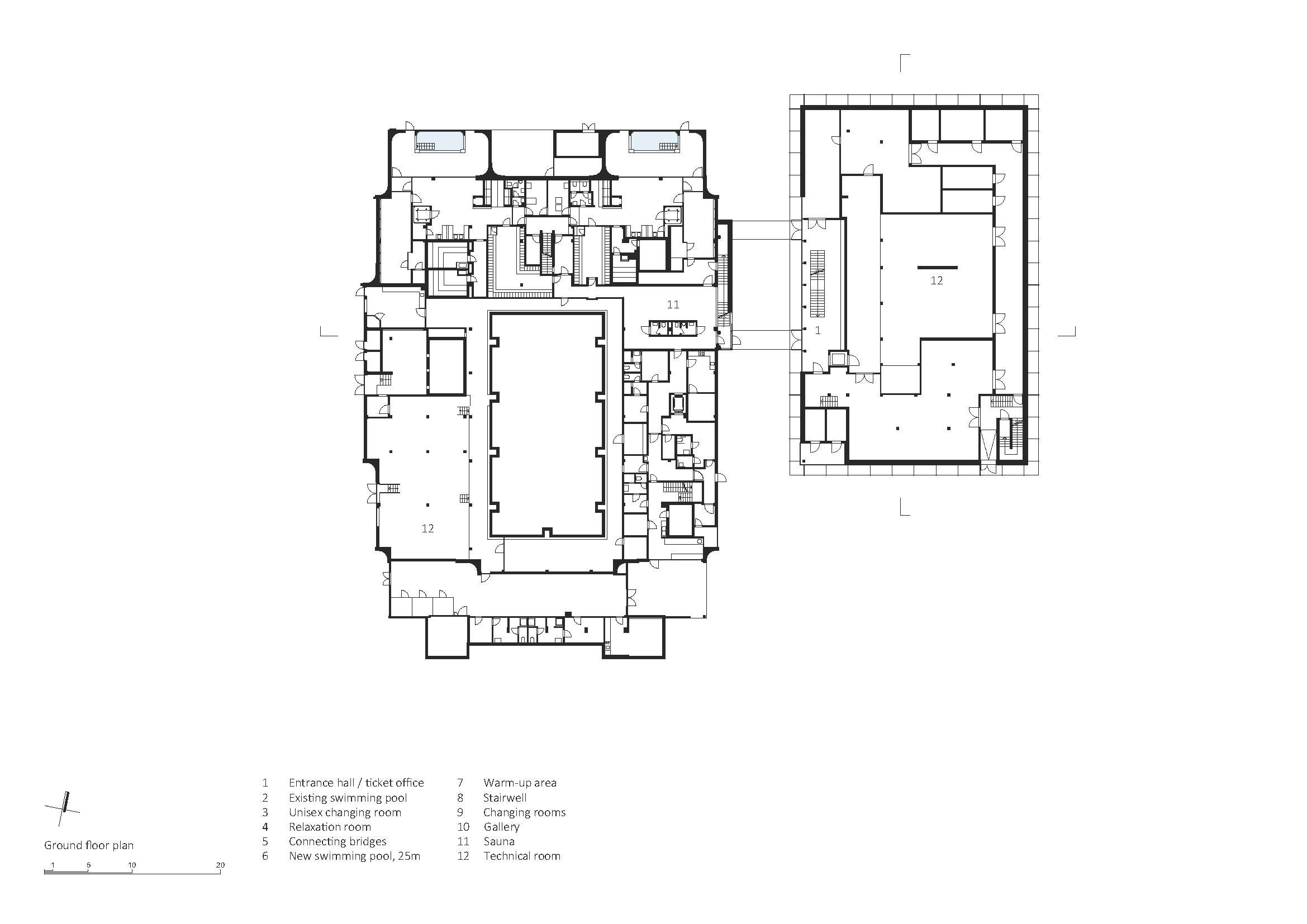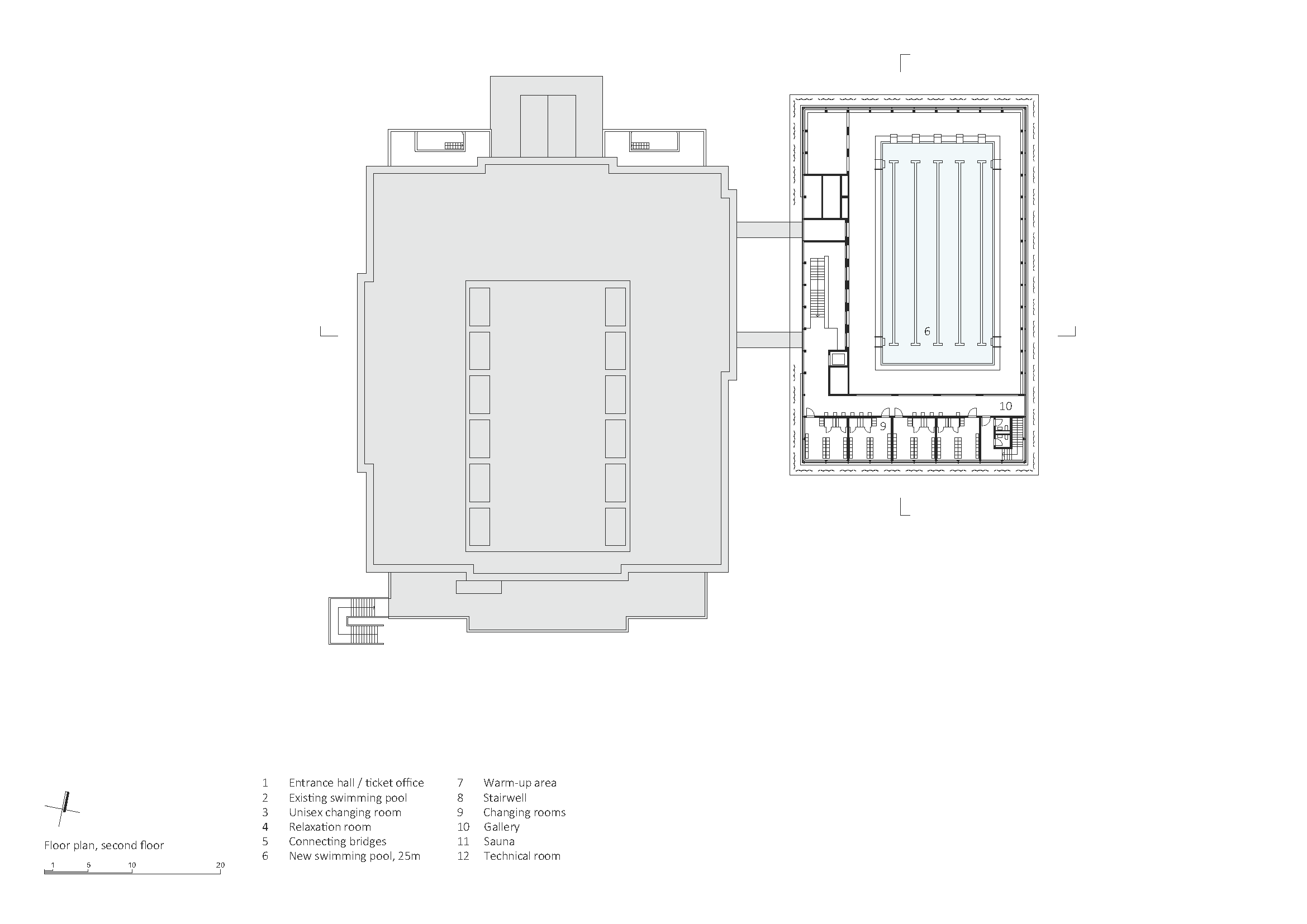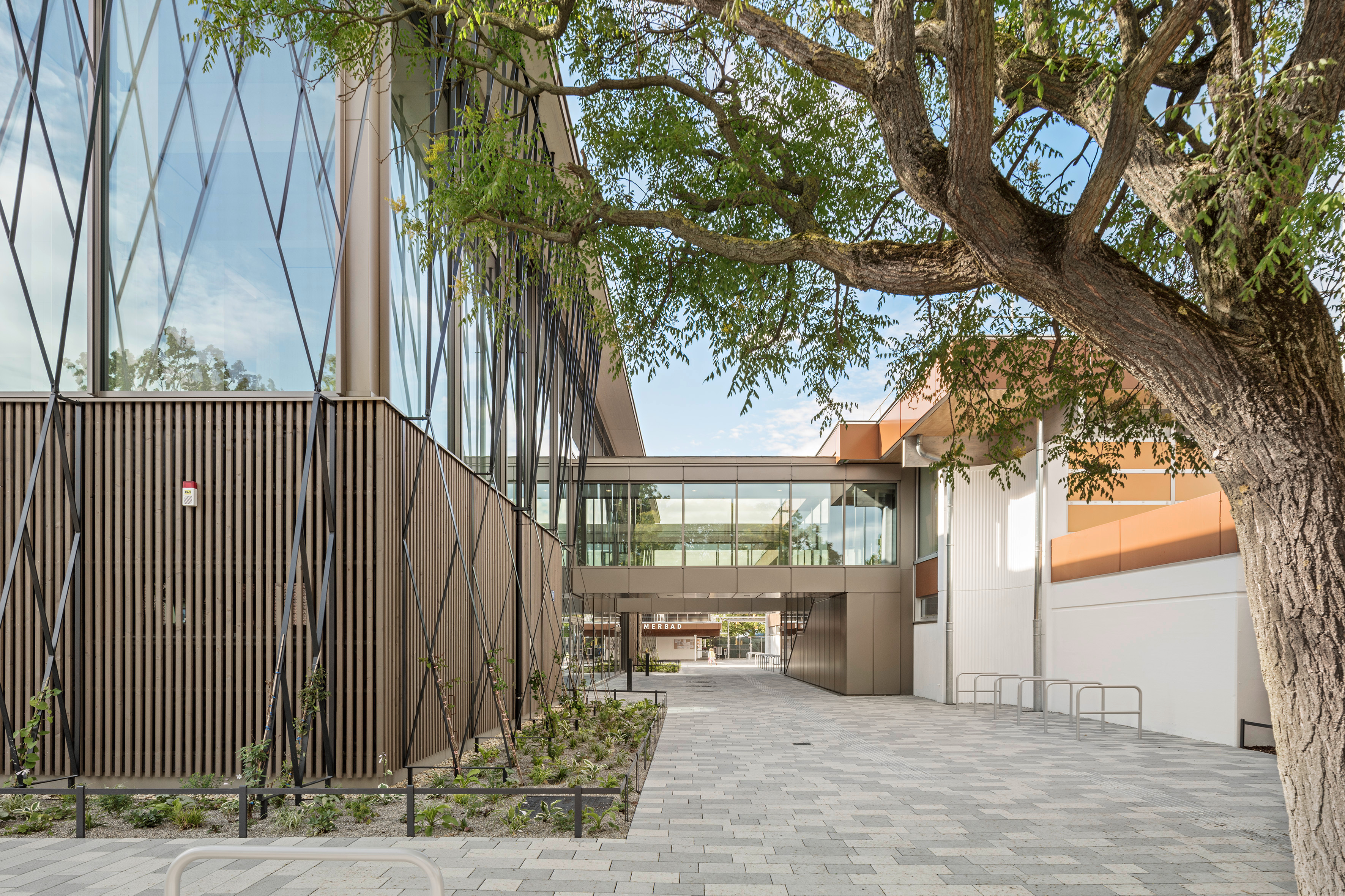 Nová hala k pôvodnej budove prilieha iba dvojicou konzolovo vysunutých prepojovacích mostov. Medzi objektmi vzniká zelená „ulička“, ktorá prirodzene vedie návštevníkov k hlavnému vstupu situovanému pod mostmi. Už pri príchode je cez veľkoplošné zasklenie čitateľné schodisko, ktoré vedie na úroveň bazénovej haly. Práve toto riešenie robí z priestoru medzi starým a novým objektom plnohodnotný pobytový medzipriestor.
