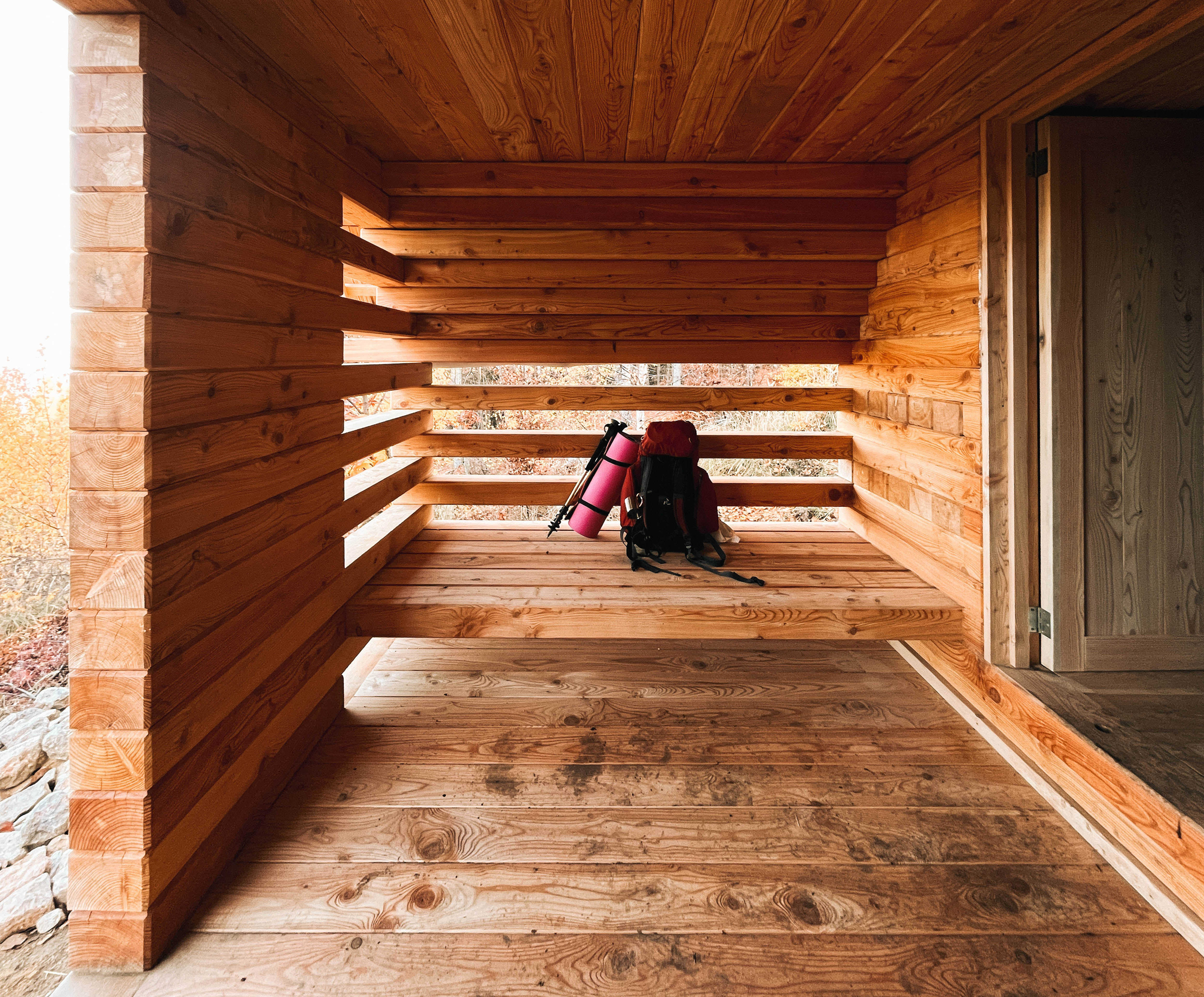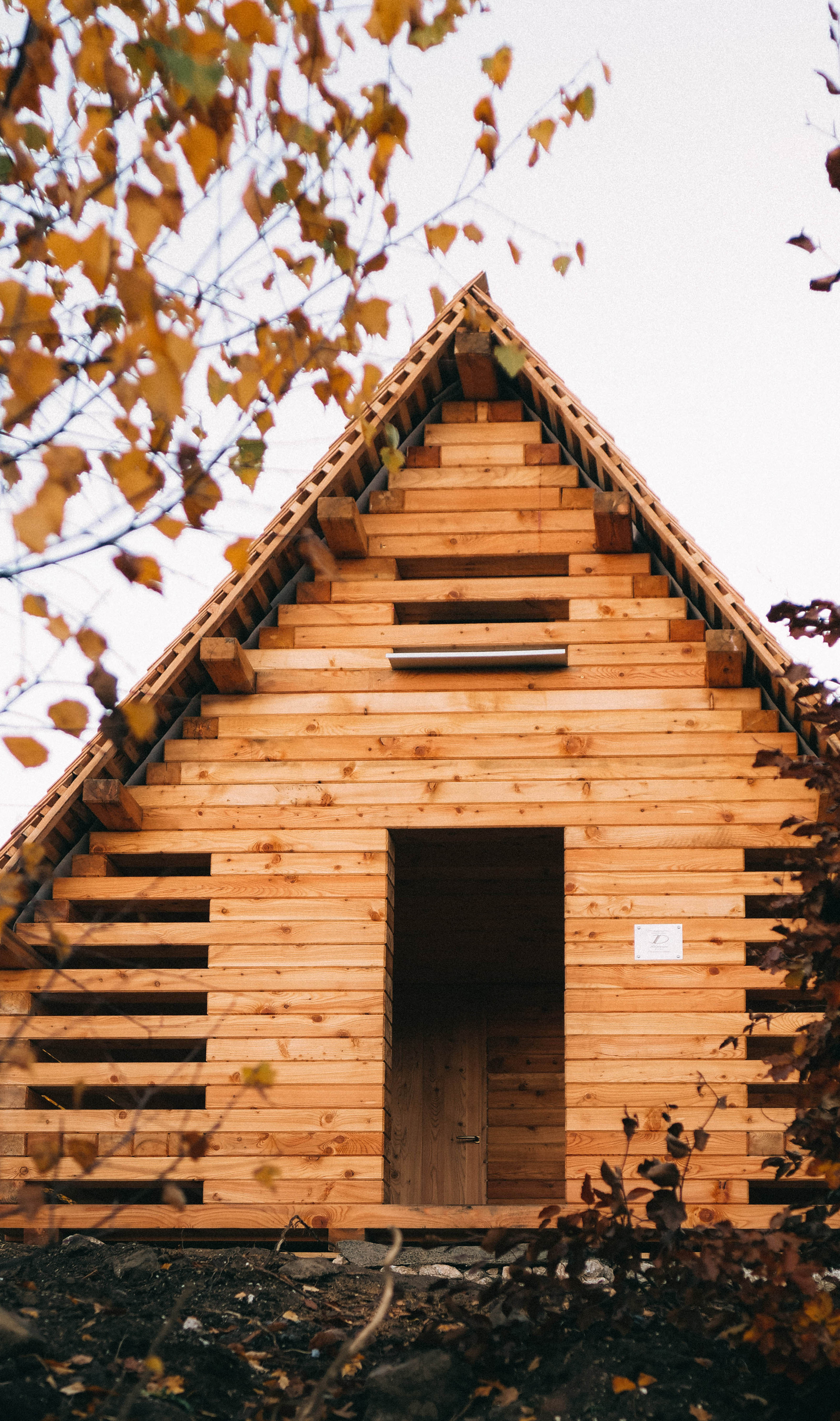Na vybrané miesto sme sa rozhodli umiestniť jednoduchý objekt - úkryt - citlivo zasadený do krajiny. Pre návštevníka poskytuje hneď niekoľko funkcií a bez zbytočných príkras vytvára bezpečný priestor. Je postavený ako masívna zrubová konštrukcia z priznaných drevených hranolov, ktoré sa tak stávajú jej dominantným výrazovým prvkom.