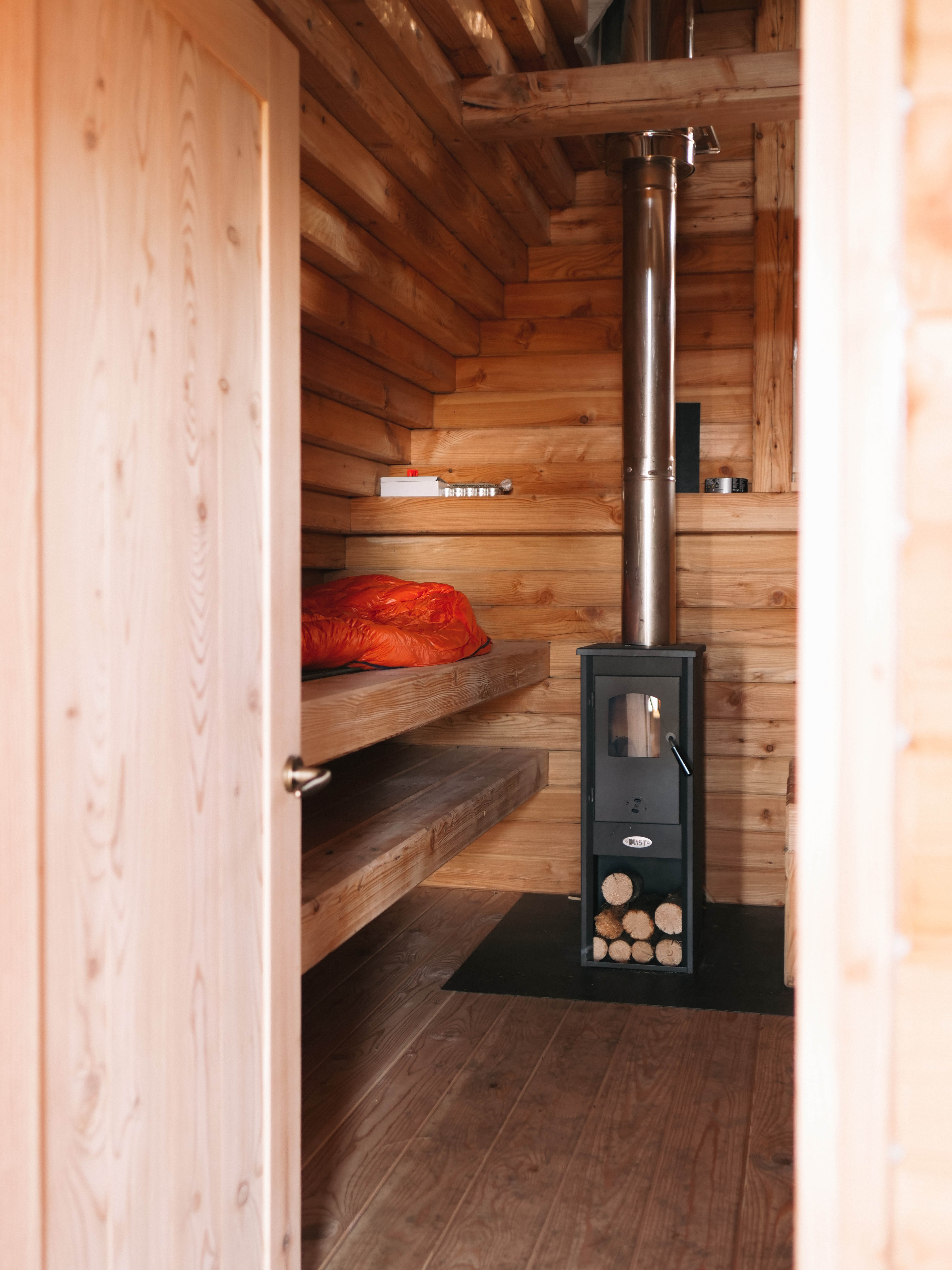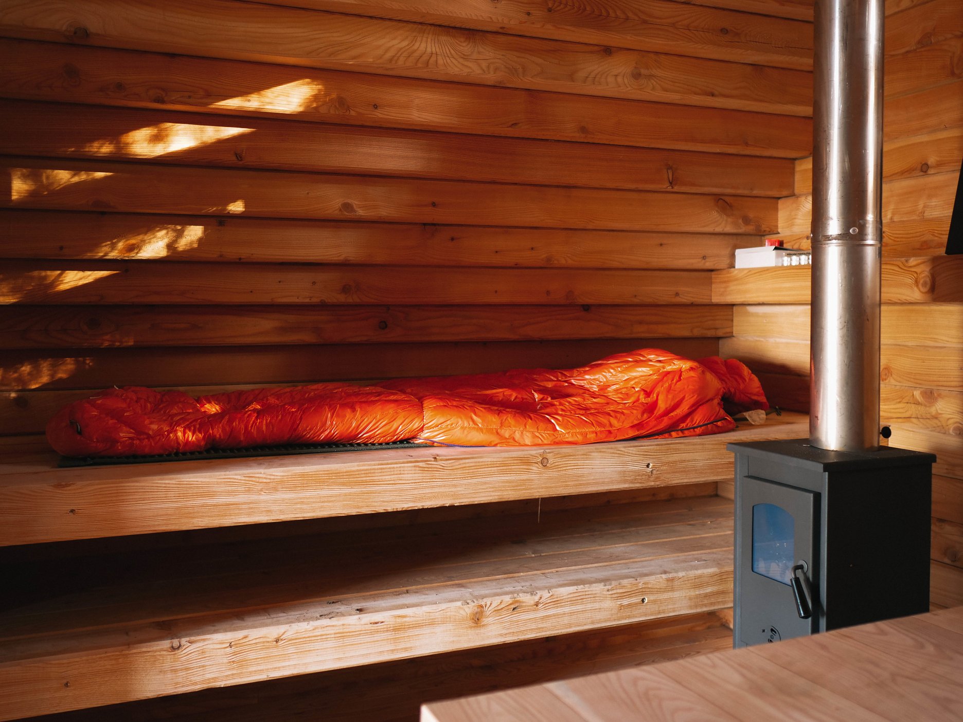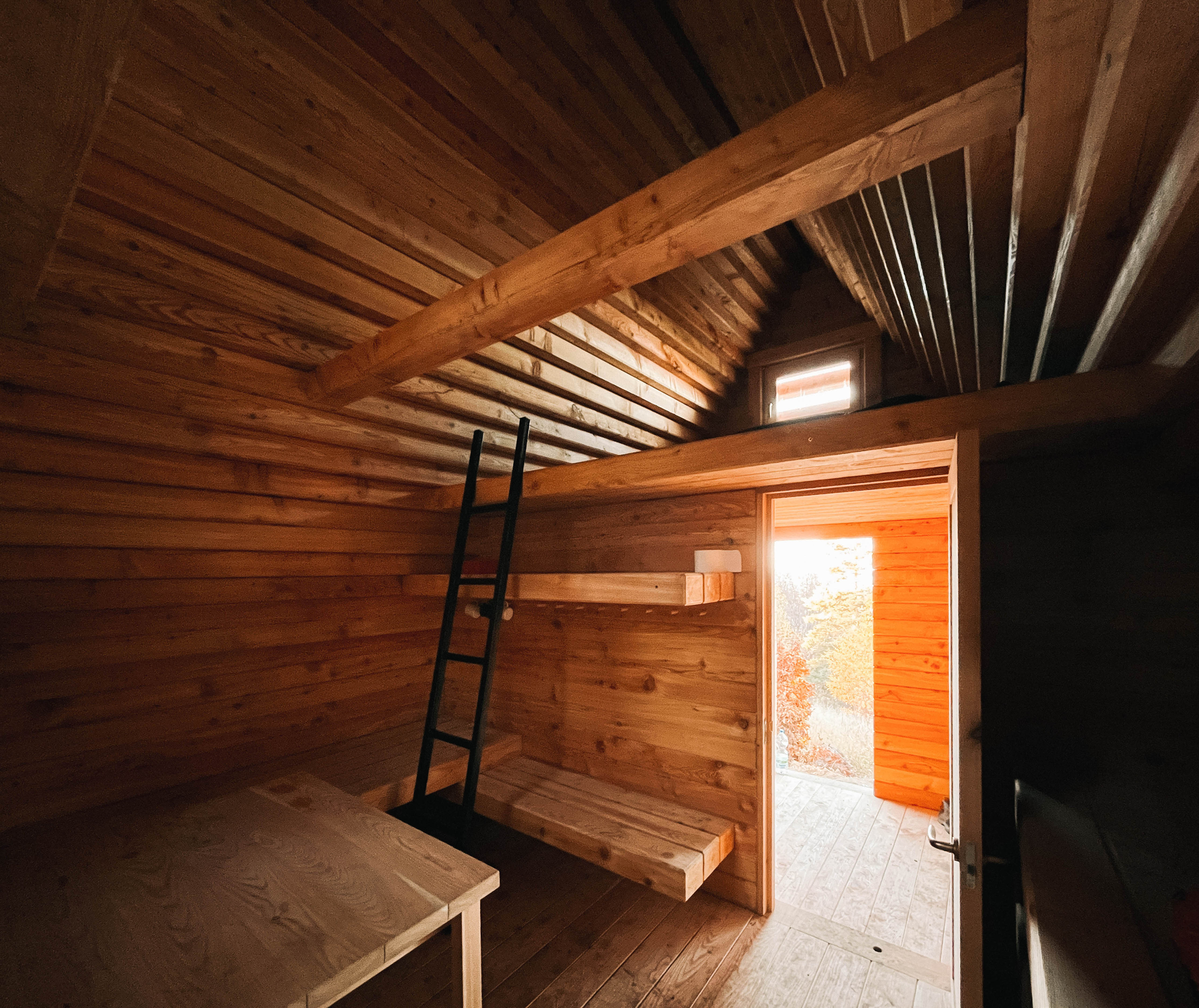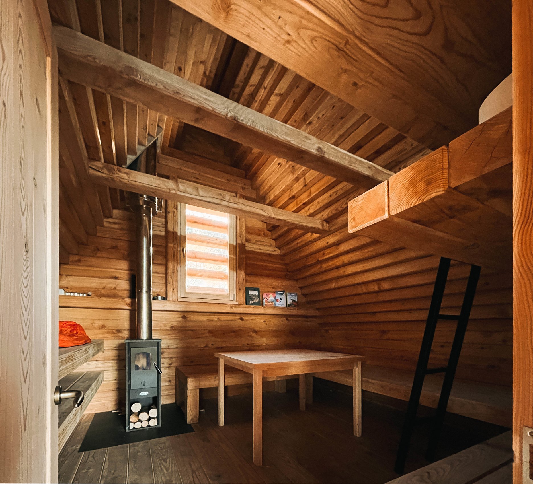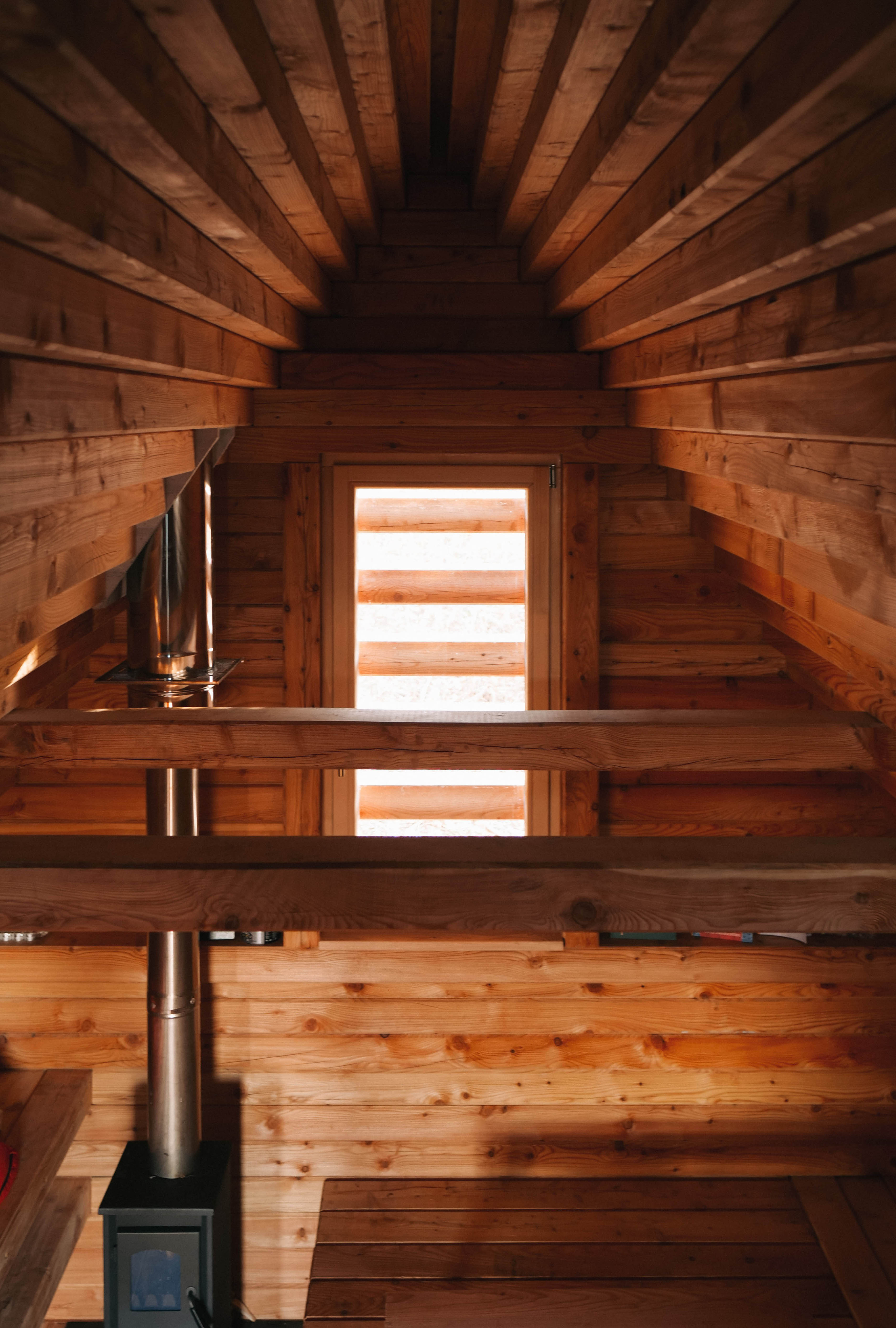 Poschodie na spanie je prístupné po rebríku. Interiér je osvetlený oknami v štítových stenách. Presklené plochy eliminujú priebežné drevené profily z vonkajšej strany. Vedľa okien sa nachádzajú odkladacie poličky na drobnosti - čelovka, fľaša na vodu...
