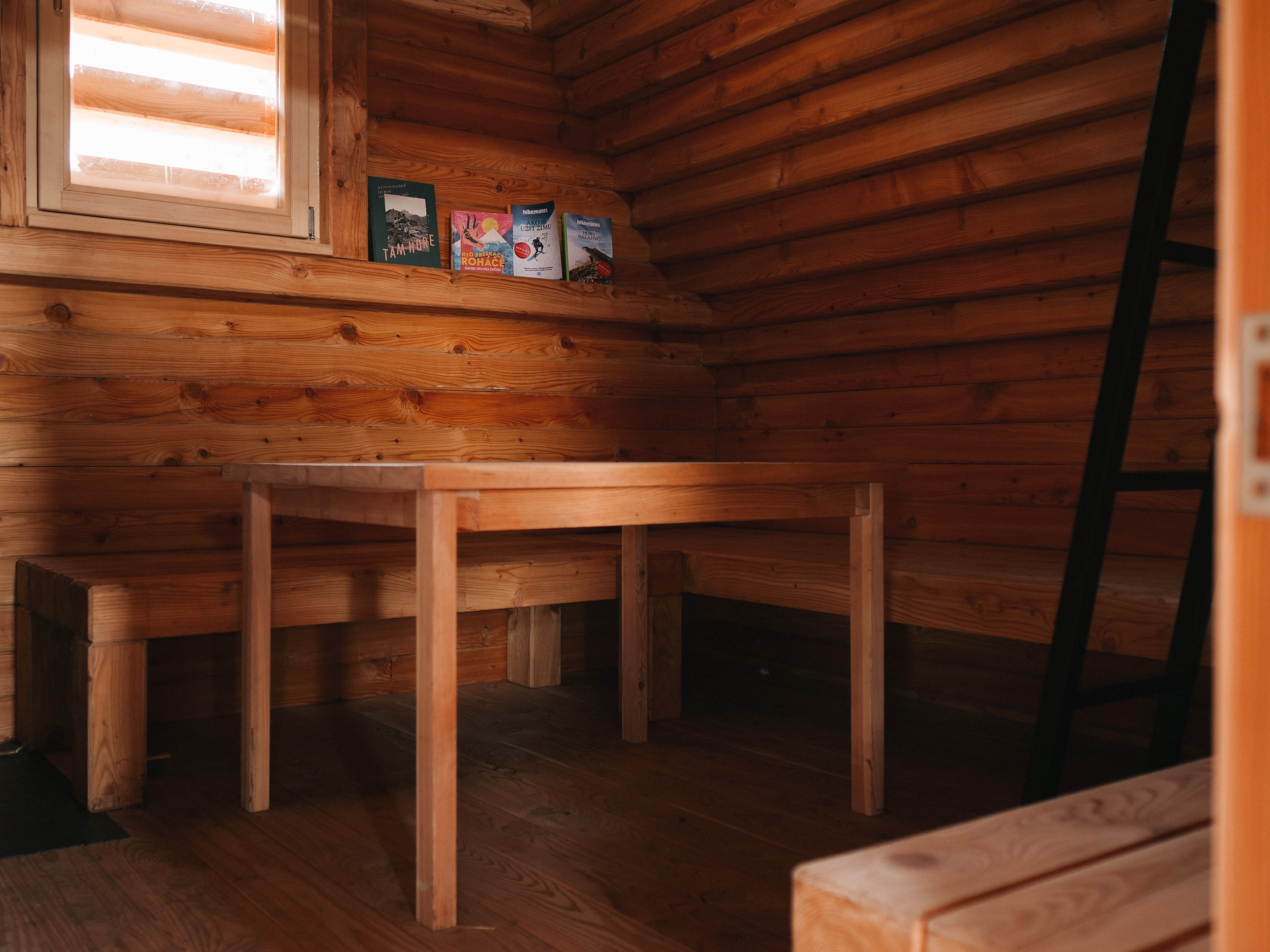 Príprava jedla prebieha na rozmernej pracovnej ploche vedľa dverí. Na varenie je možné použiť tiež piecku. V polici pod pracovnou plochou je uložený erárny riad či náradie. Lavice sú usporiadané do L a majú pri sebe fixný stôl pre 4 ľudí. Pod lavicami je dostatočný priestor pre uskladnenie suchého dreva a potrebného náradia. Mokré oblečenie je možné sušiť na šnúre medzi trámami nad stolom.