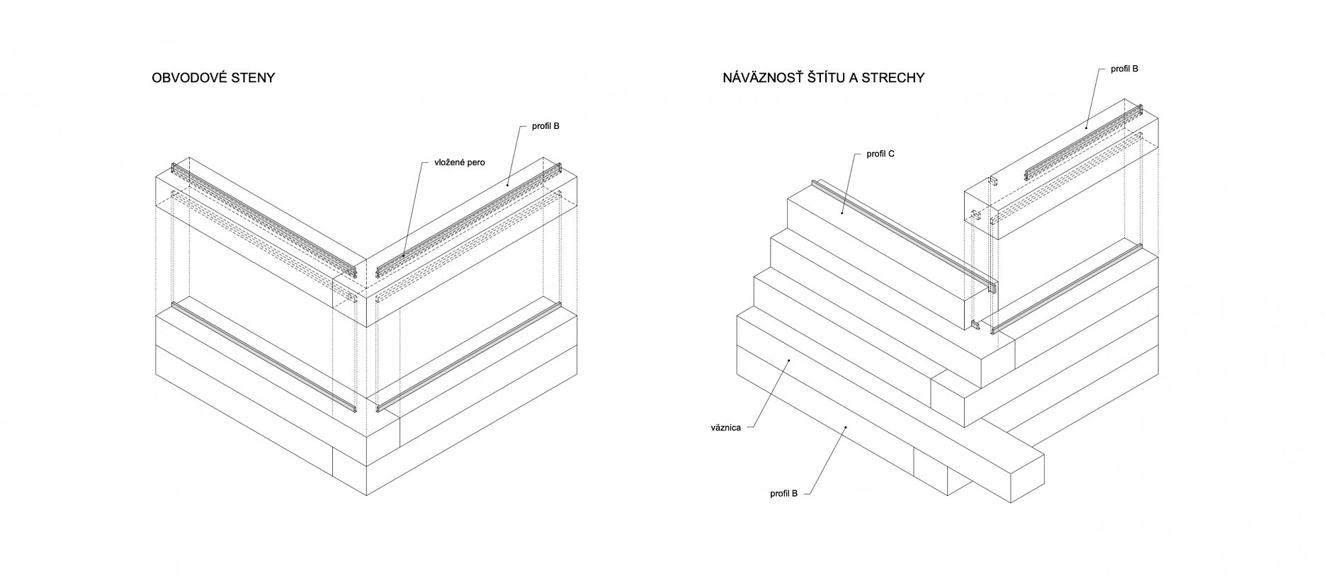 Útulňa stojí na nízkej kamennej podmurovke a je orientovaná štítom kolmo k terénu. Základným stavebným prvkom samotného objektu je drevený hranol z červeného smreku o rozmeroch 120x160mm. Jeho opakovaním a skladaním natupo v dvoch smeroch vzniká obvodová konštrukcia, ktorá ostáva priznaná z vonkajšej aj vnútornej strany. Vynechaním drevených hranolov v obvodovej konštrukcii sú vytvorené štrbiny, ktoré do objektu vpúšťajú svetlo a vzduch a dodávajú stavbe jej jedinečný výraz. Rovnaké stavebné prvky sú použité aj na členenie interiéru a “nábytok”, ktorý je tak pevnou súčasťou stavby. Drevený hranol je tak dominantným výrazovým prvkom exteriéru aj interiéru útulne.