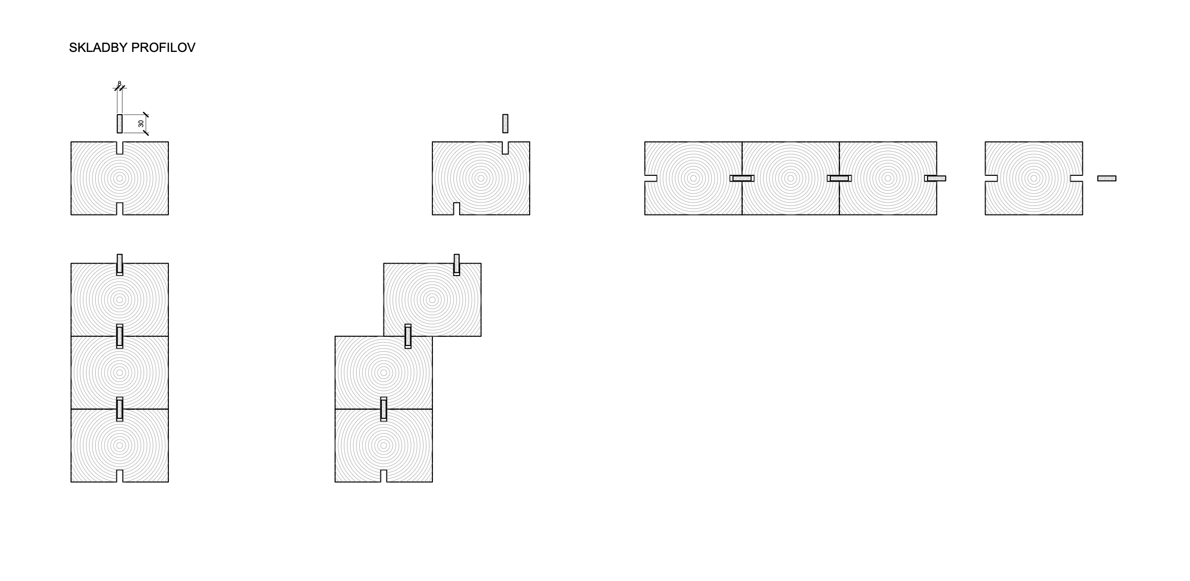 Medzi drevenými profilmi, ktoré tvoria obvodové steny, strechu a strop sú do vyfrézovaných drážok vložené drevené latky (pero), ktoré plnia funkciu ochrany interiéru pri vzniku špár dodatočným vysychaním dreva. Na podlahu sú použité masívne drevené podlahové dosky. Zariadenie zostáva strohé, je trvácne a odolné voči poškodeniu. Ako strešná krytina je použitý drevený šindeľ.
