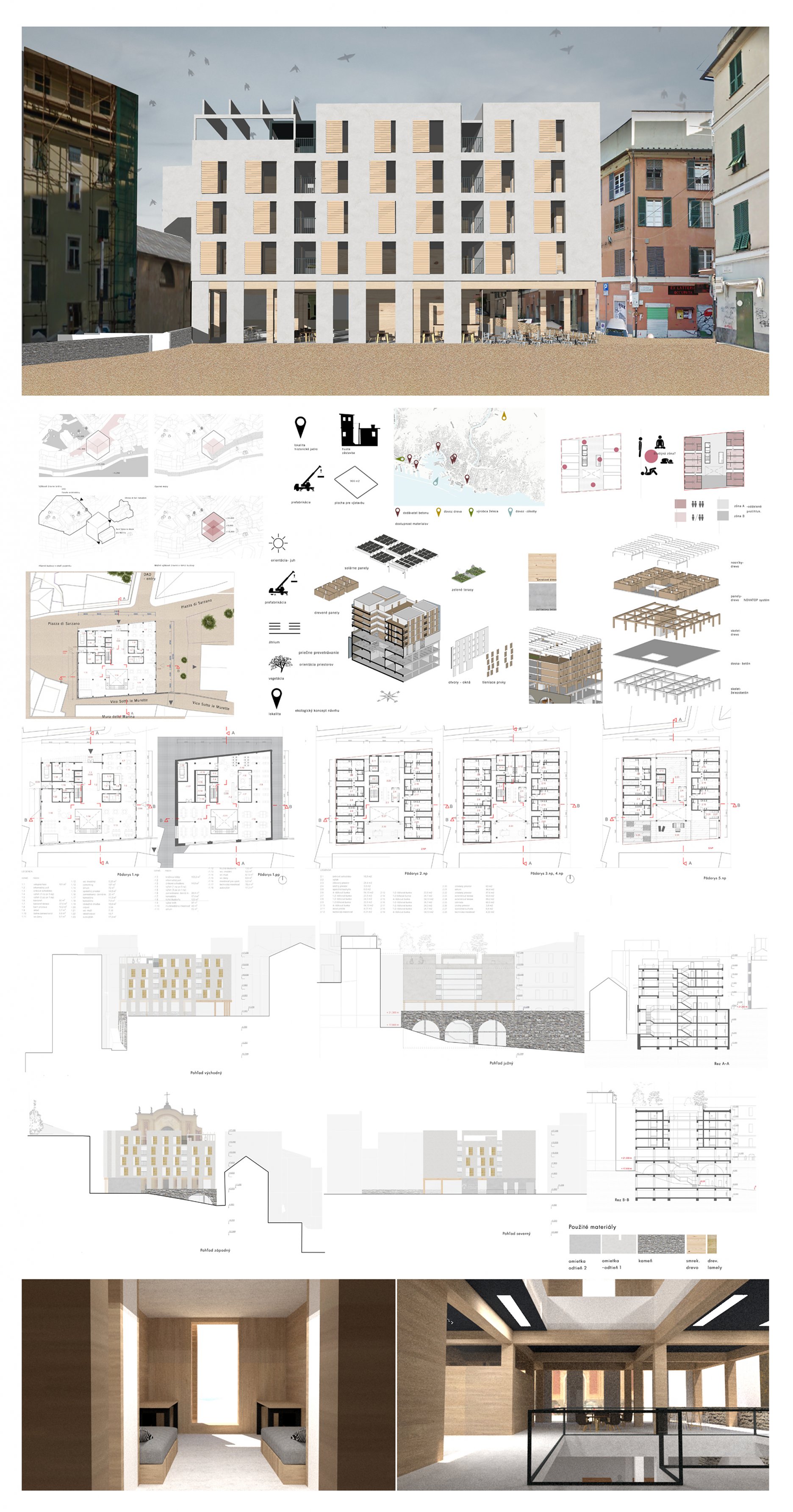 Práca sa zameriava na potreby študentského ubytovania v rámci zástavby historického mesta. Návrh predstavuje riešenie, ktoré by umožňovalo využitie objektu nielen ubytovanými (študentami), ale aj širšej verejnosti, keďže lokalita úzko súvisí s riešením verejného priestranstva. Jedným z najdôležitejších faktorov je modulárna výstavba obytných jednotiek a ich variácie. Prefabrikácia z dreva predstavuje nielen ekologické riešenie, no najmä rýchlosť a efektivitu výstavby. Súčasťou práce bola analýza okolitého prostredia, najmä určitých výrazových prvkov, ktoré sú typické pre prístavné mesto Janov.