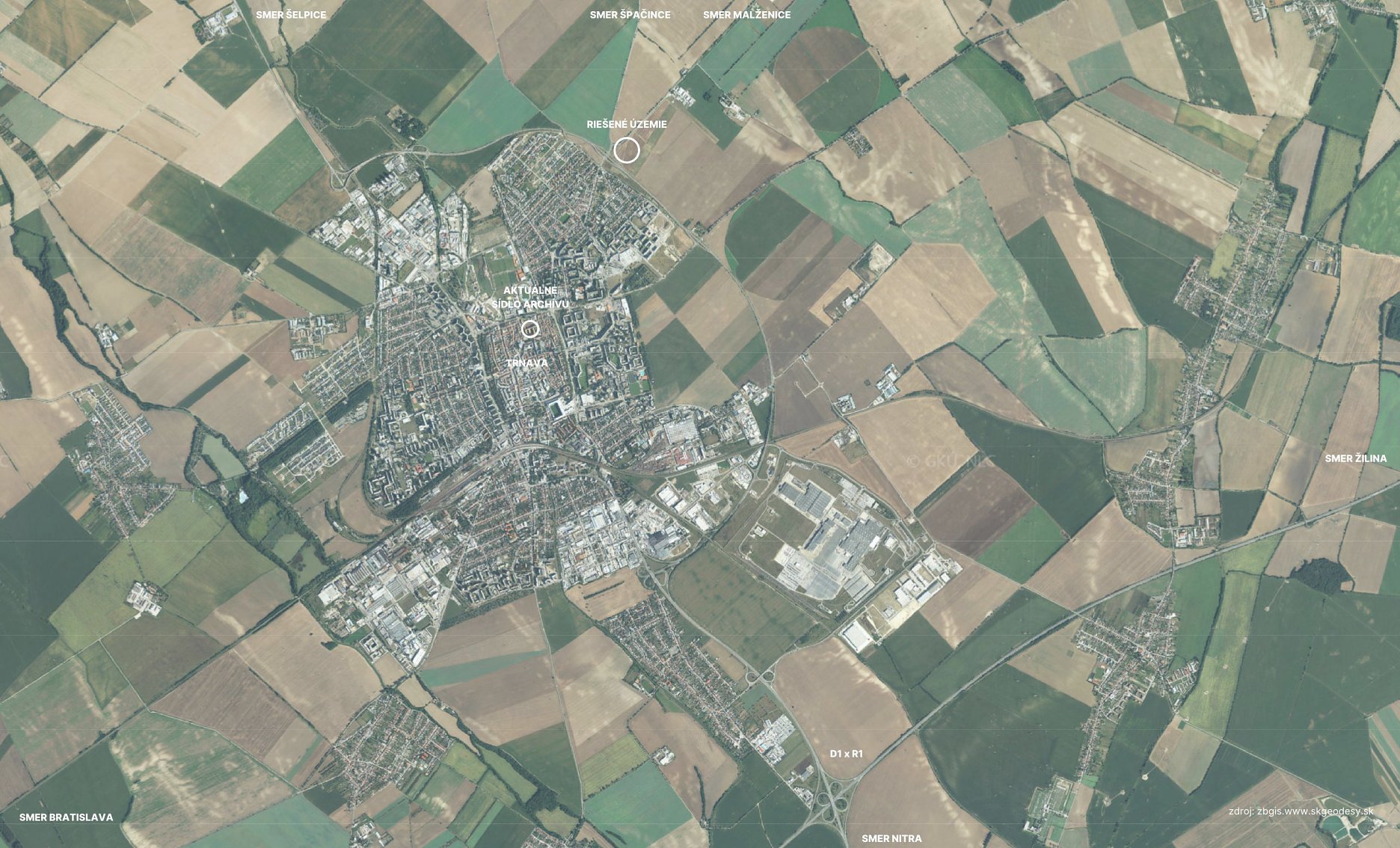 Lokalita na výstavbu nového archívu bola zvolená na okraji Trnavy, kde s novým archívom počíta aj platný územný plán mesta. Lokalita je v súčasnosti tvorená poľnohospodárskou pôdou, kde sa okrem archívu počíta aj s výstavbou hasičskej stanice a obytnej štvrte. Rozsiahla rovinatá parcela je lemovaná vzdušným aj podzemným elektrickým vedením, obchvatom Trnavy, a frekventovanou Malženickou cestou, čo vytvára špecifické prostredie, ktoré pôsobí pre človeka skôr ako nehostinný priestor s minimálnymi možnosťami interakcie s okolím. Lokalita je charakteristická dlhou dochádzkovou vzdialenosťou, veterným prostredím absenciou akejkoľvek vybavenosti, chýbajúcim peším či cyklistickým napojením na mesto. V rámci budúceho rozvoja tejto časti mesta sa počíta nie len s dobudovaním potrebnej infraštruktúry, ale územný plán ráta aj so štedrým pásom vegetácie slúžiacej ako biokoridor vedúci pozdĺž riešenej parcely.