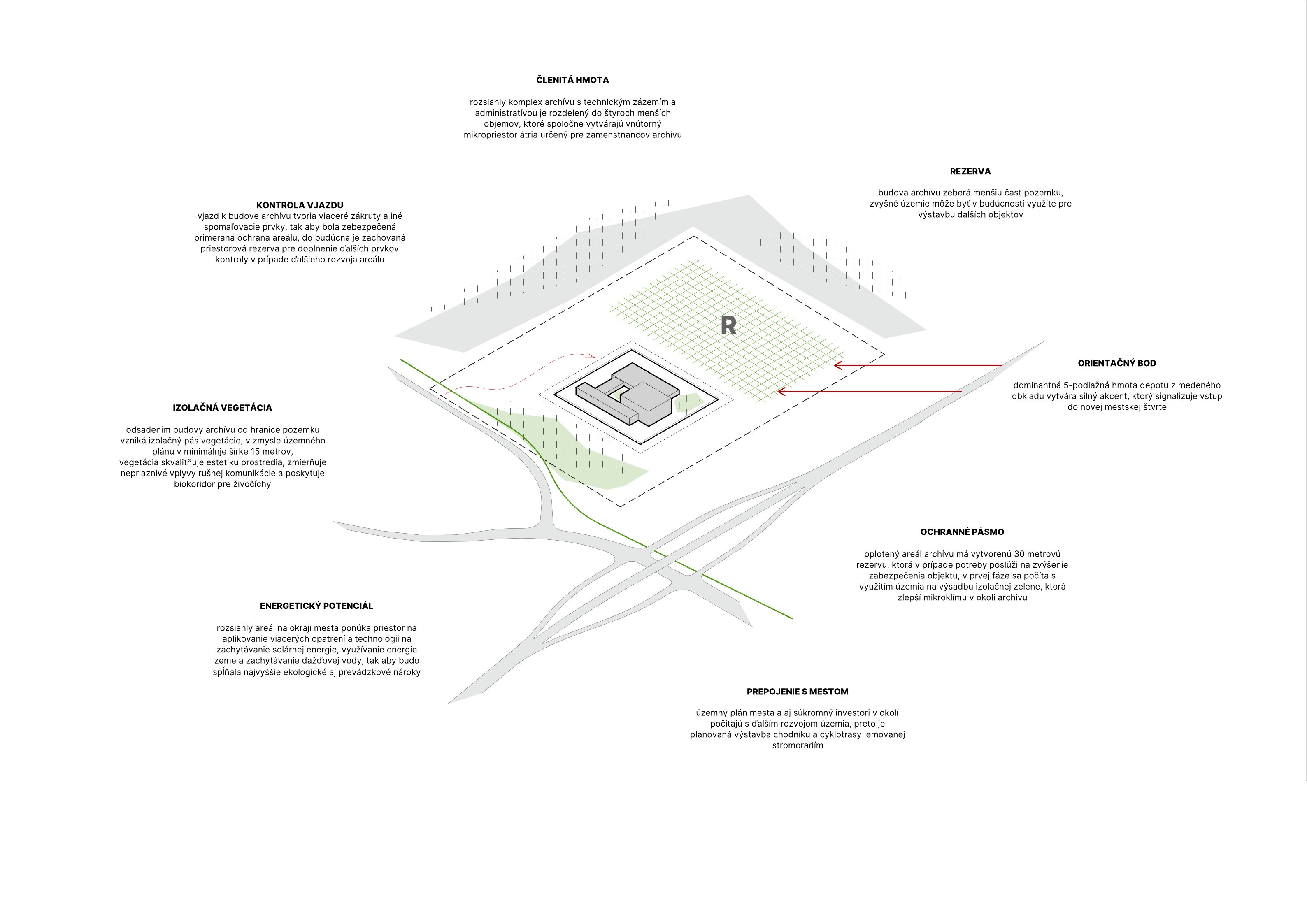 Návrh novej budovy archívu reflektuje špecifiká výstavby na zelenej lúke, požiadavky na archiváciu a zabezpečenie objektu. Všetky tieto determinanty formovali výslednú kompozíciu archívu, ktorý je usporiadaný do súboru štyroch hmôt v strede ktorých vzniká veľkorysé átrium chránené od okolitého ruchu, znečistenia či vetra. Každá zo štyroch hmôt prezentuje samostatný funkčný blok stavby: Vstupná a technicko-hospodárska časť je jednopodlažná, administratívna časť je dvojpodlažná, časť depotov má päť nadzemných podlaží a tvorí objemovú dominantu.