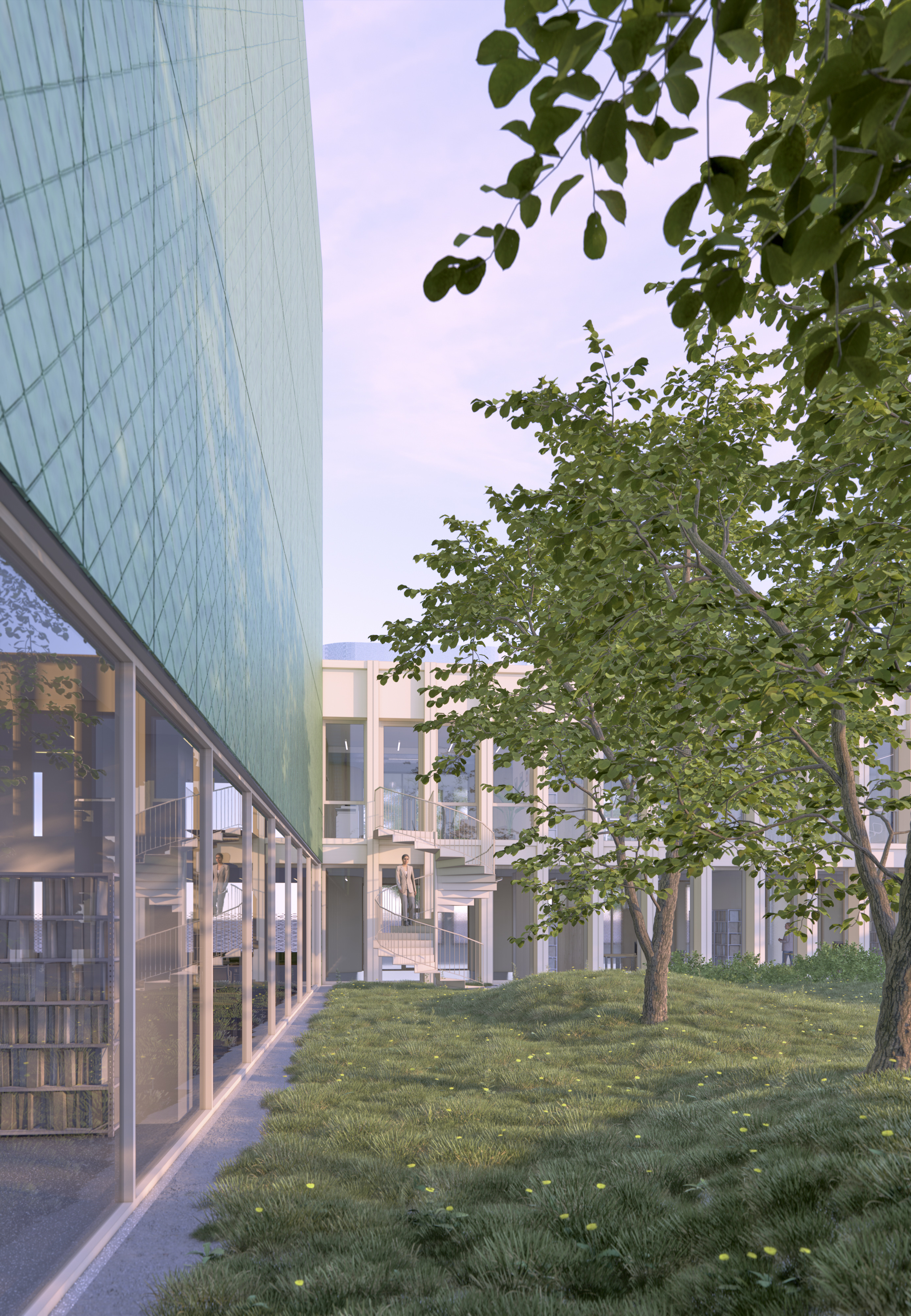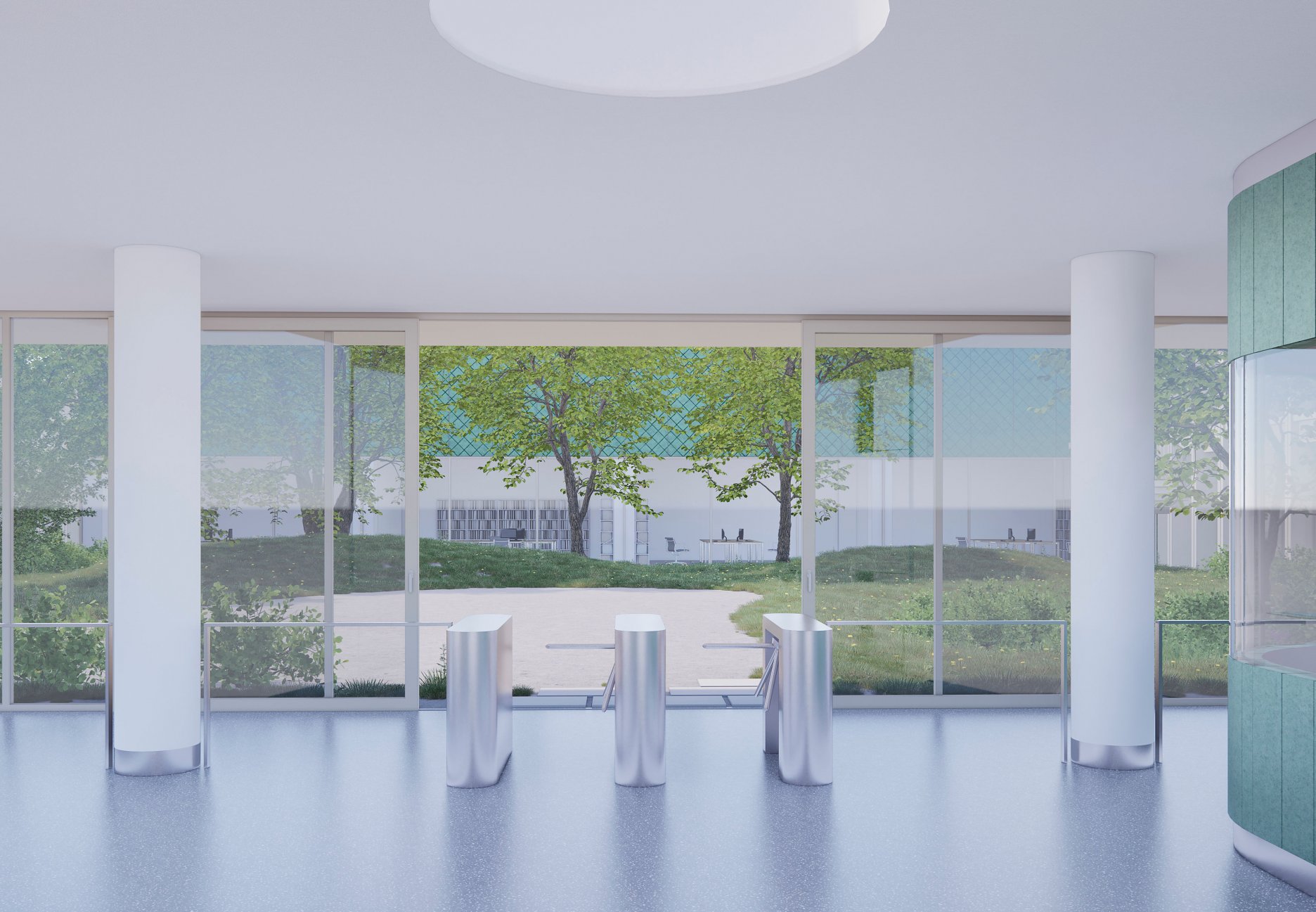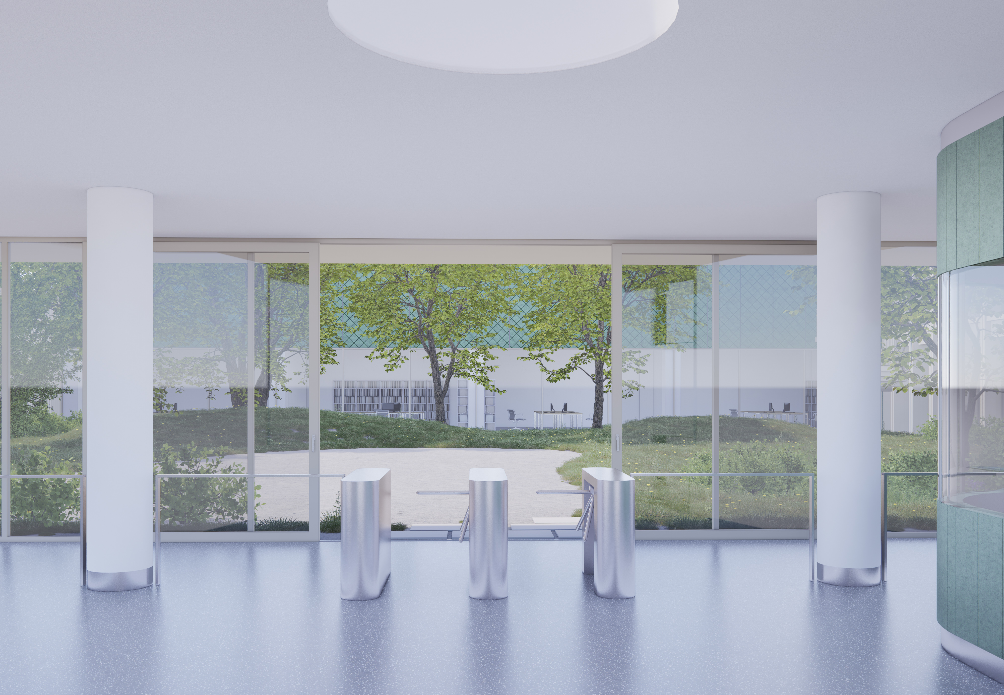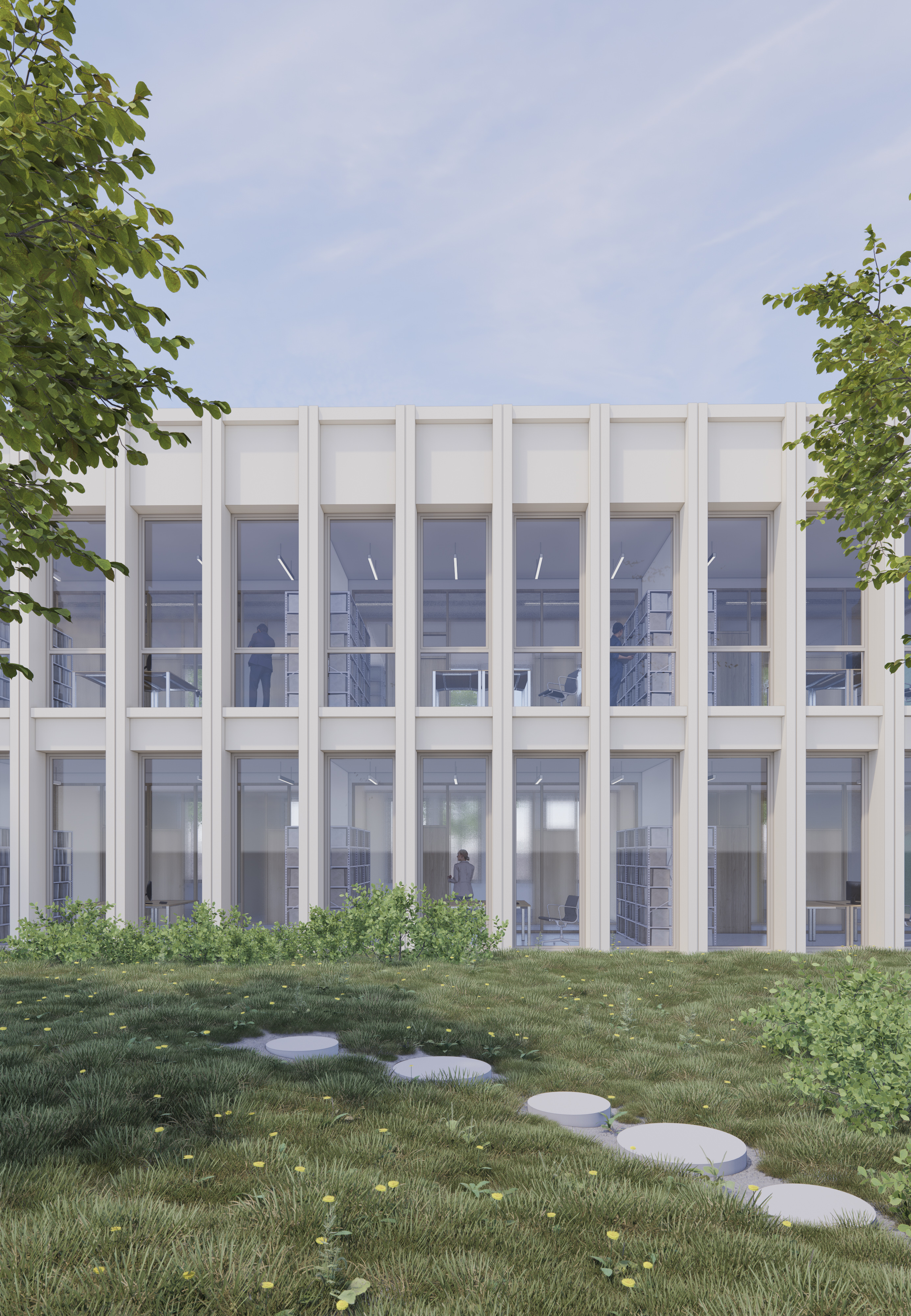 Vstupná časť objektu je orientovaná smerom k plánovanej vnútroareálovej komunikácii. Vstup tvorí priestranné foajé, z ktorého má návštevník možnosť nahliadnuť do nádvoria. Pre verejnosť je dostupná bádateľňa a tiež školiaca miestnosť dostupná priamo zo vstupnej haly.