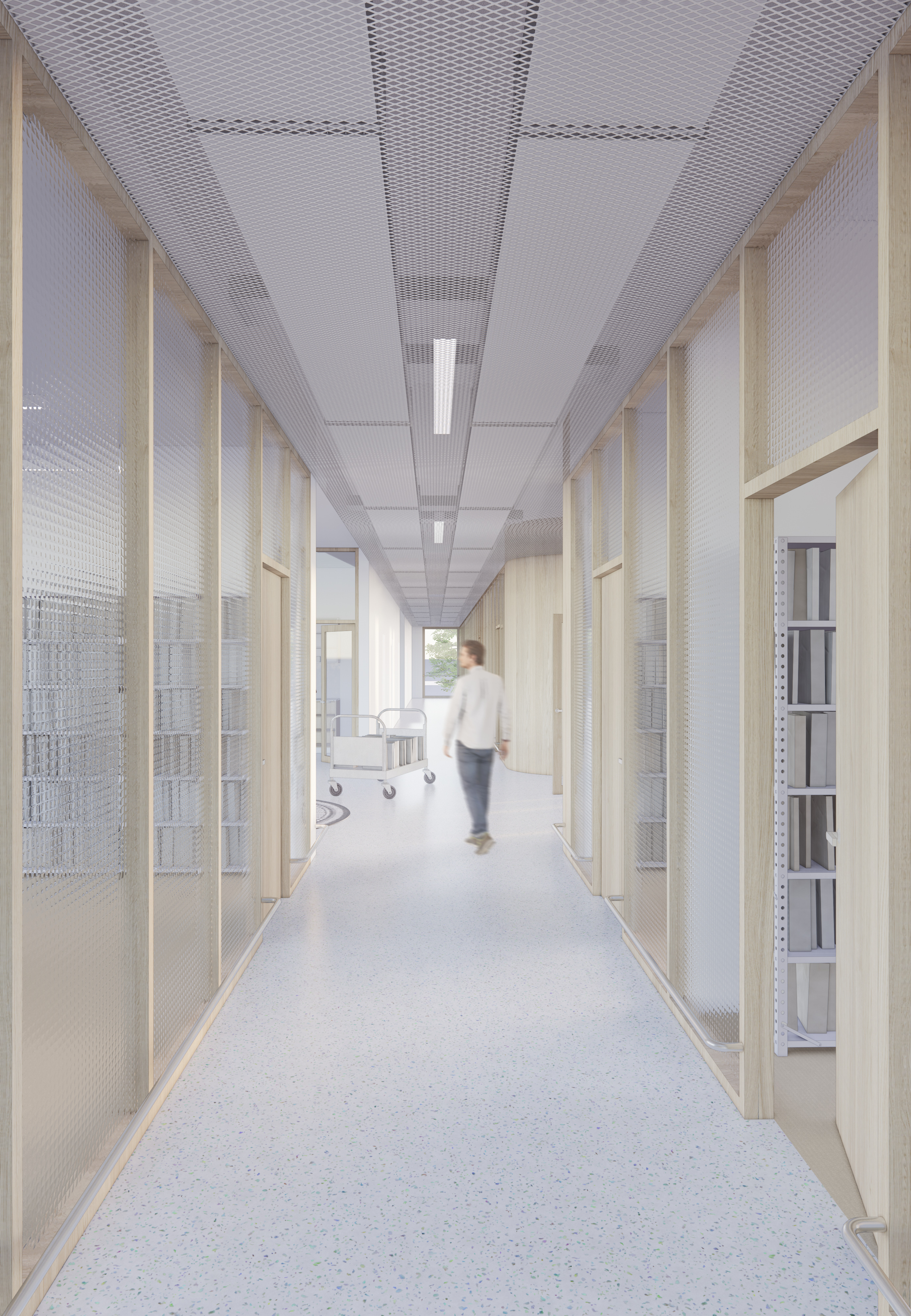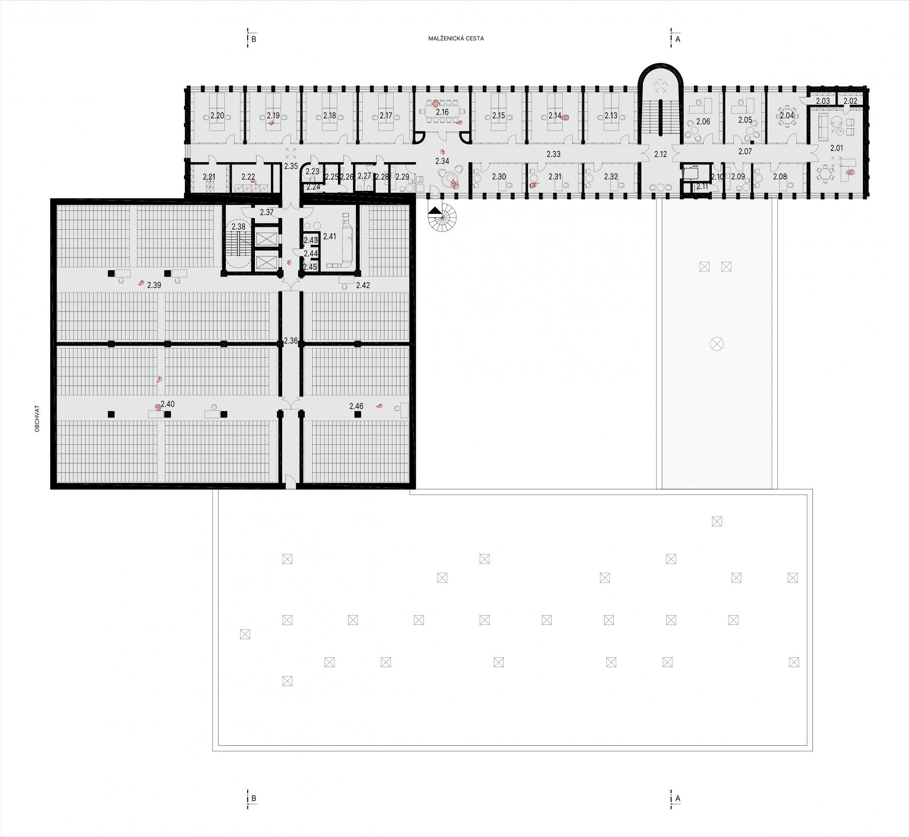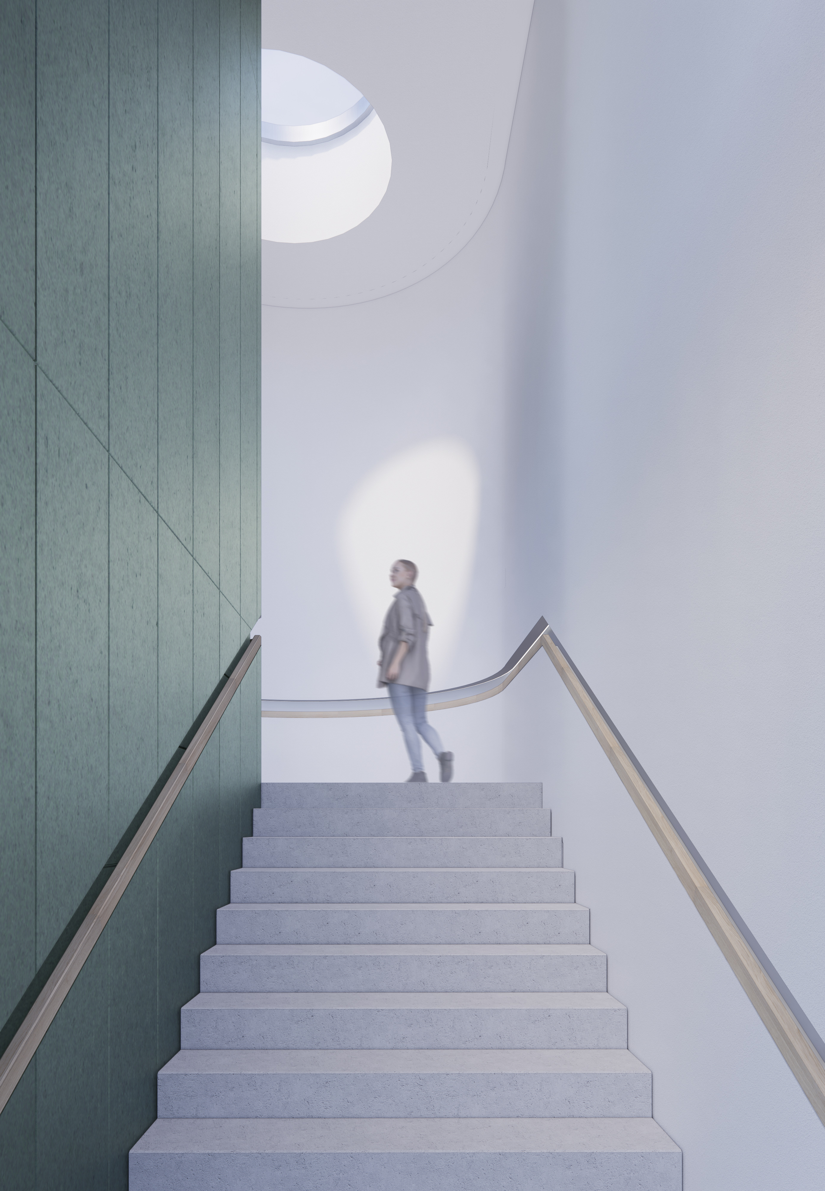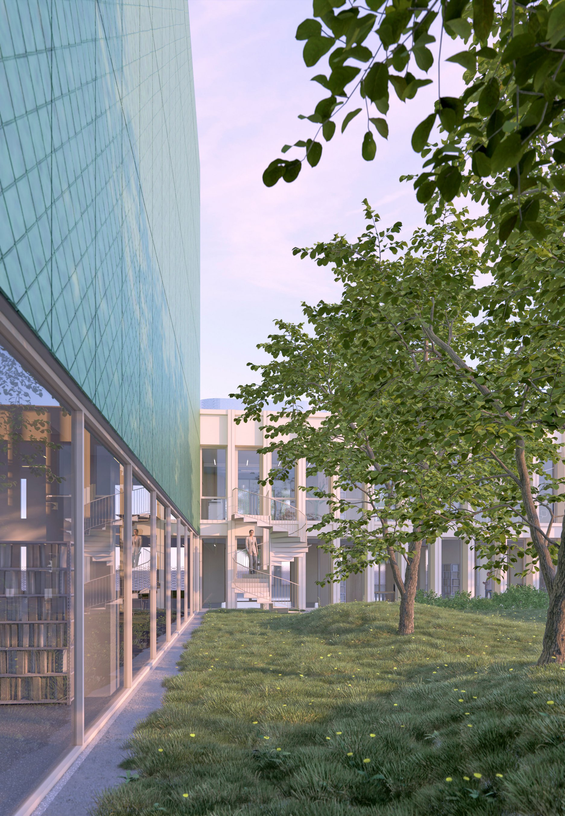 Vstupná časť objektu je orientovaná smerom k plánovanej vnútroareálovej komunikácii. Vstup tvorí priestranné foajé, z ktorého má návštevník možnosť nahliadnuť do nádvoria. Pre verejnosť je dostupná bádateľňa a tiež školiaca miestnosť dostupná priamo zo vstupnej haly.