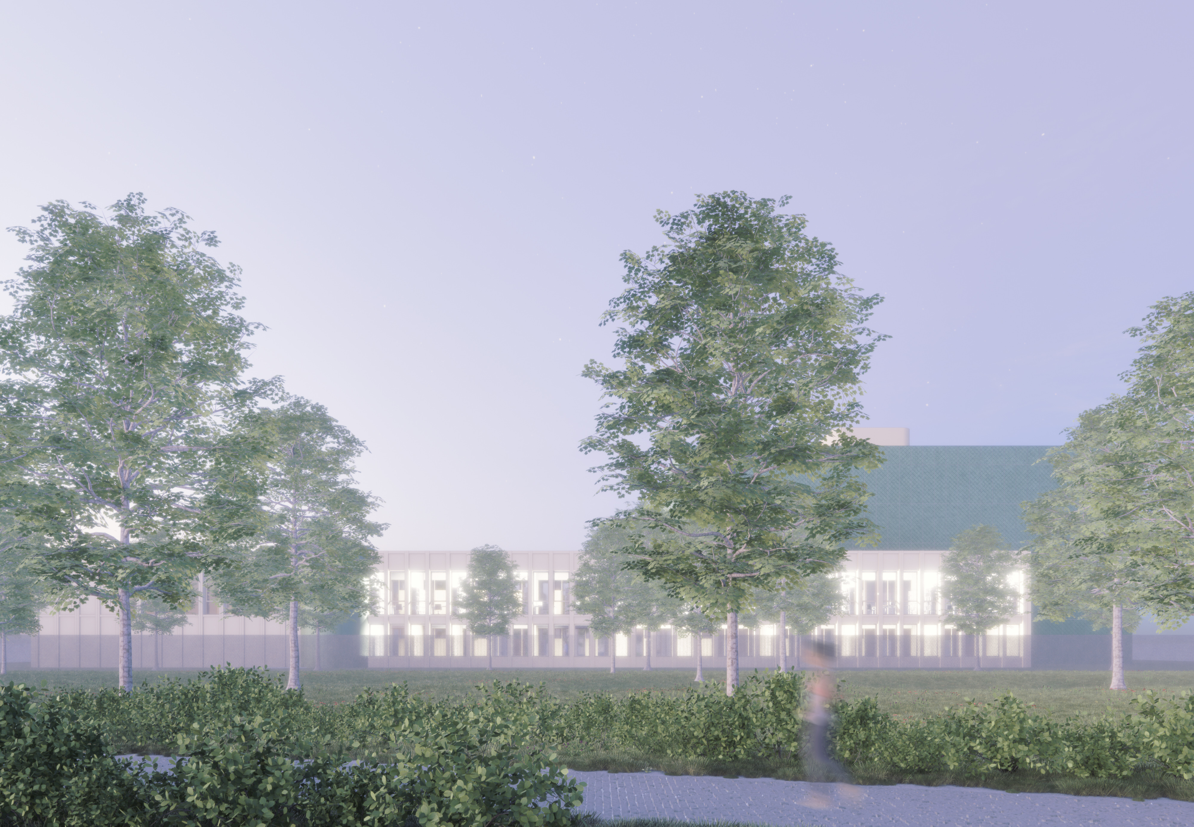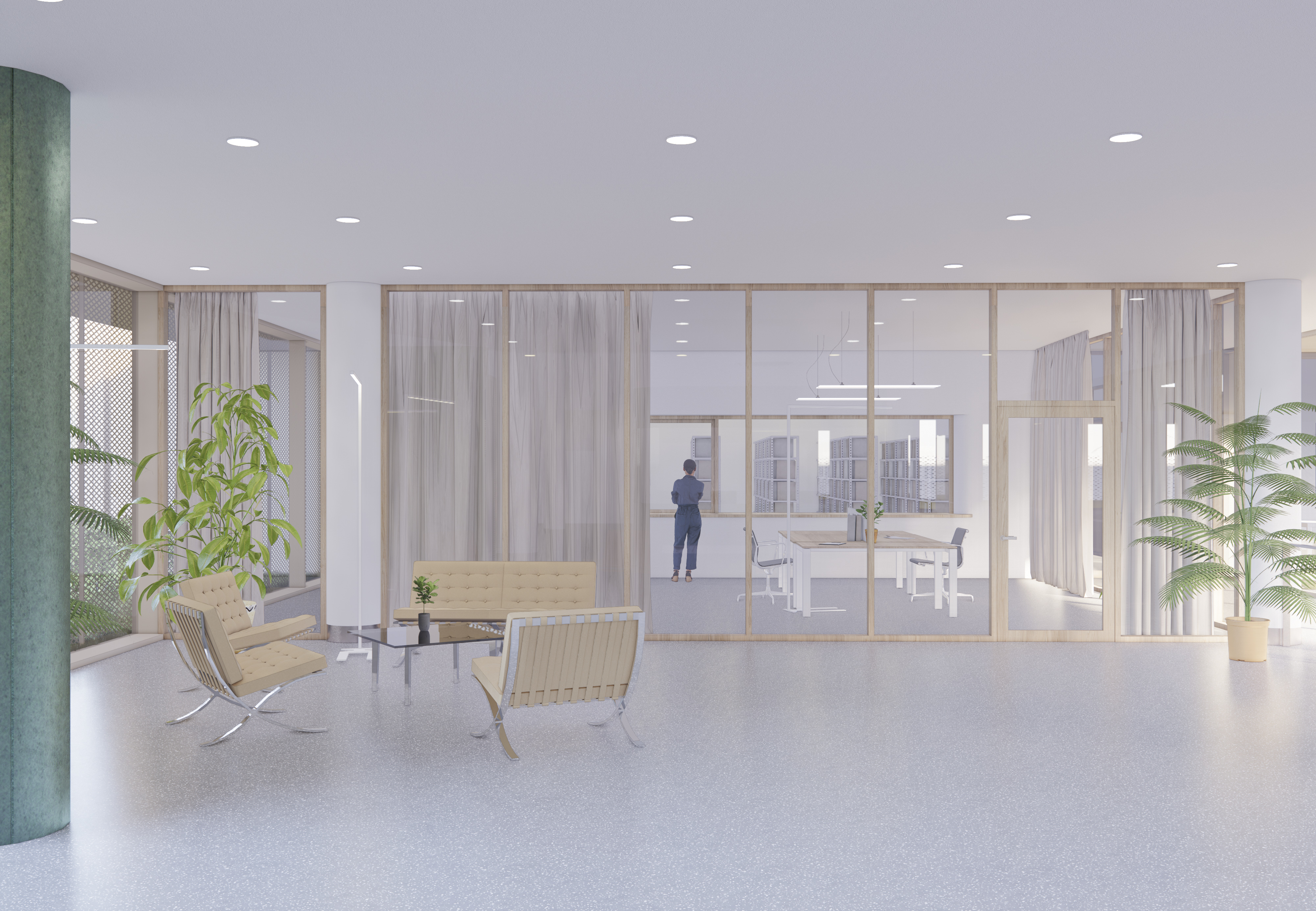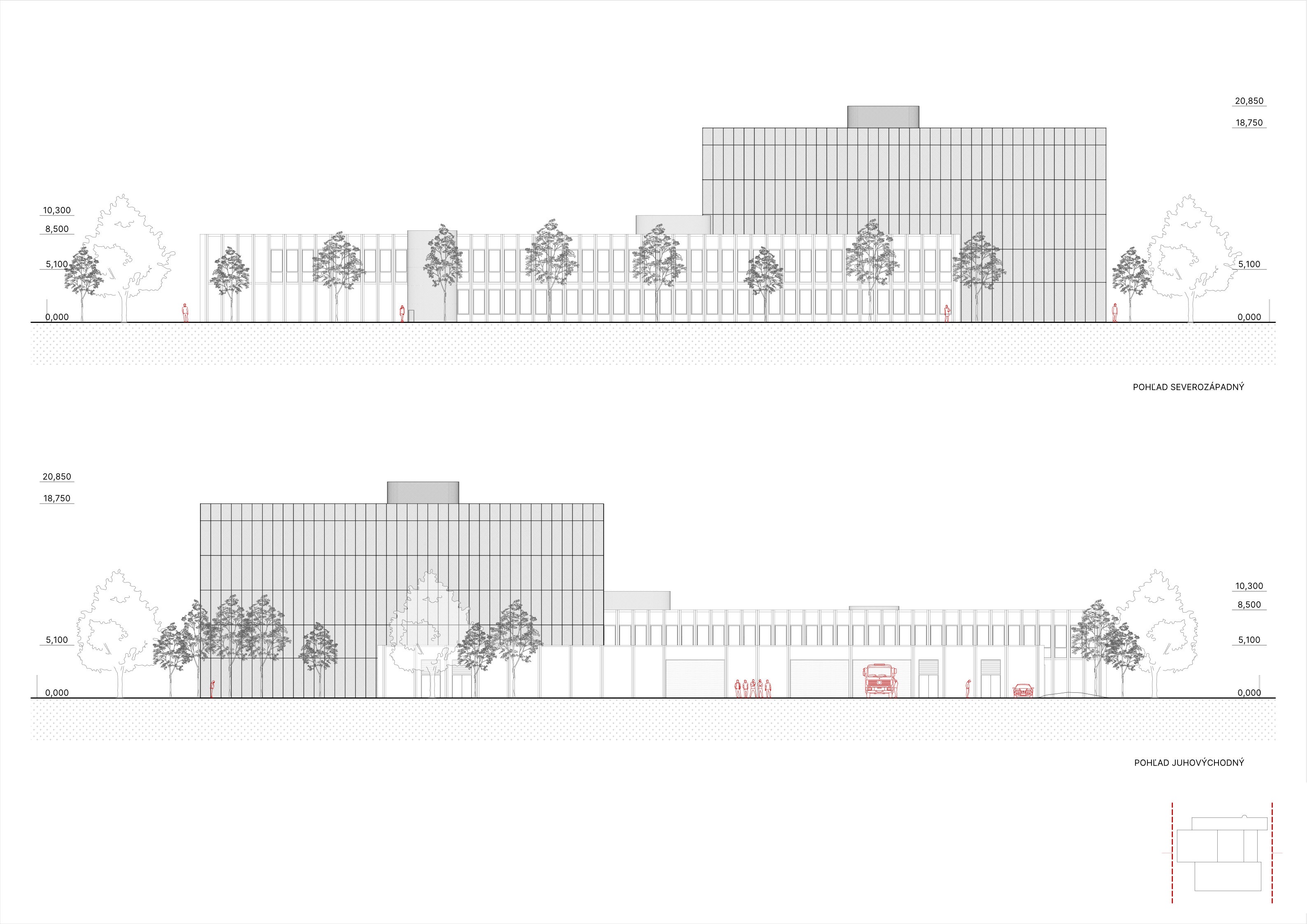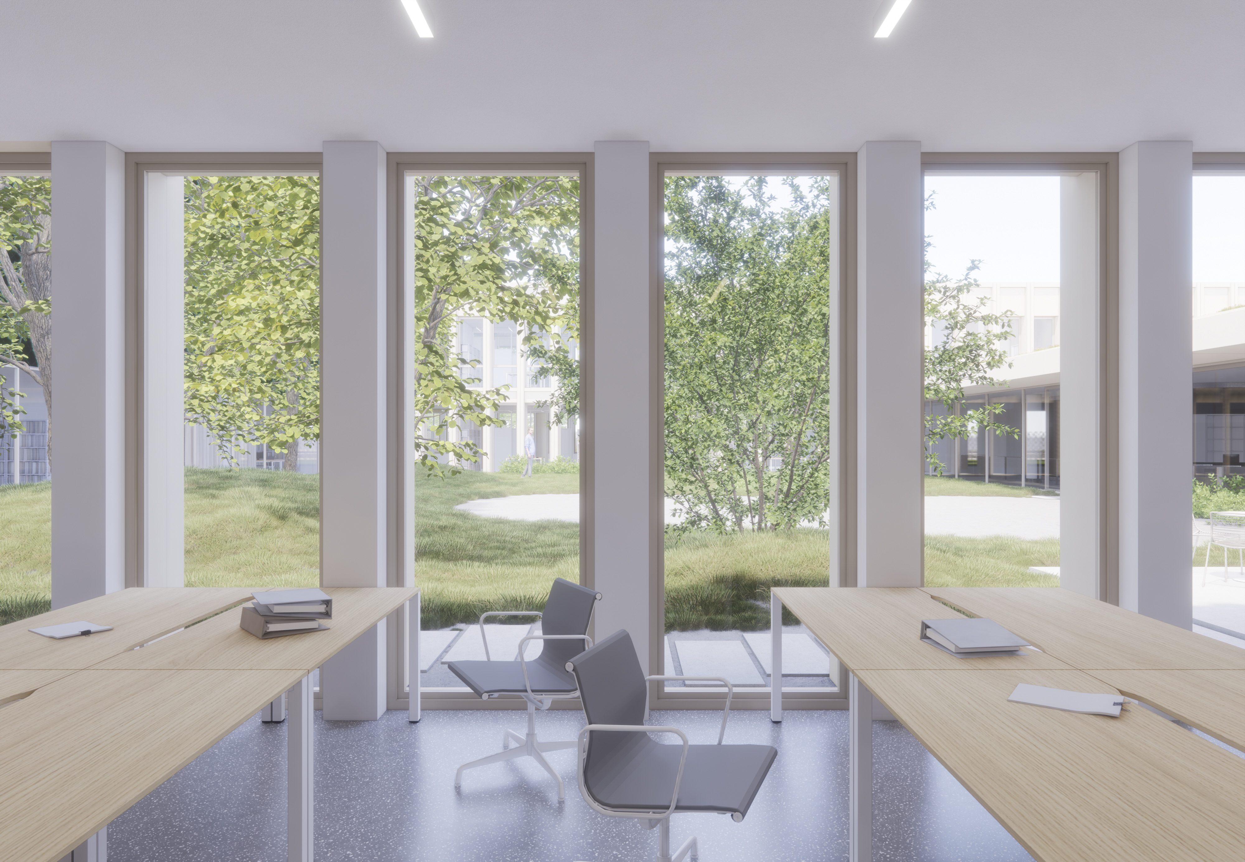 Vstupná časť objektu je orientovaná smerom k plánovanej vnútroareálovej komunikácii. Vstup tvorí priestranné foajé, z ktorého má návštevník možnosť nahliadnuť do nádvoria. Pre verejnosť je dostupná bádateľňa a tiež školiaca miestnosť dostupná priamo zo vstupnej haly.