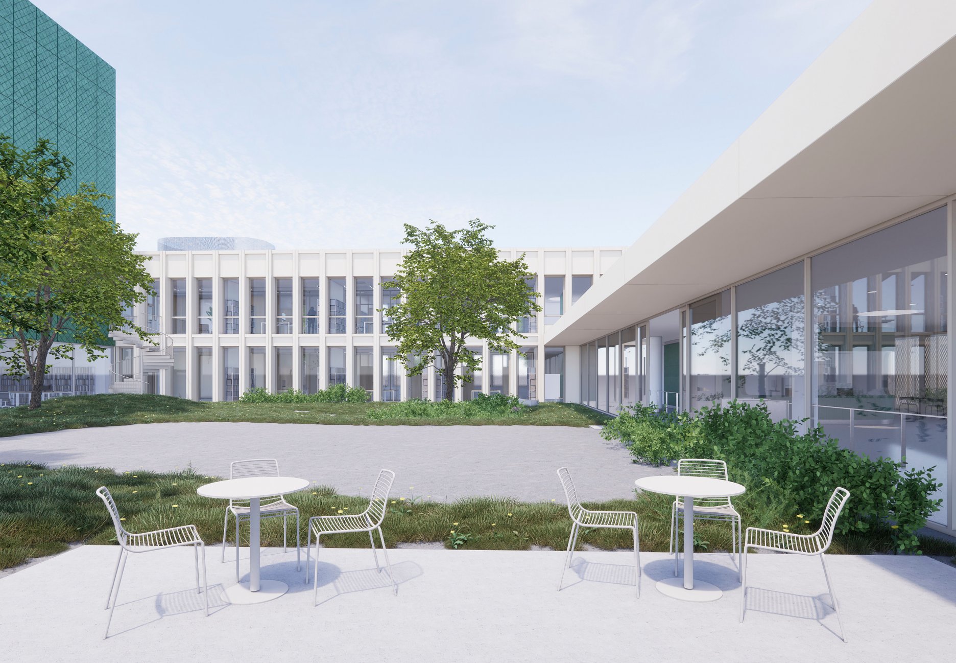 Nádvorie archívu v centre objektu vytvára prírodný exteriér obsahujúci veľkorysú zeleň doplnenú priepustnými spevnenými plochami. Spôsob využitia môže byť formálneho či neformálneho charakteru, prípadne na reprezentatívne účely MO. Cieľom bolo vytvoriť exteriérový priestor pre zamestnancov, oddelený od nehostinného okolia, ktorý svojim charakterom prirodzene reguluje mikroklímu celého objektu a kultivuje pracovné prostredie.
