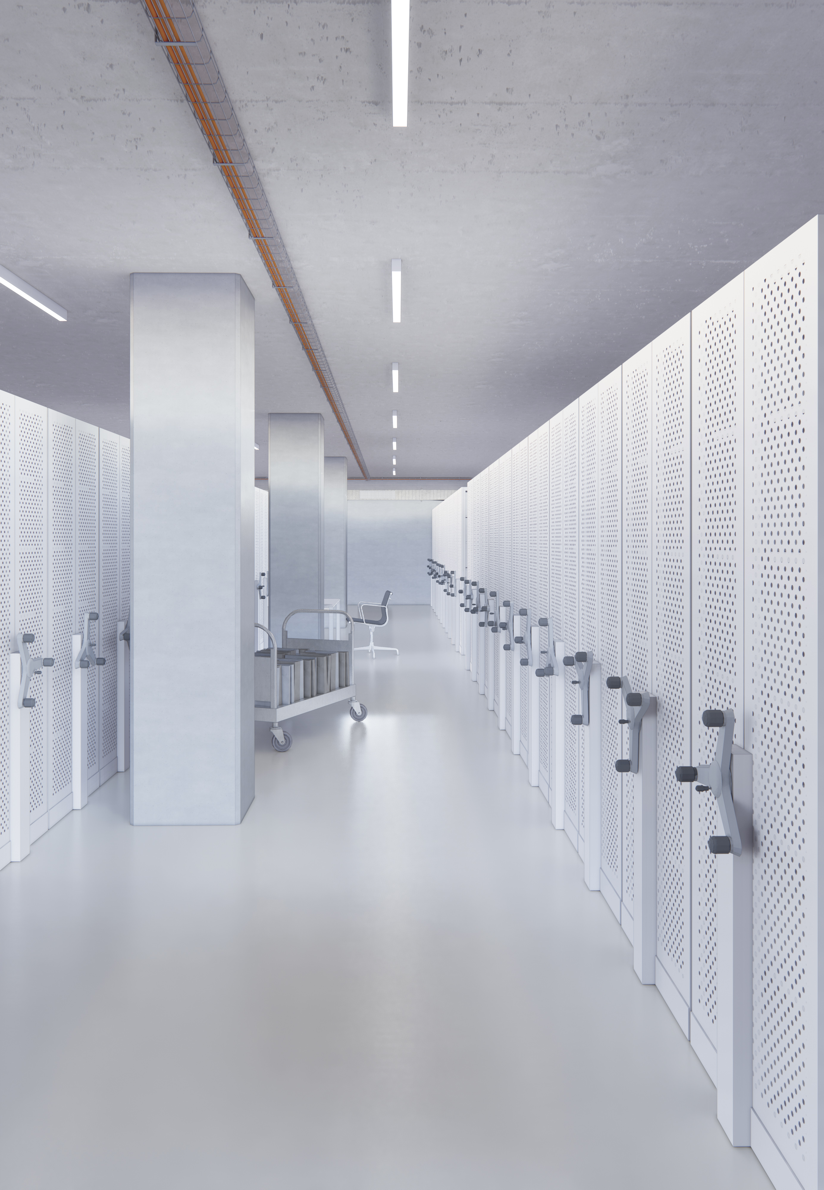 Depot (samotné archívy) tvoria dominantu objektu. Jednotlivé depoty sa rozkladajú na celkovo piatich nadzemných podlažiach, čo umožňuje minimalizovať horizontálne dochádzkové vzdialenosti – najmä v nadväznosti na technické krídlo a digitalizačnú technológiu na prízemí depotu. Kompaktný tvar budovy zároveň minimalizuje tepelné straty a umožňuje udržiavať stabilnú klímu. O zabezpečenie optimálnej výmeny vzduchu, vlhkosti a teploty sa stará päť samostatných vzduchotechnických jednotiek, ktoré sú na každom podlaží, čo sa praxou (Moravský Zemský archív v Brne) ukázalo ako efektívny systém vetrania. Kapacita depotov bola limitovaná požiarnou bezpečnosťou, tak aby v prípade požiaru boli prípadne škody čo najmenšie. Mechanické posuvné regálové systémy umožňujú vysokú efektivitu využitia priestoru, čo samozrejme prináša enormné zaťaženie nosného systému, ktorý je navrhovaný ako robustný železobetónový skelet stužený železobetónovými stenami.