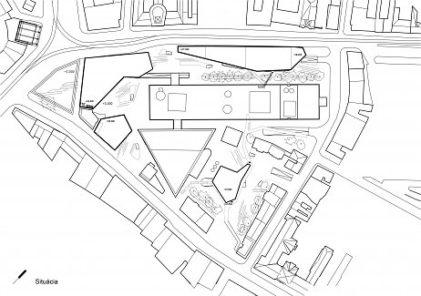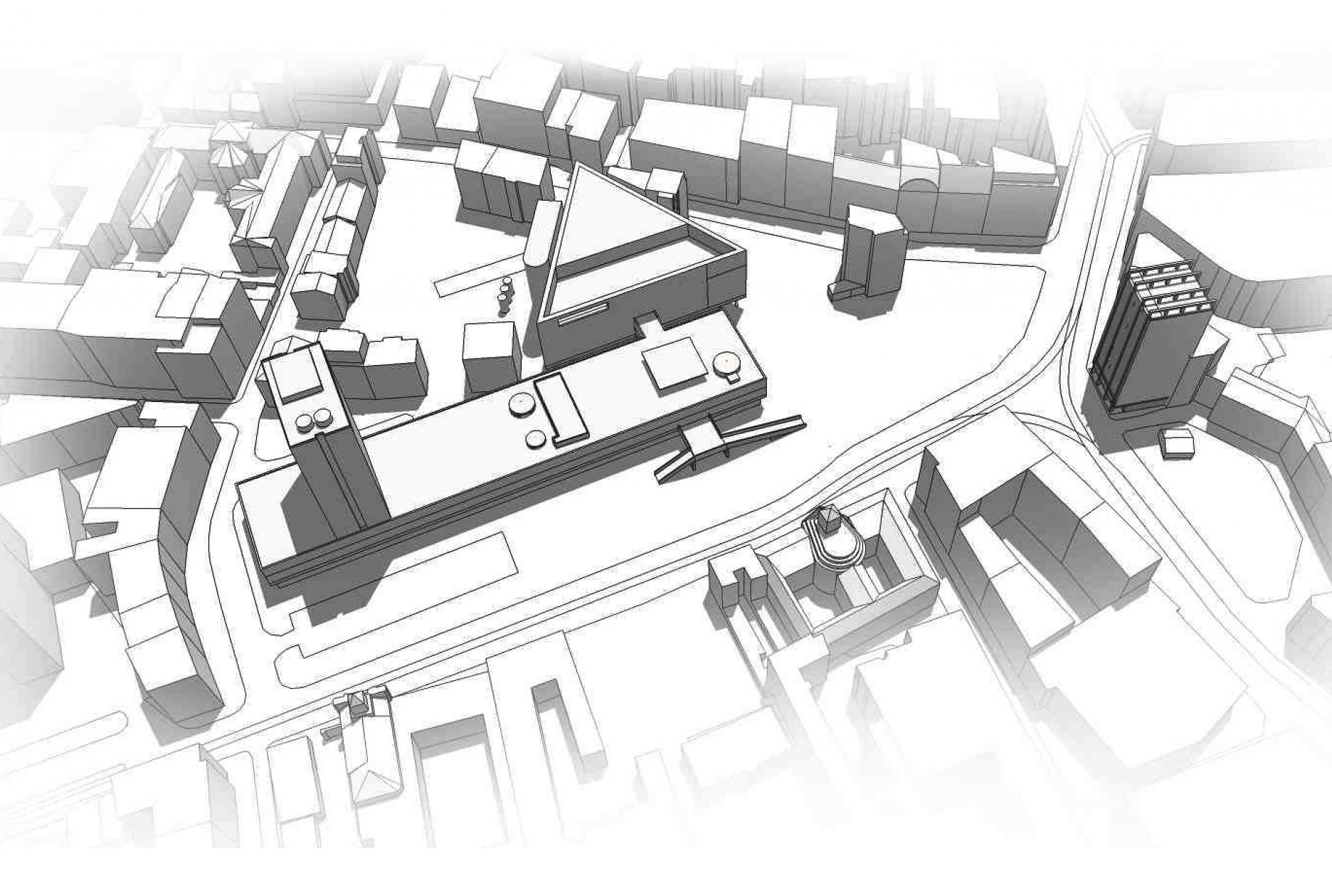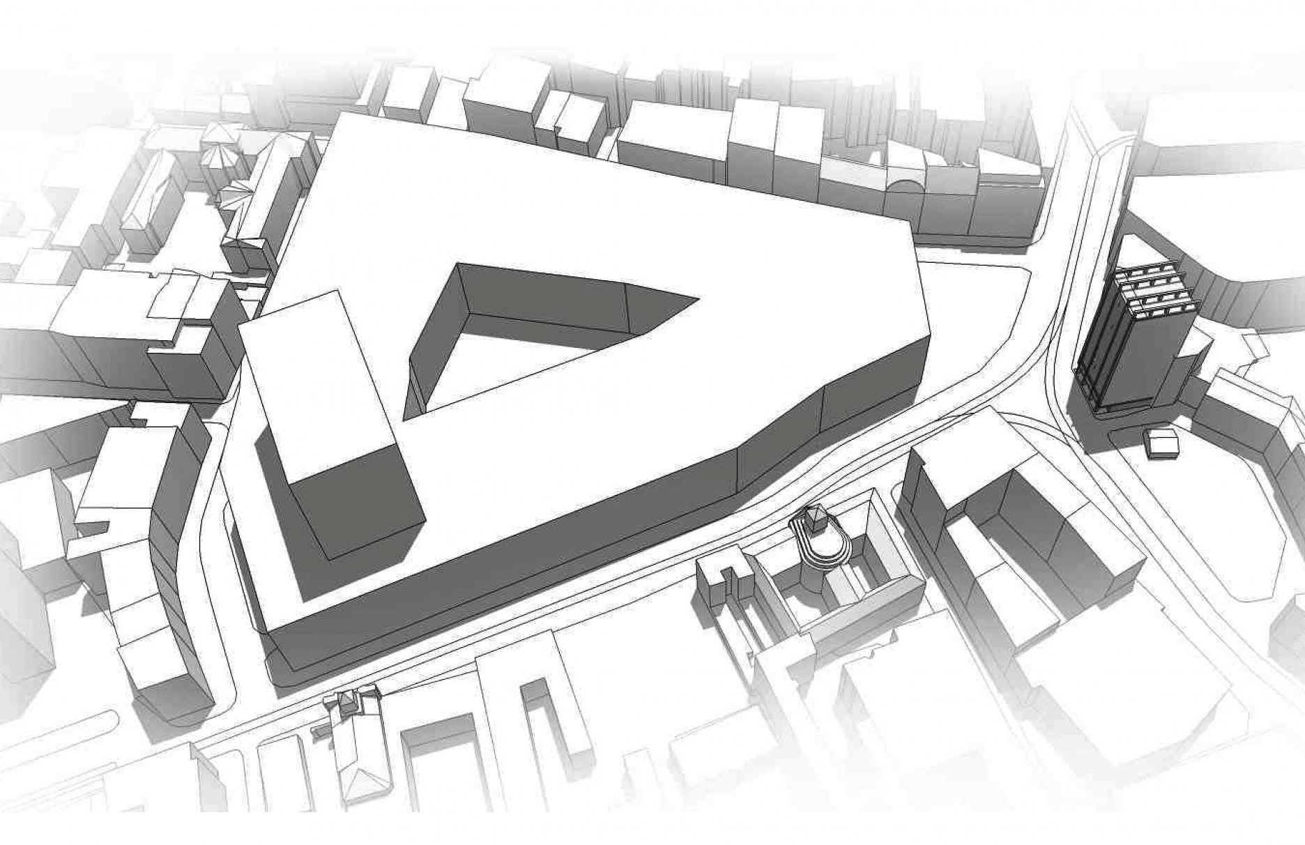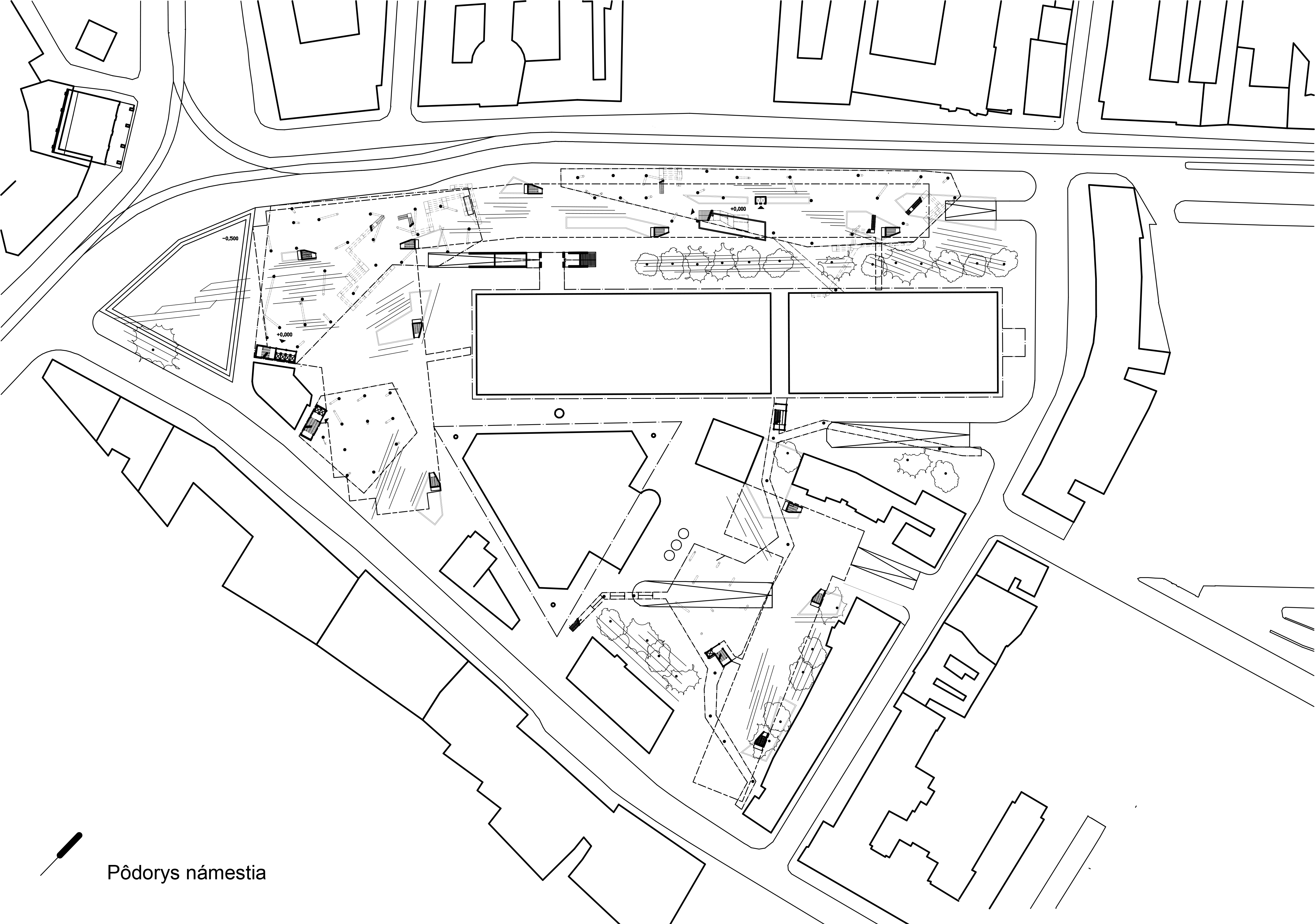 Ďalej nasleduje orezanie objektu nad pôvodným miestom Kamenného námestia. Ponechanie priestoru námestia bez "zastrešenia" pre lepšiu identifikáciu priestoru zostáva tradičným námestím, ktorým od nepamäti bolo, čo vyplýva zo širších vzťahov. Ako historický odkaz na minulosť je tvar pôvodného Kamenného námestia transformovaný do dlažby a je vytvorená plocha, ktorá je stupňovite členená smerom do zeme. Hmoty v mieste susediaceho so stranami fasád obytných bytových domov sa odstránia, aby sa zabránilo tieneniu budov. Rovnako tak vypustenie hmoty pozdĺž fasády obchodného domu, pre odkrytie kompozície diela. Vyľahčenie masy pozdĺž podnožia obchodného domu má mať za následok kompozične vyvážiť hmoty vo vzťahu hotela Kyjev. Ďalší minimalizovaním výšky objektov dochádza k presvetlenie a prevzdušnenie verejného priestoru v tesnej blízkosti Kamenného námestia, kde je najsilnejšia kumulácia ľudí.