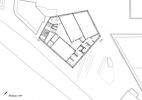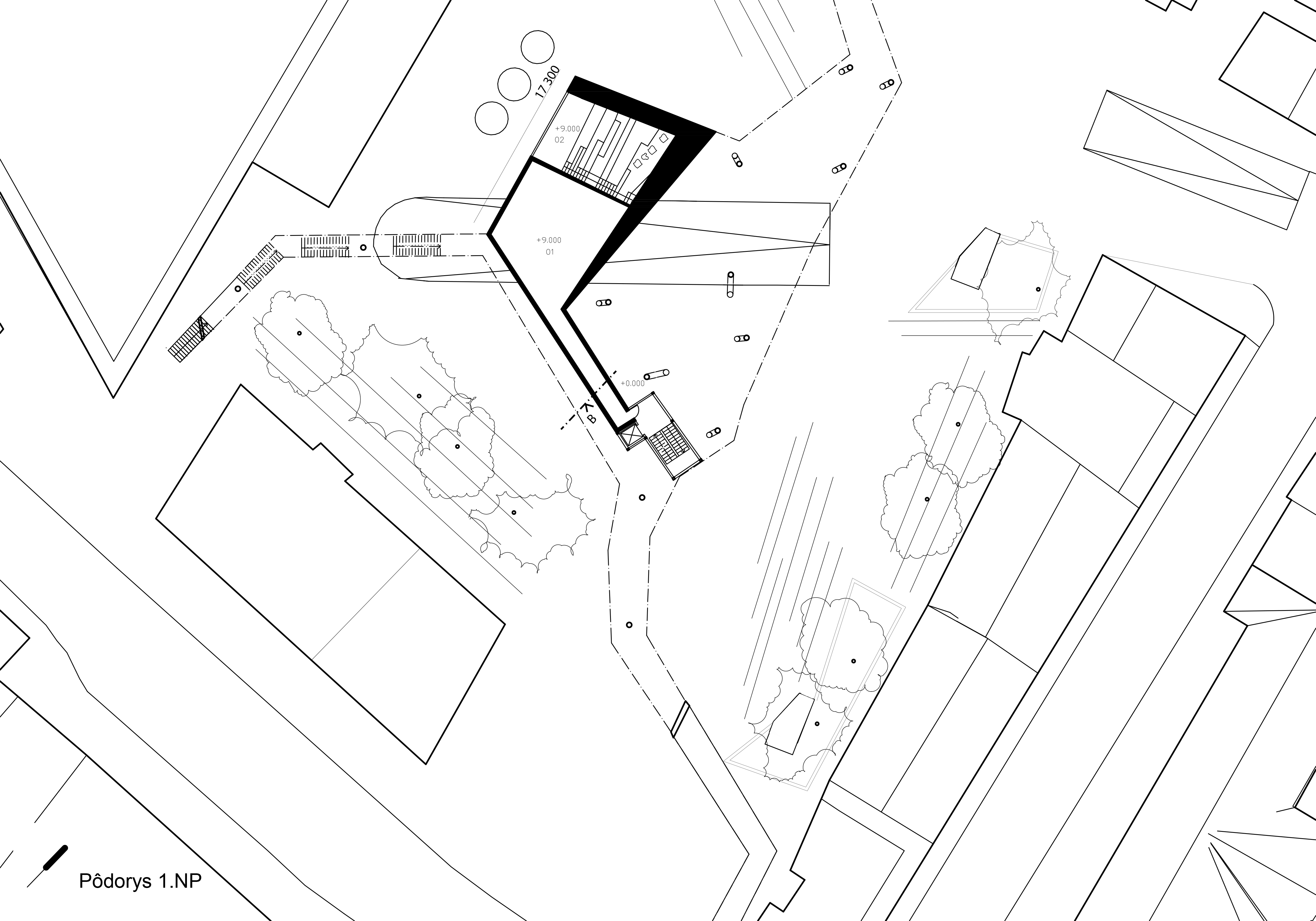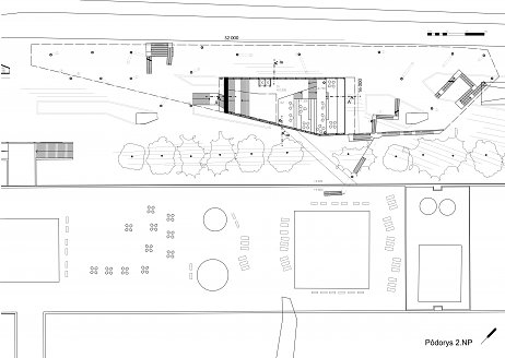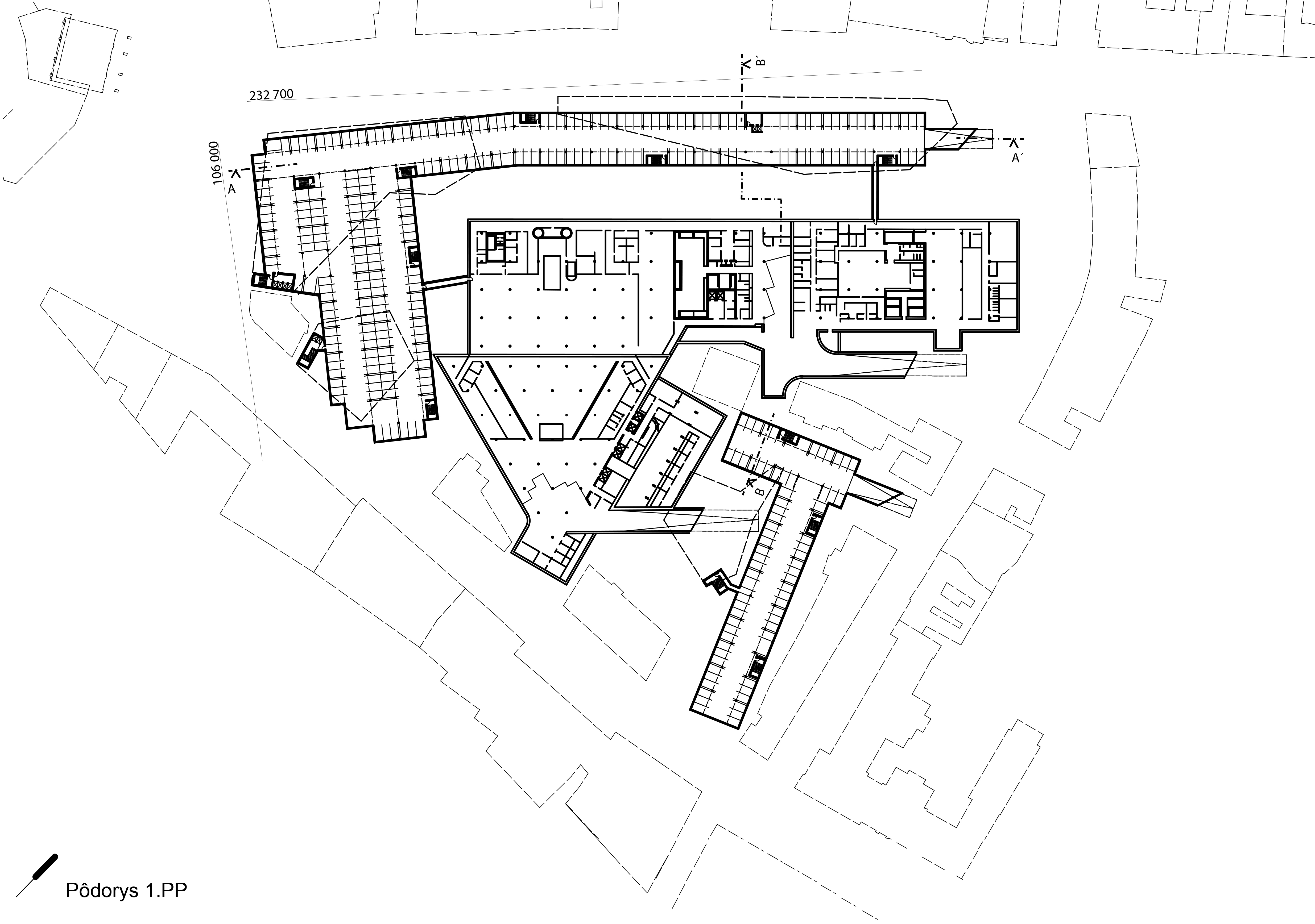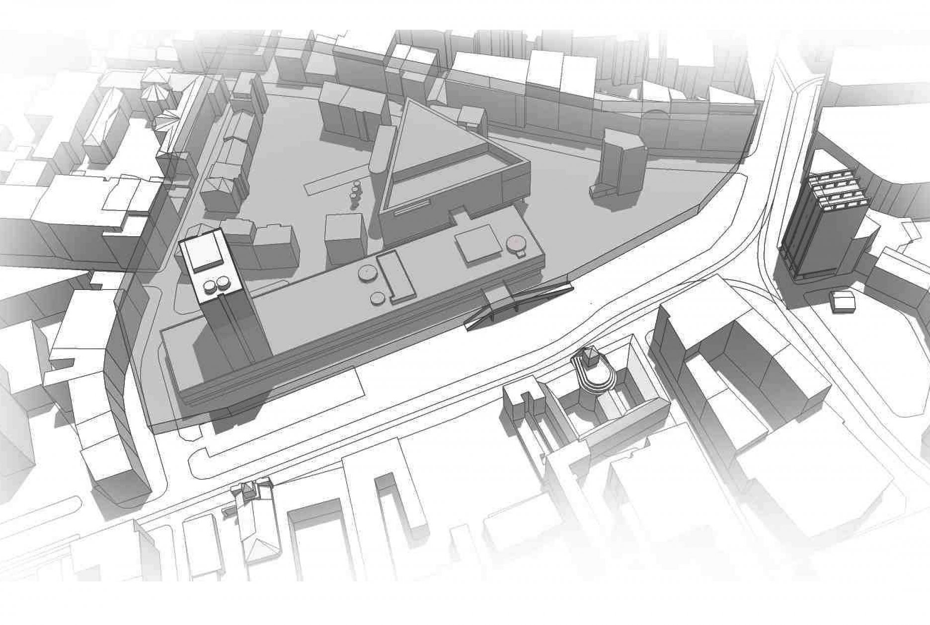 Ďalej nasleduje orezanie objektu nad pôvodným miestom Kamenného námestia. Ponechanie priestoru námestia bez "zastrešenia" pre lepšiu identifikáciu priestoru zostáva tradičným námestím, ktorým od nepamäti bolo, čo vyplýva zo širších vzťahov. Ako historický odkaz na minulosť je tvar pôvodného Kamenného námestia transformovaný do dlažby a je vytvorená plocha, ktorá je stupňovite členená smerom do zeme. Hmoty v mieste susediaceho so stranami fasád obytných bytových domov sa odstránia, aby sa zabránilo tieneniu budov. Rovnako tak vypustenie hmoty pozdĺž fasády obchodného domu, pre odkrytie kompozície diela. Vyľahčenie masy pozdĺž podnožia obchodného domu má mať za následok kompozične vyvážiť hmoty vo vzťahu hotela Kyjev. Ďalší minimalizovaním výšky objektov dochádza k presvetlenie a prevzdušnenie verejného priestoru v tesnej blízkosti Kamenného námestia, kde je najsilnejšia kumulácia ľudí.
