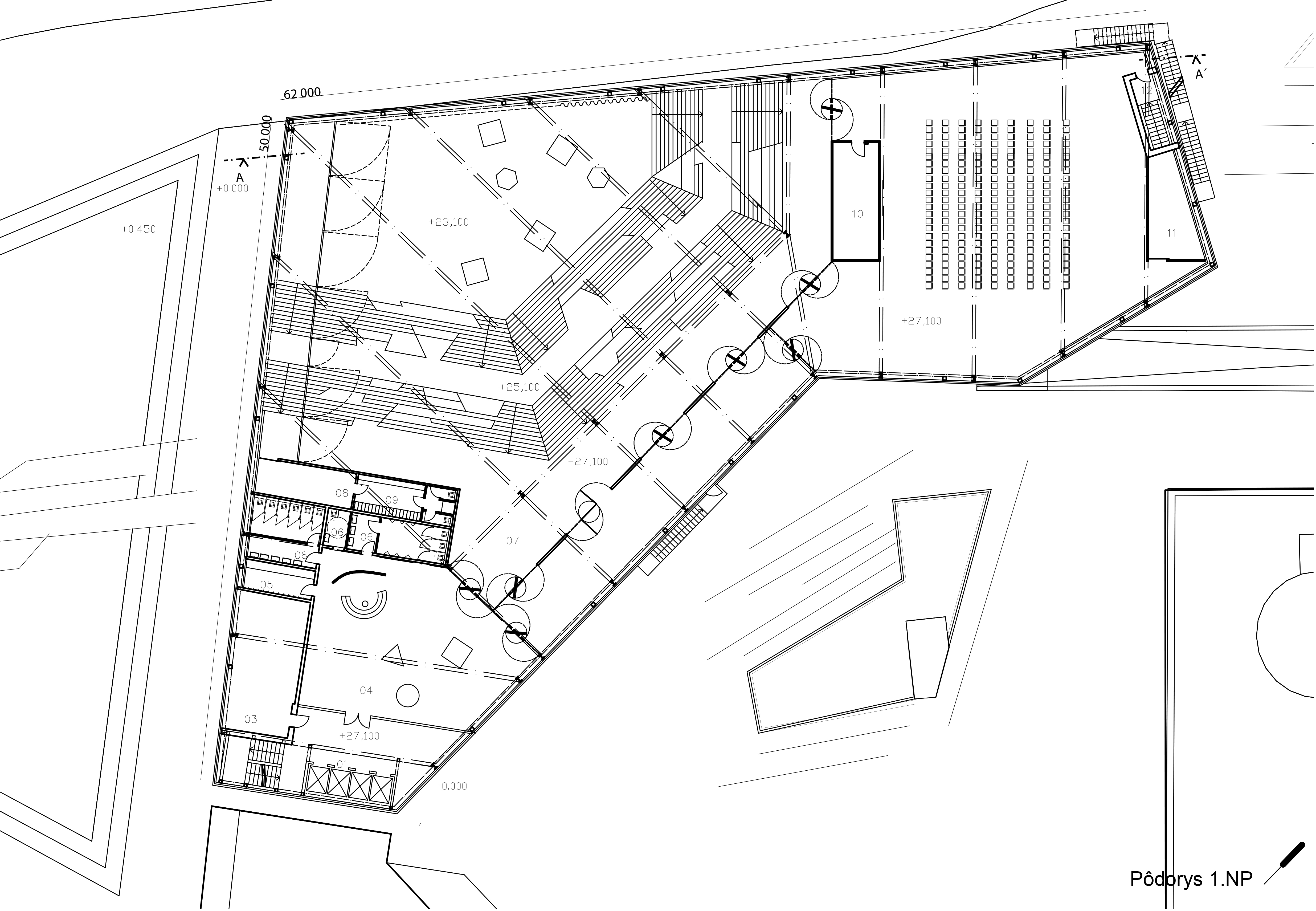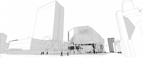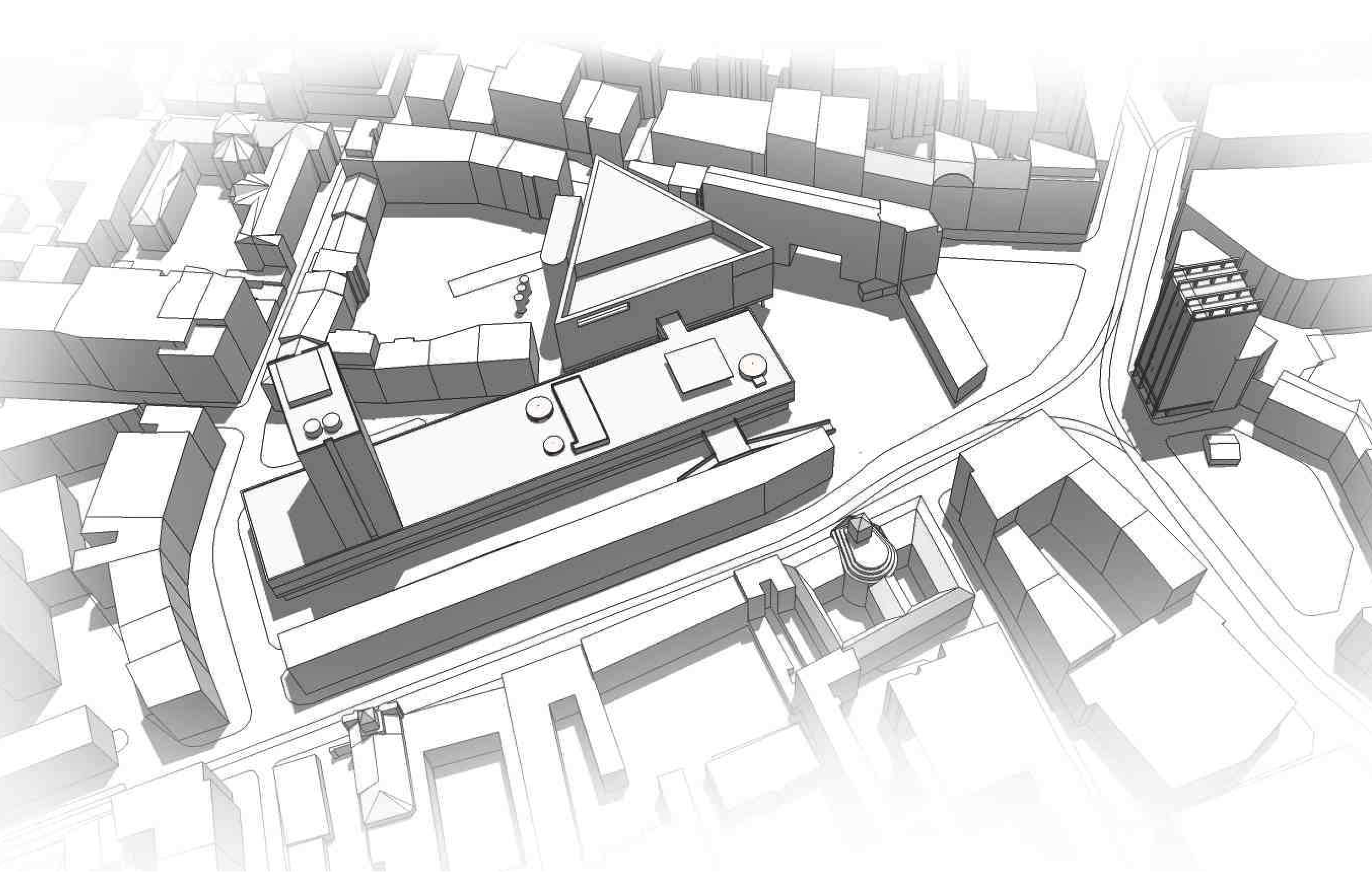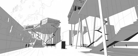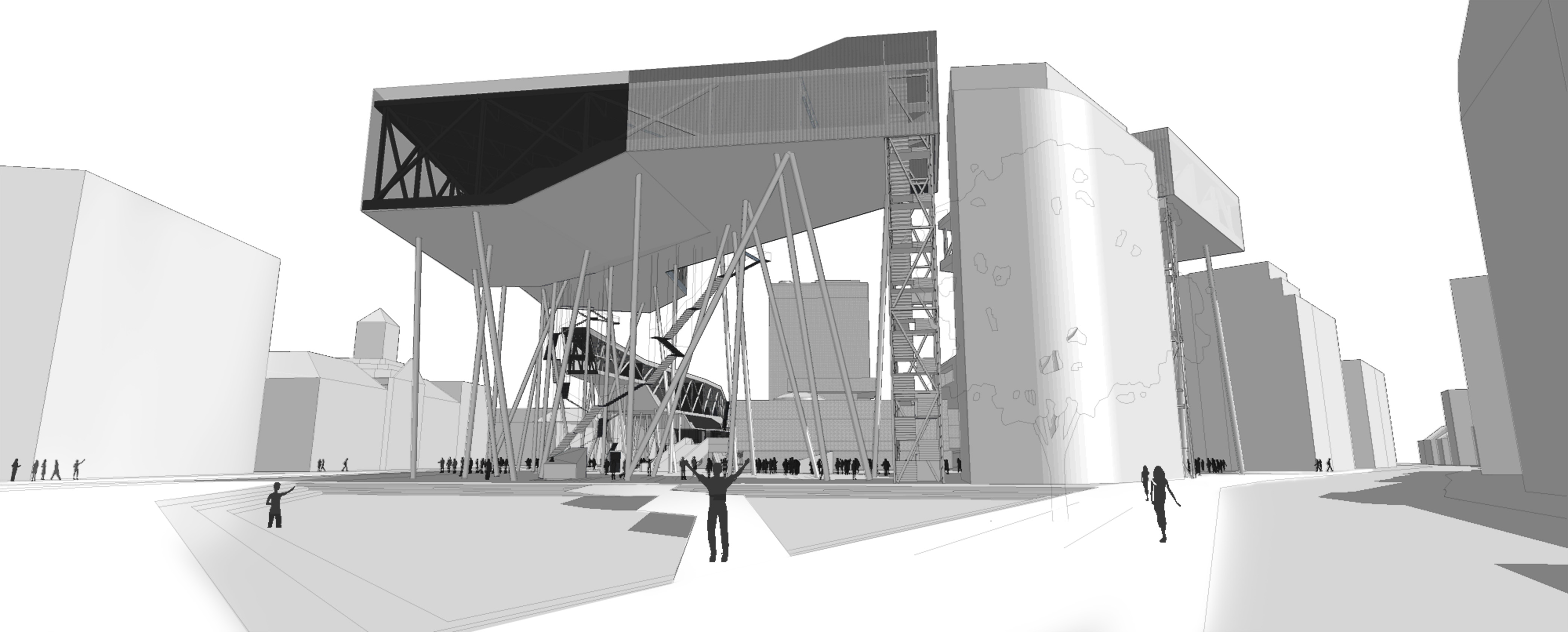 "Tento nový stavebný typ je zároveň verejnou budovou i námestím. Táto veži podobná stavba nesie ohromnú a vysokú strechu, ktorá sa klenie nad námestím i nad priestormi určenými pre občiansku aktivitu. Sú tu umiestnené sály, kaviarne, kluby, konferenčné miestnosti atď. Stavba vytvára dynamickú základňu a mestské centrum. Doplňuje tiež siluetu mesta. "