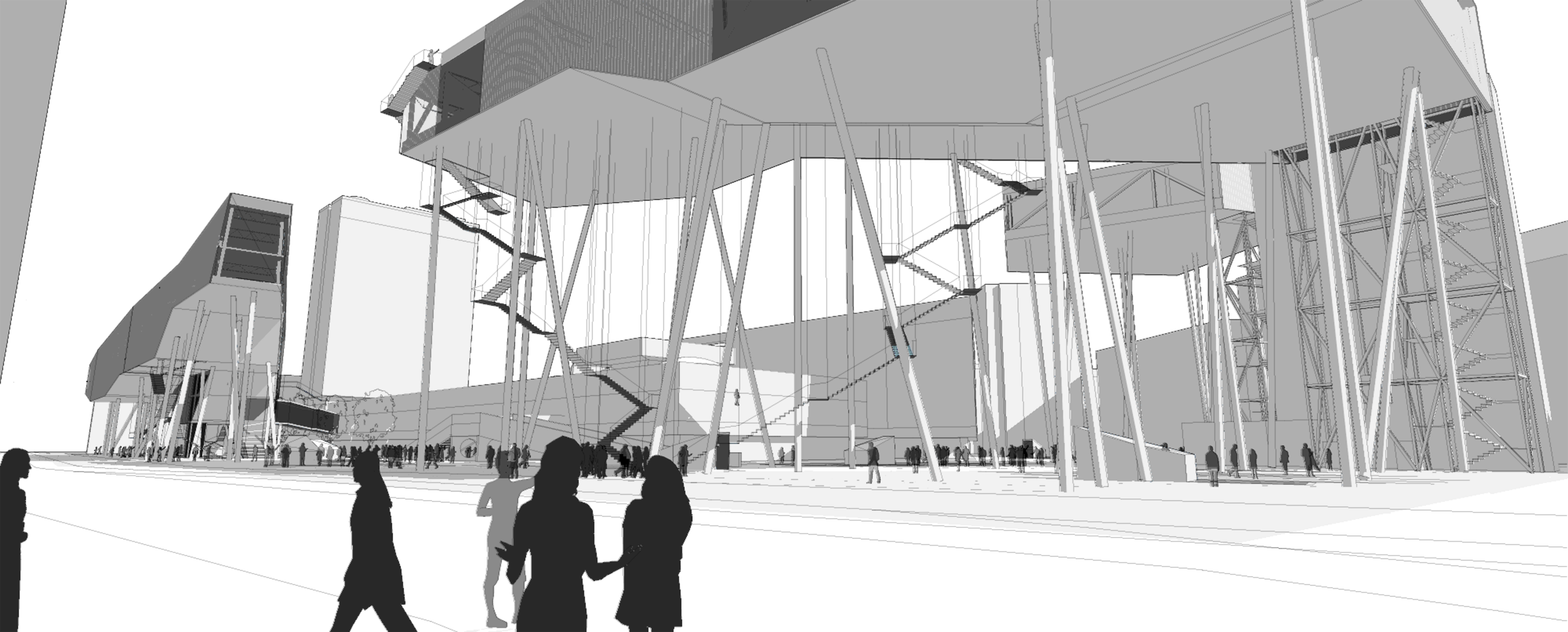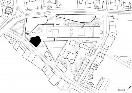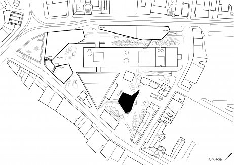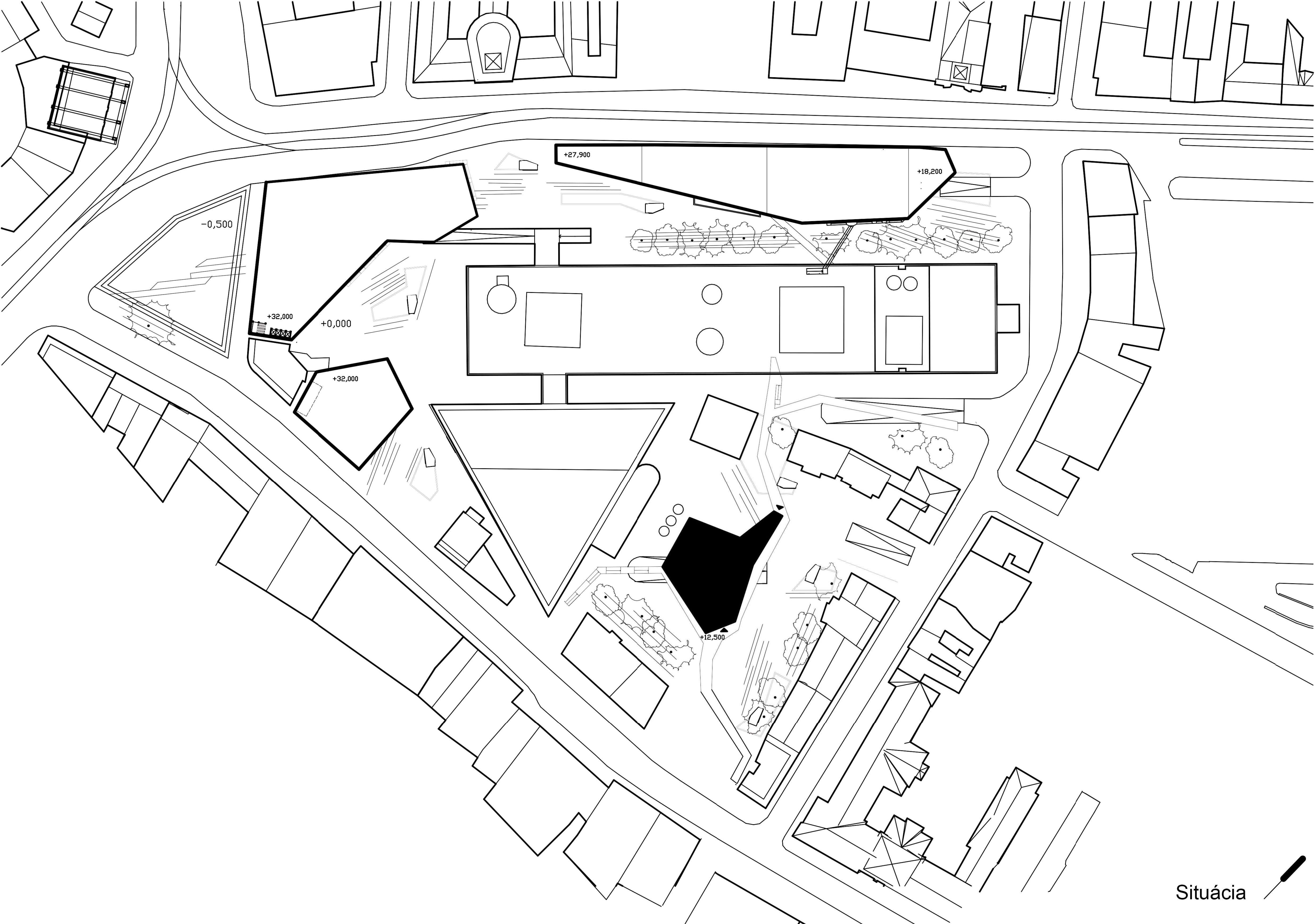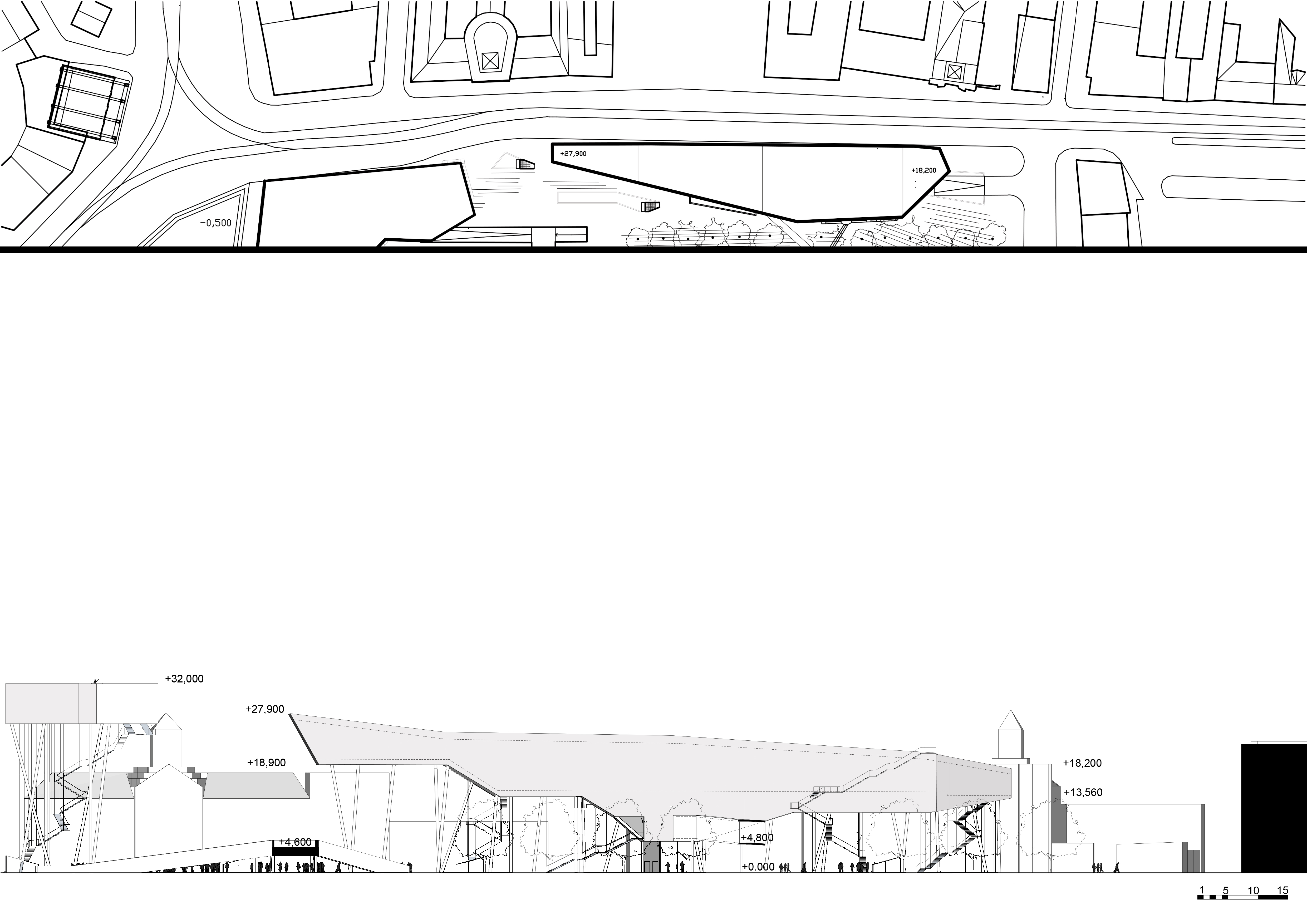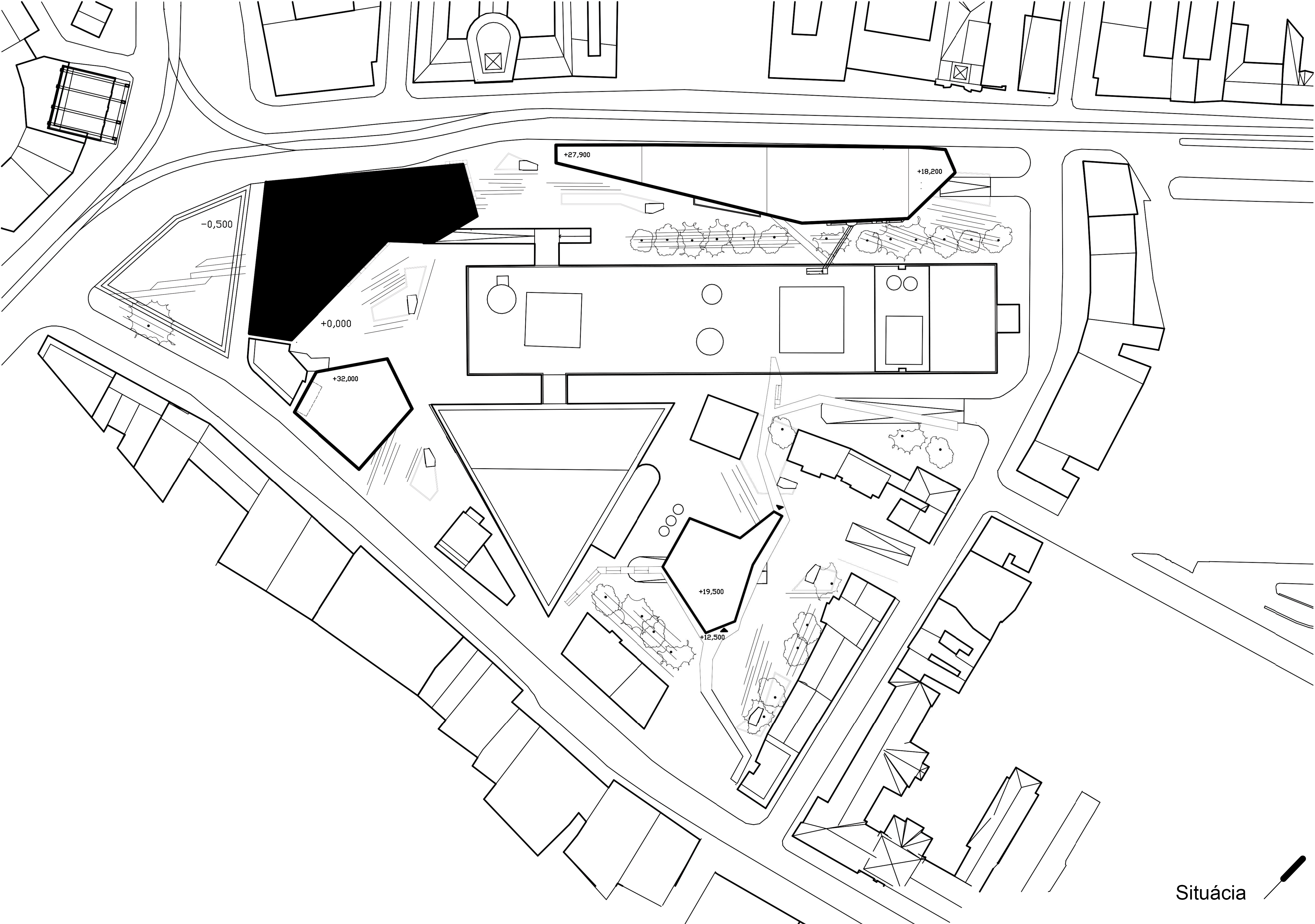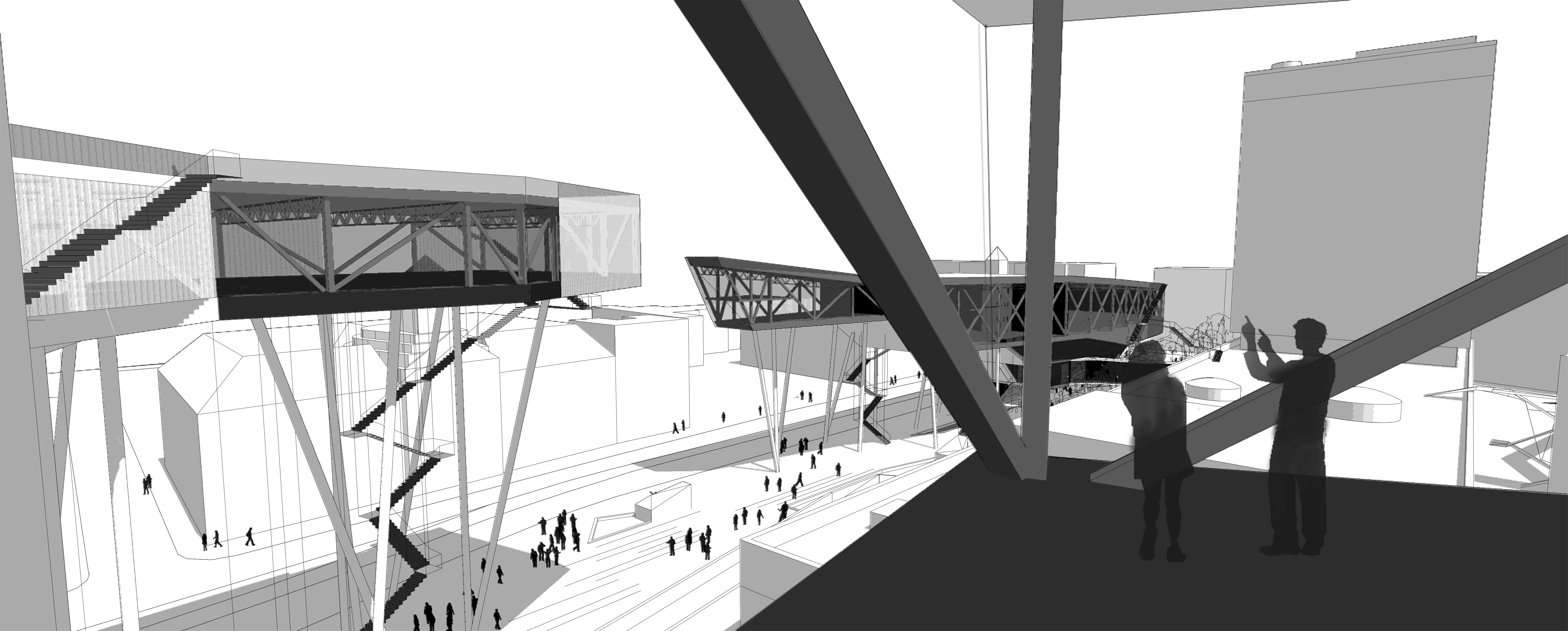 Nová, verejnosti prístupná výšková vrstva objektov umožňuje zažívanie verejného priestoru inak ako doposiaľ a vnímať tak aj celkovú panorámu mesta v srdci mesta a v neposlednej rade vnímať aj Matušíkovú architektúru, ktorá je integrovaná do celej skladby sprístupnením pochôdznej strechy s potenciálom nového využívania pomocou lávok vedúcich priamo na jej úroveň. Levitujúca architektúra je nesená tenkými stĺpmi, aby vznikal v čo najväčšej možnej miere dojem vznášania sa v oblakoch.
