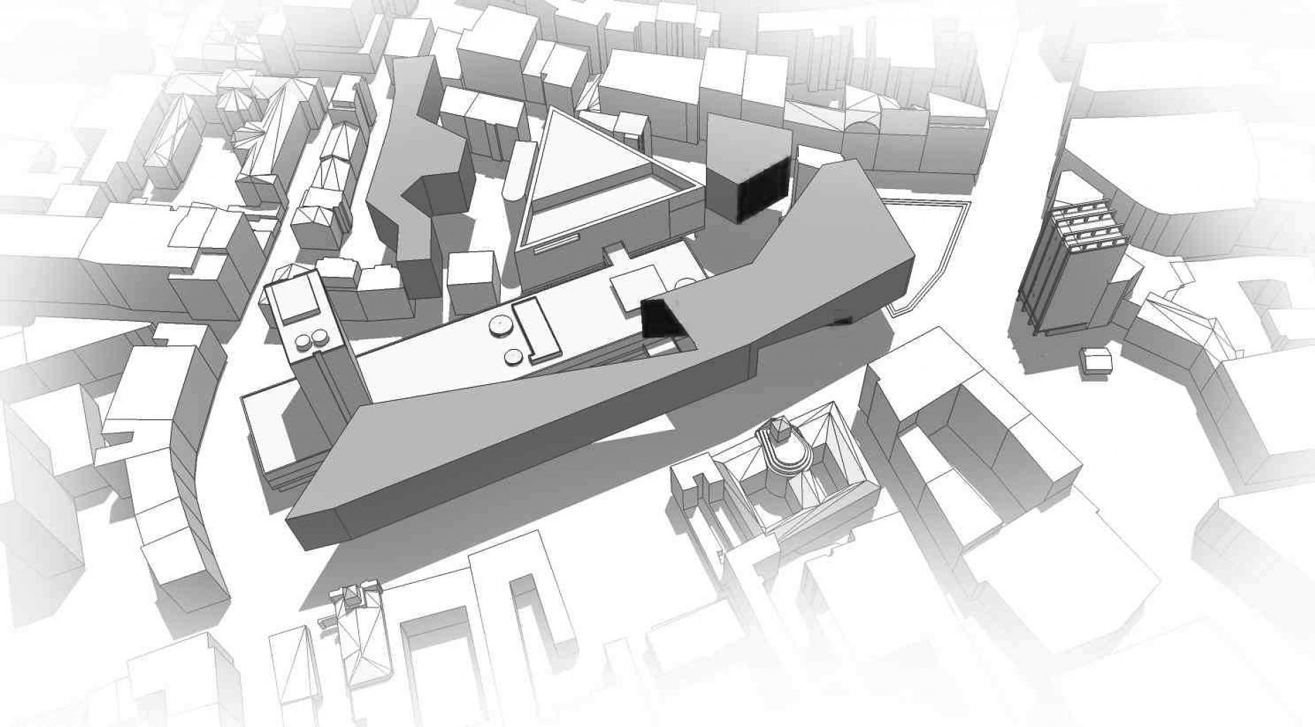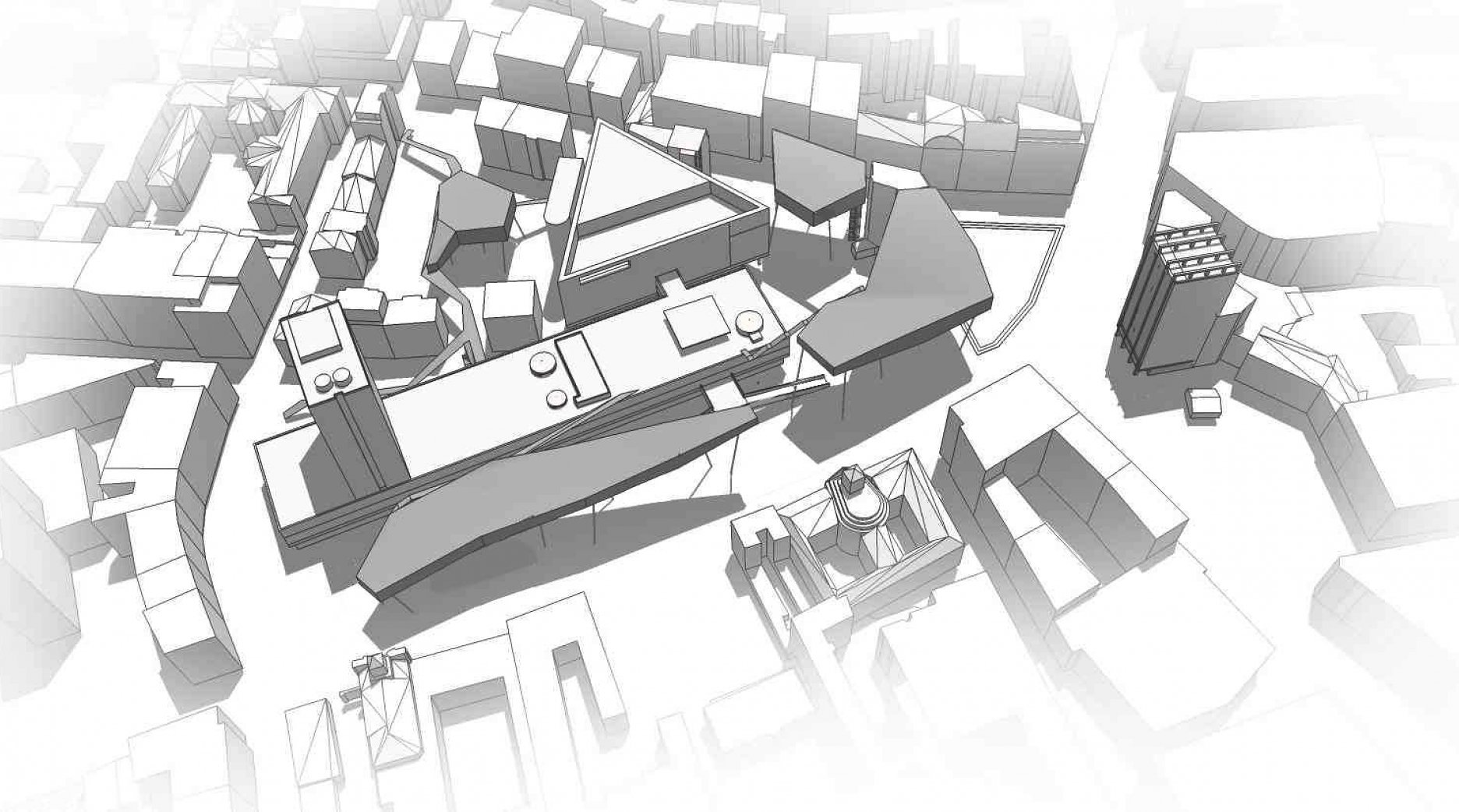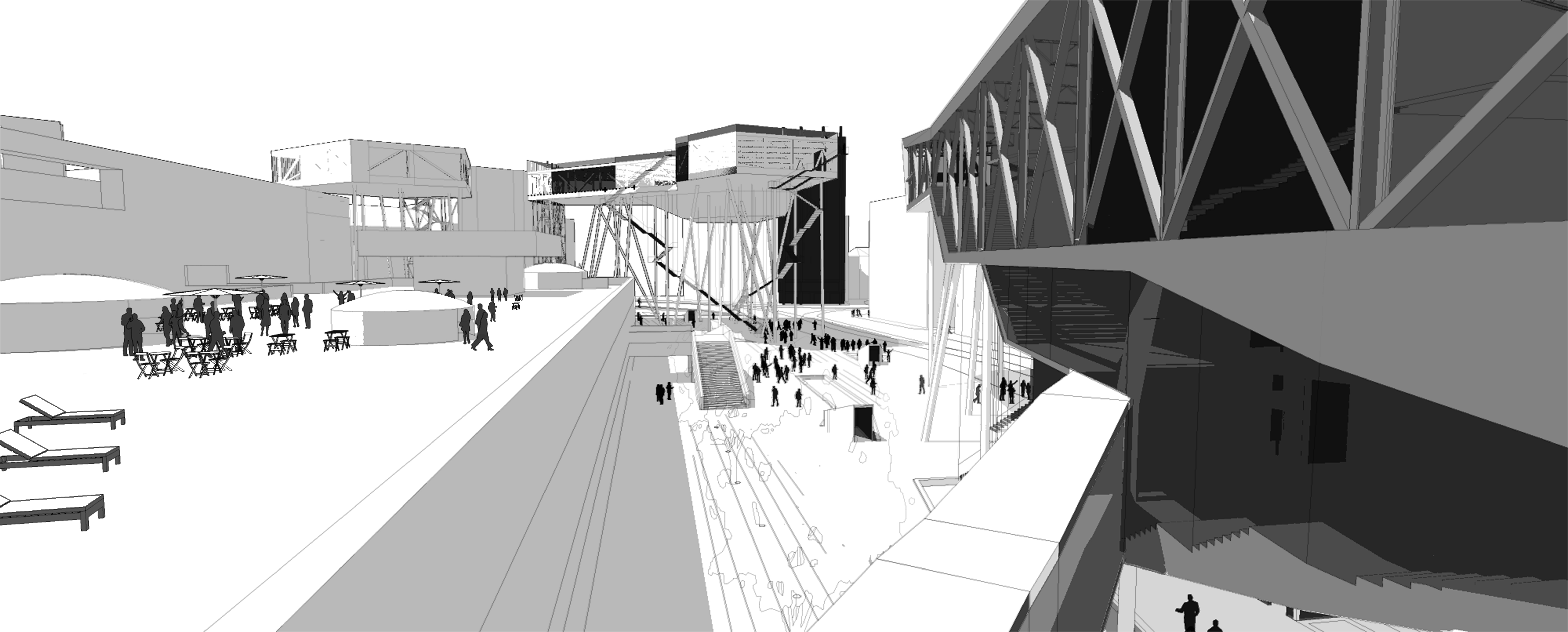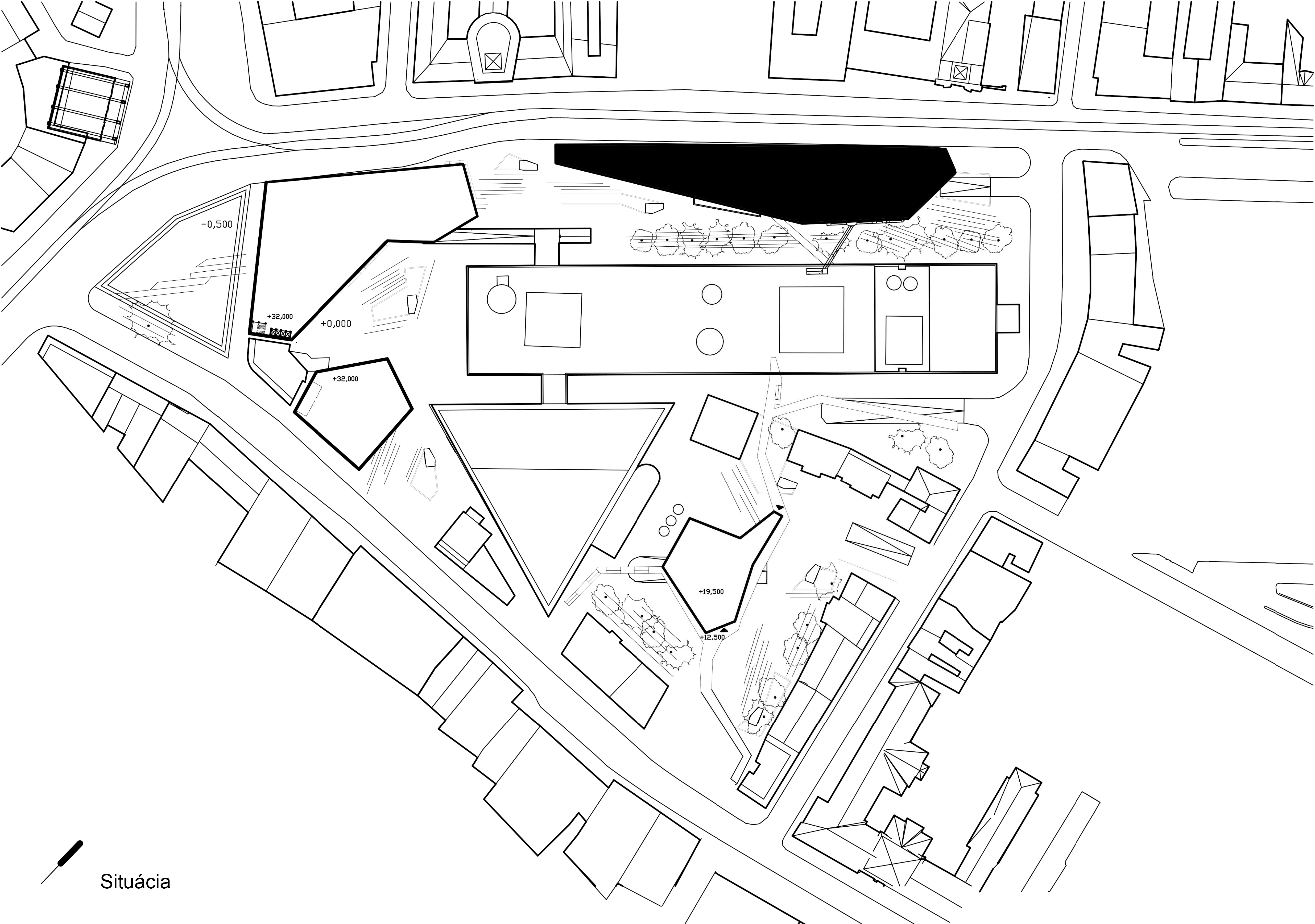 Nová, verejnosti prístupná výšková vrstva objektov umožňuje zažívanie verejného priestoru inak ako doposiaľ a vnímať tak aj celkovú panorámu mesta v srdci mesta a v neposlednej rade vnímať aj Matušíkovú architektúru, ktorá je integrovaná do celej skladby sprístupnením pochôdznej strechy s potenciálom nového využívania pomocou lávok vedúcich priamo na jej úroveň. Levitujúca architektúra je nesená tenkými stĺpmi, aby vznikal v čo najväčšej možnej miere dojem vznášania sa v oblakoch.