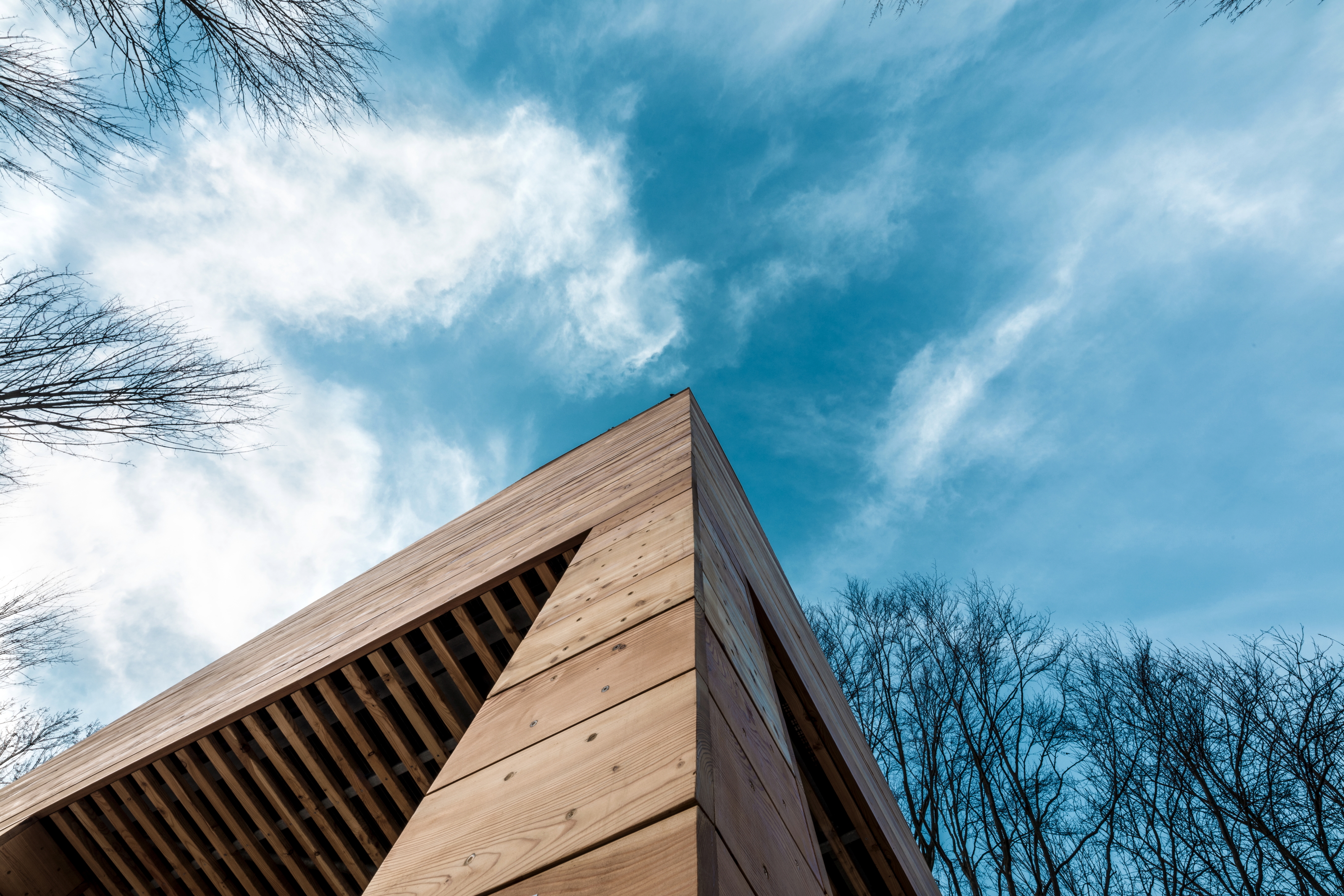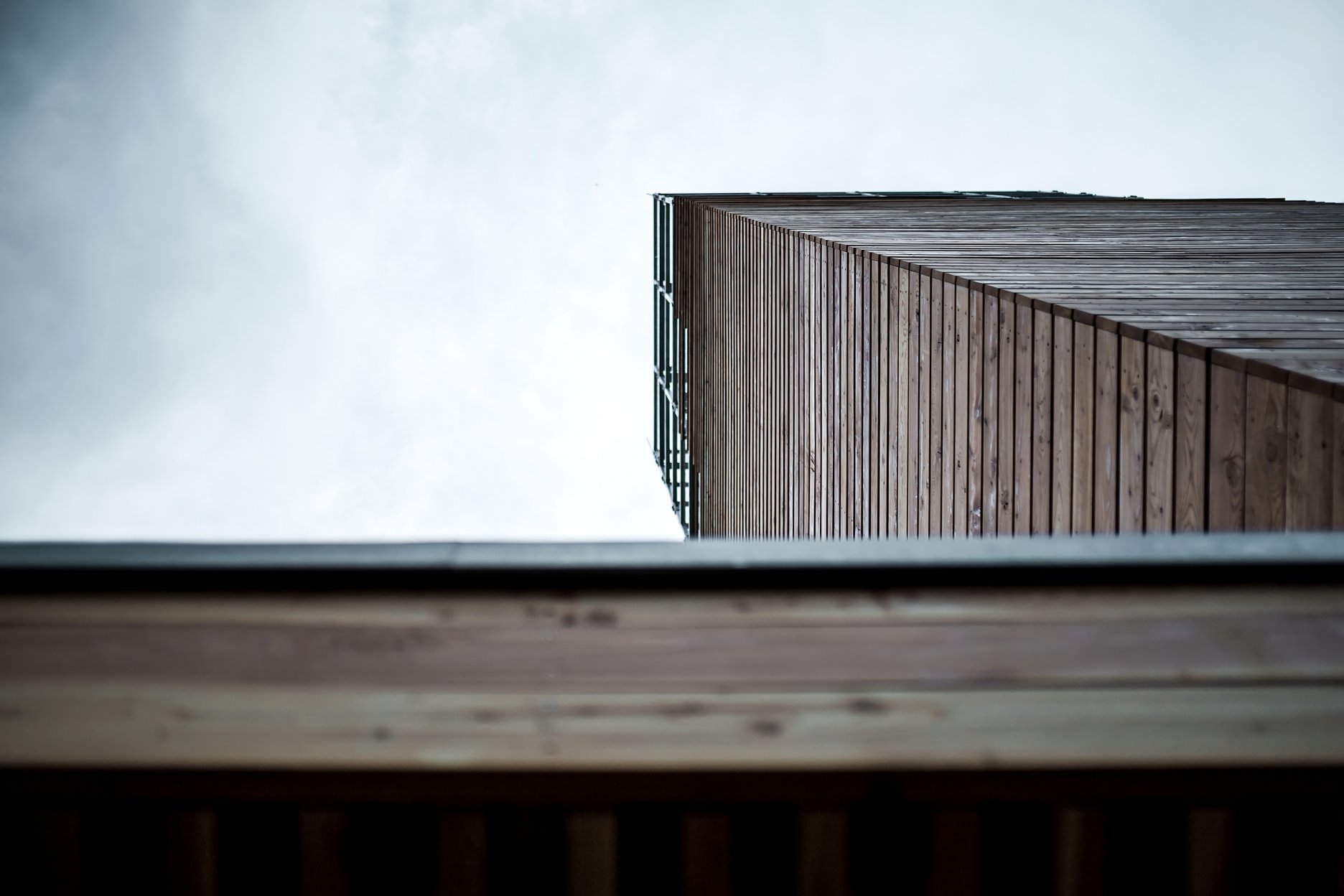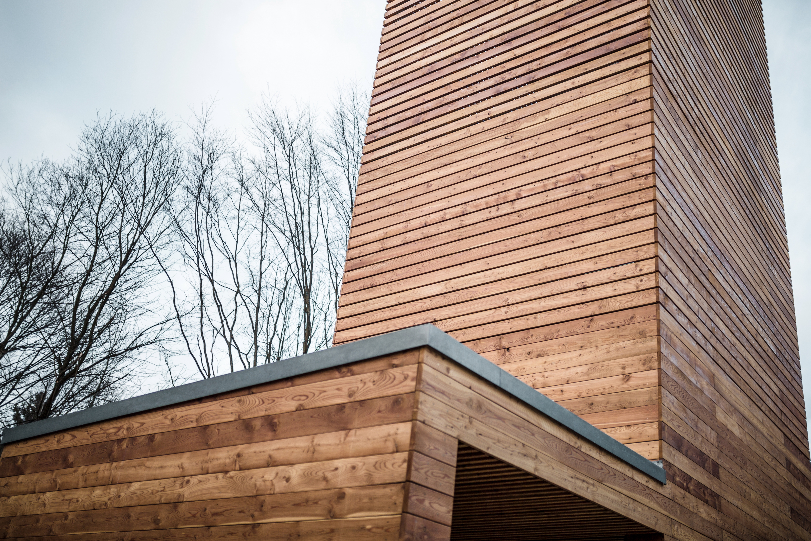 Veža je do výšky ôsmeho podlažia obložená dreveným obkladom, ktorý sa zo základného rozmeru 200 mm do výšky postupne otvára. Architekti zvolili do náročných podmienok smrekovcové laty ošetrené bezfarebným voskom. Laty sú upevnené o stĺpy a medzistĺpiky. Medzistĺpiky sú kĺbovo opreté o nosnú konštrukciu.