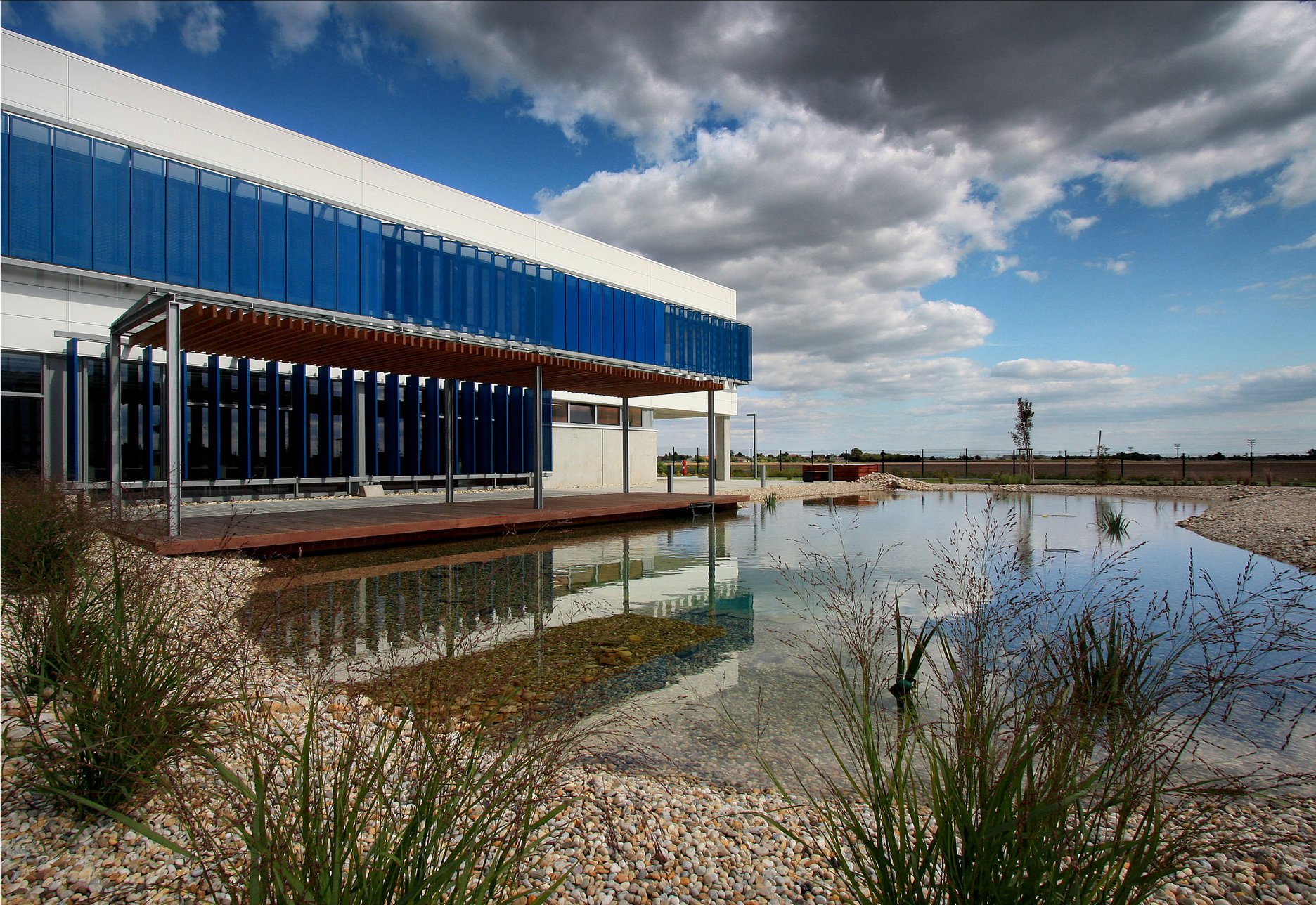 Kancelárie, zasadačka, jedáleň, vstupná hala sú orientované k priestoru s vodnou plochou a drevenou terasou, ktorá je zvýraznená a chránená pergolou. Fasádu tvoria metalické sendvičové panely, panely z pohľadového betónu a obklad z CEMBRIT-u. Okná sú hliníkové. Hala je obložená metalickými sendvičovými panelmi s modulmi z oceľového lankového rastra pre popínavé rastliny. Netradičné je aj riešenie átria v strede priemyselnej haly, pre získanie prírodného svetla pre kancelárie výroby umiestnenej okolo átria, ktoré slúži zároveň aj pre pobyt a relax počas krátkych prestávok pracovného dňa.