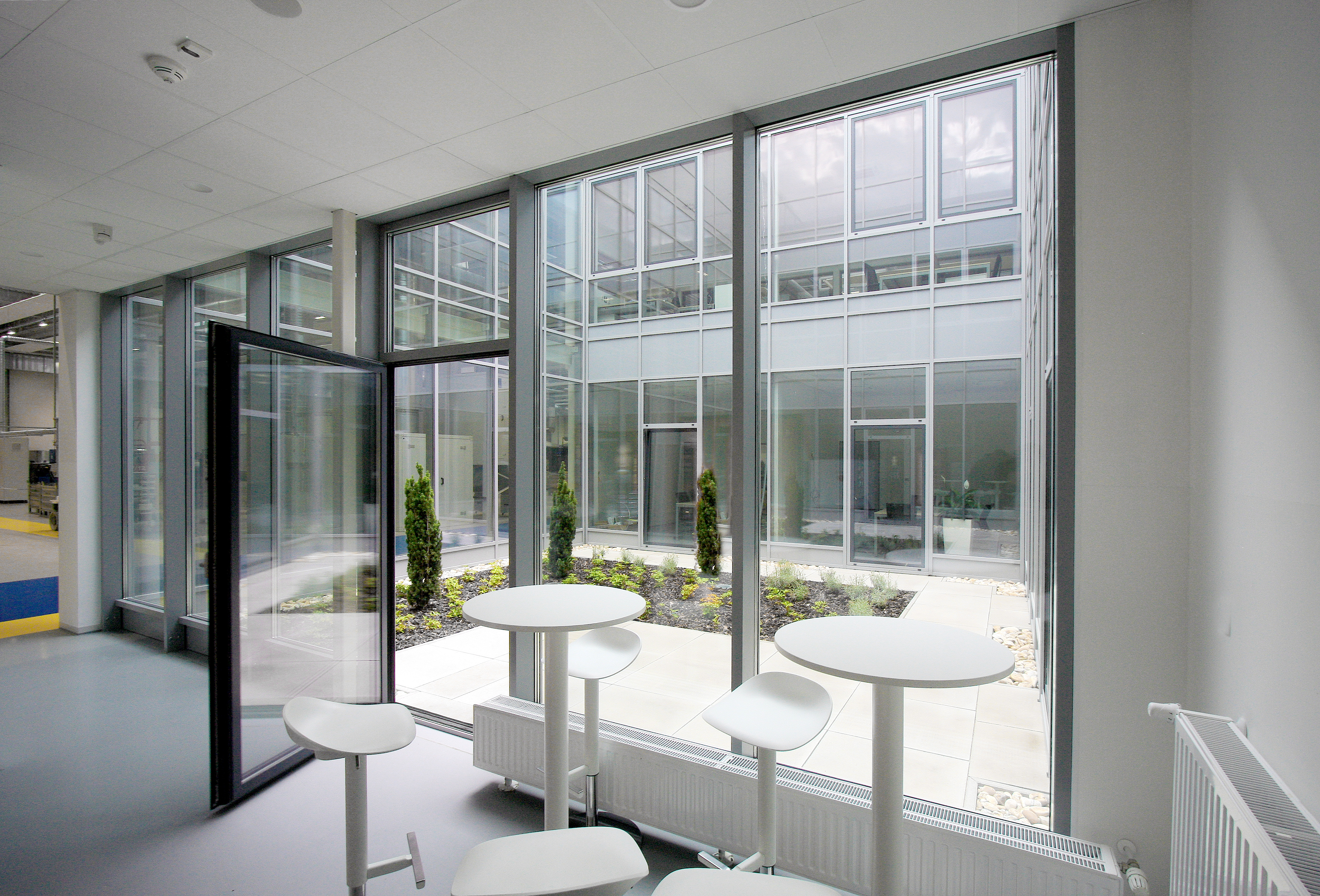 Hala obsahuje v strede svojej dispozície novátorsky riešenú vstavbu kancelárskeho a laboratórneho boxu obsahujúcu aj dennú miestnosť. Táto netradičná vstavba v podobe vloženého strohého bieleho „bauhausovského" domu v dome haly je prederavená vnútorným átriom, ktoré zaplavuje denným svetlom nielen priľahlé kancelárie, ale aj samotnú výrobnú halu. Na naše pomery neobvyklé riešenie vnieslo do výroby prvok oázy zelene, svetla a čerstvého vzduchu.