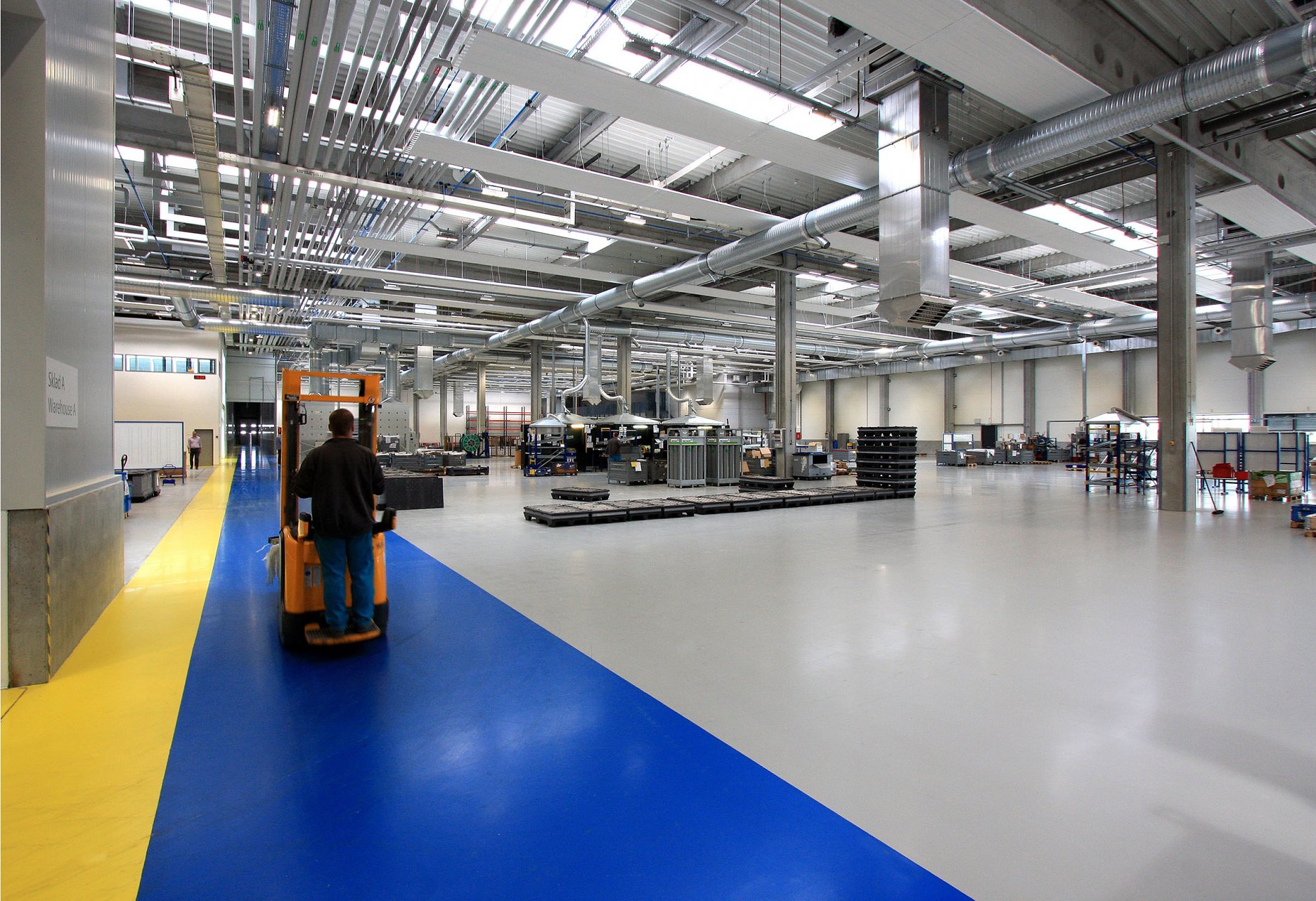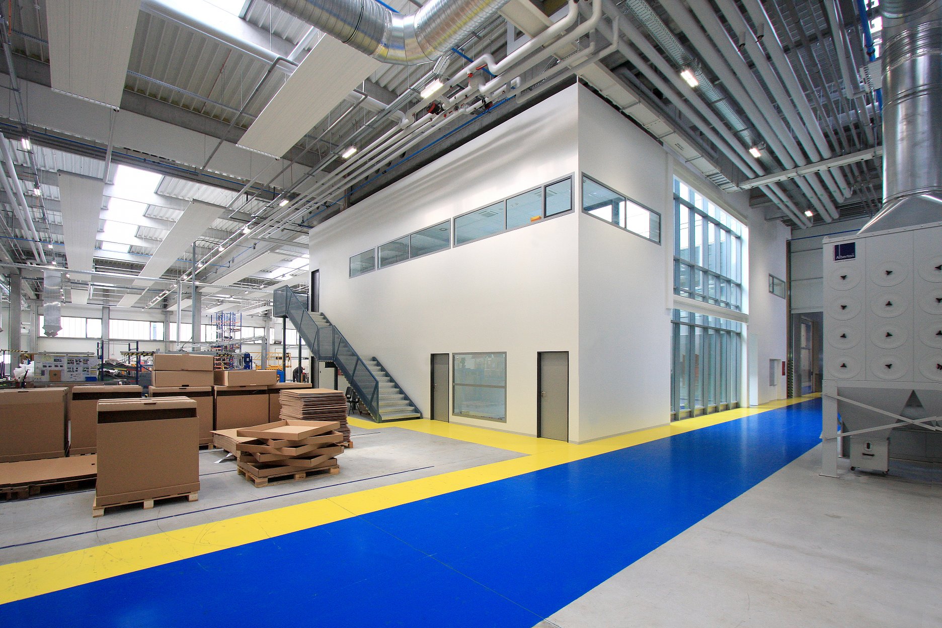 Priestory výroby sú umiestnené v rozsiahlej štvorloďovej hale, ktorej pôdorysné rozmery sú 120 x 300 m. Konštrukciu haly tvorí železobetónový prefabrikovaný skelet, s modulovým rozpätím lodi 30 x 12 m. V hale dominuje jasné vedenie prevádzkových komunikačných trás v čistých priamkových líniách čitateľných už na prvý pohľad ich signálnym odlíšením vo farbe liatej podlahy. Pre zabezpečenie bezkolíznej prevádzky v hale sú komunikačné pásy určené pre pohyb dopravných vozíkov a zamestnancov zreteľne diferencované od výrobných plôch.
