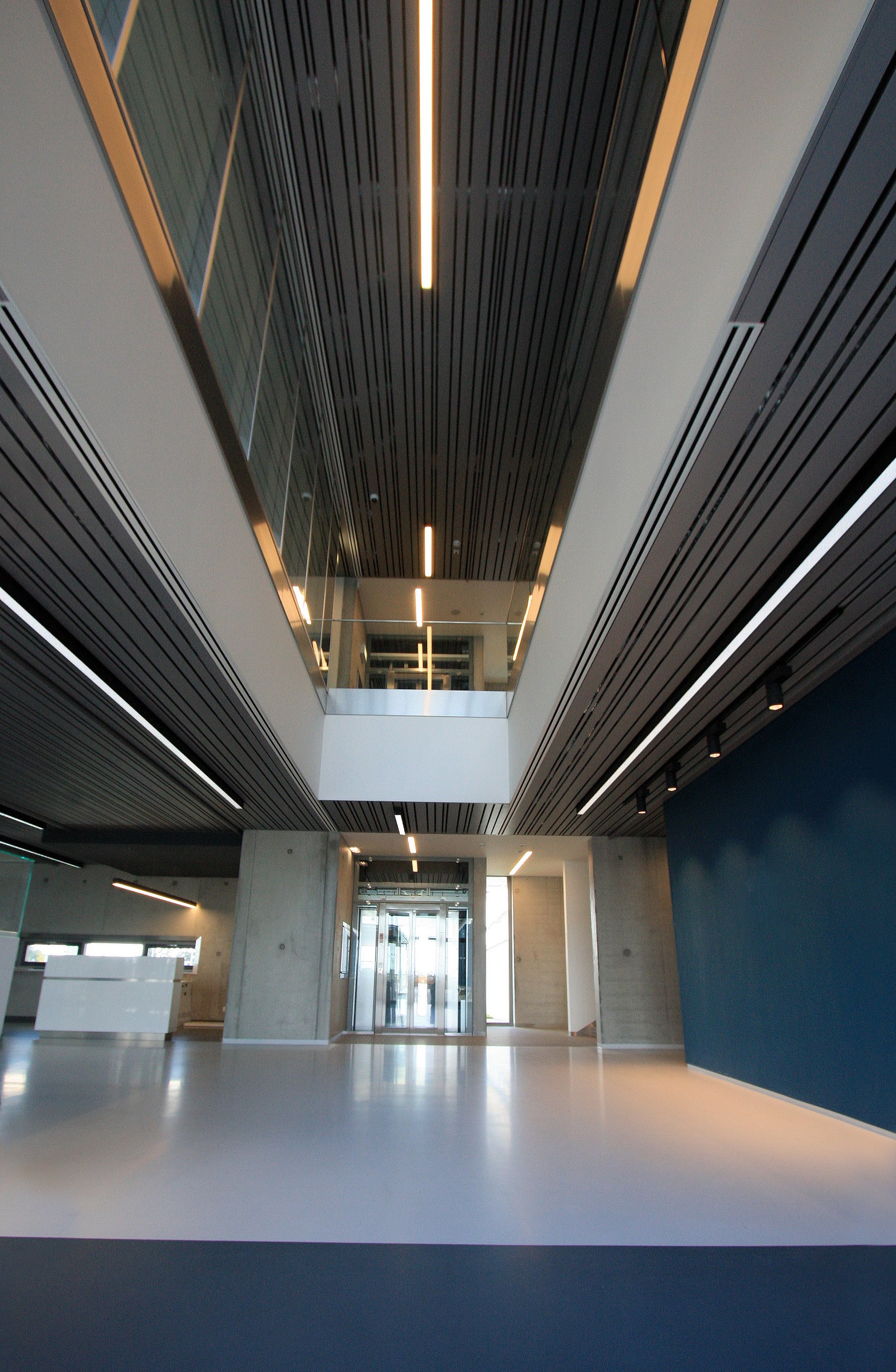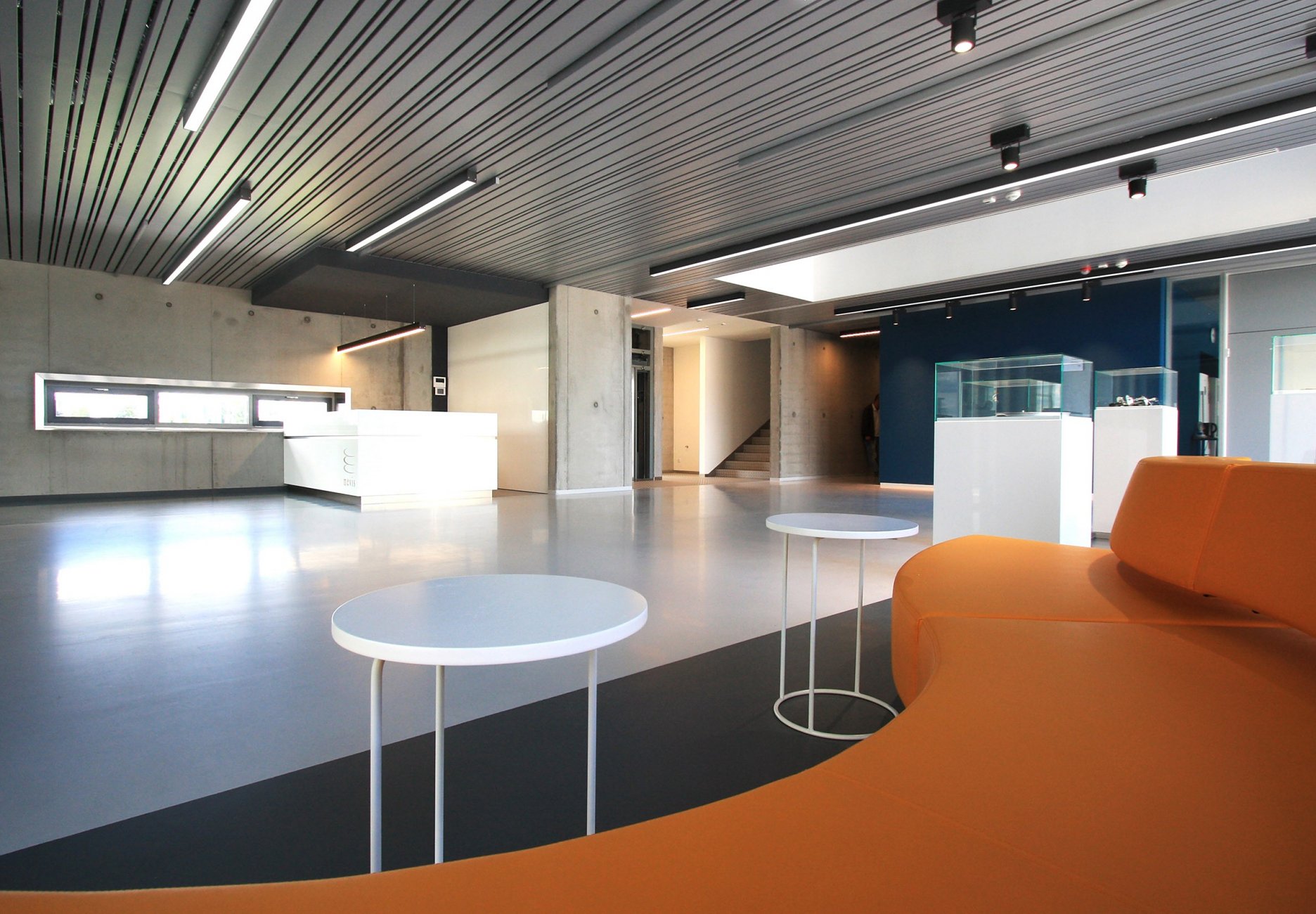 Na poschodí sa po obvode pôdorysu nachádzajú kancelárske priestory osvetlené denným svetlom. Centrálny blok je v zadnej časti ukončený priestormi zasadačiek osvetlených zhora cez svetlíky a s priamym výhľadom do výrobnej haly. Interiér administratívnej časti je ladený v troch dominujúcich farbách, ktoré sa prelínajú celým komplexom - v sivej, bielej a modrej. Farebnosť povrchov, priznané materiály ako pohľadový betón hlavného komunikačného jadra, poly-uretánová podlaha v bielej a sivej kombinácii, hliníkový podhľad Hunter Douglas rastrovaný pásovými led-svietidlami sú determinujúcimi prvkami vysokého štandardu interieru.