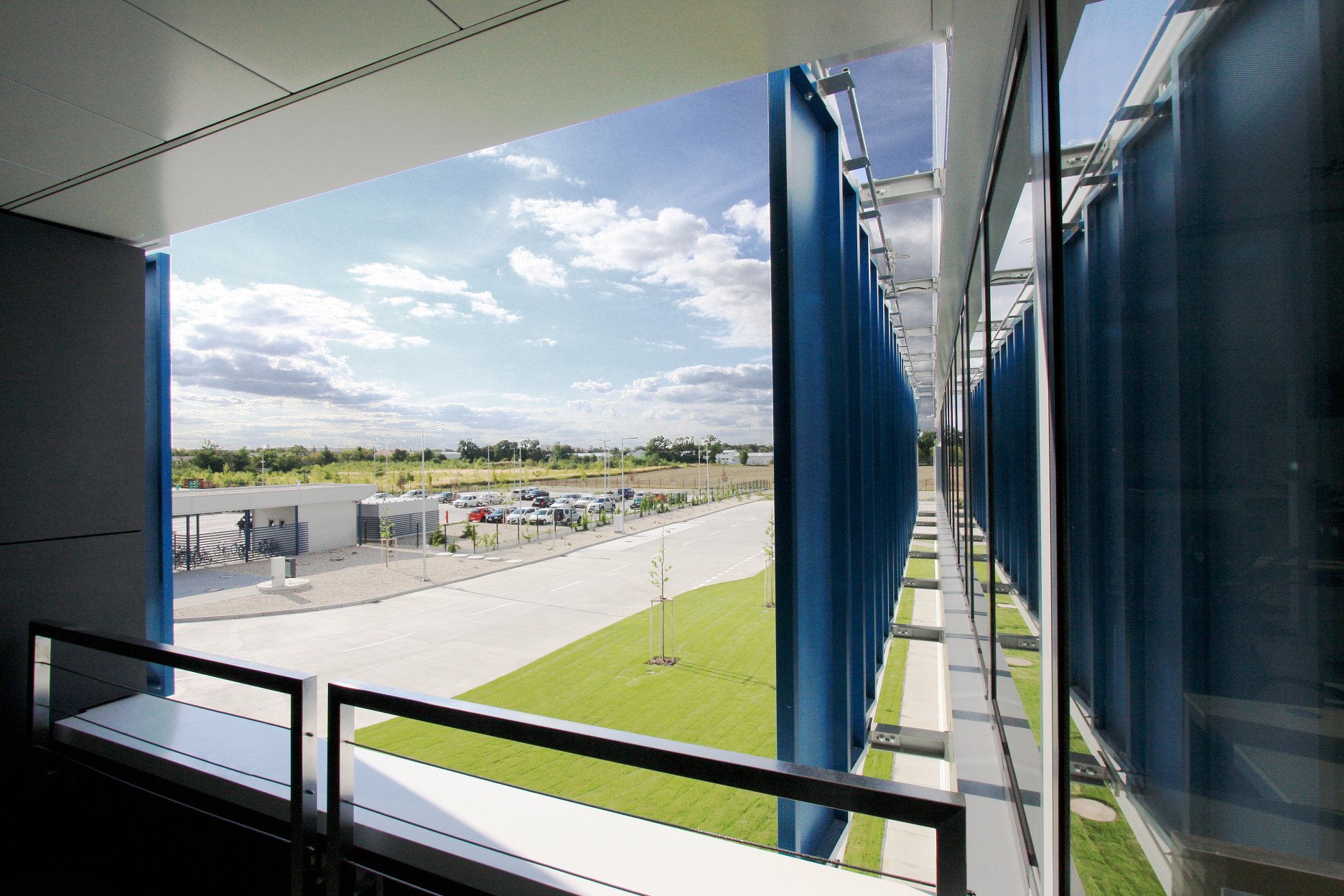 Zaujímavá je svojou členenou fasádou s bielymi horizontálnymi líniami, ktoré sa striedajú s vertikálami výrazných vonkajších slnolamov v korporatívnej modrej farbe, ktoré zároveň vytvárajú dynamiku fasády. Významovo a architektonicky dominantná administratívna časť vytvára bielu predsadenú hmotu priamo napojenú na rozsiahlu halu, v ktorej sa nachádzajú všetky výrobné prevádzky.