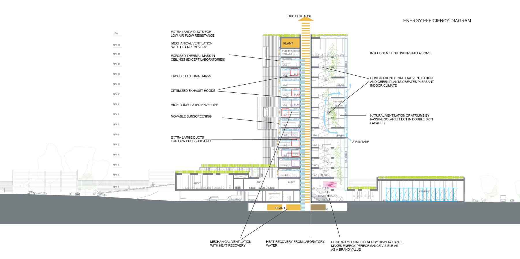 Budova je tiež jednou z energeticky najefektívnejších stavieb v Dánsku. V letných mesiacoch znižuje nároky na chladenie a vetranie budovy dvojitá fasáda, ktorá využíva princíp konvekčného prúdenia vzduchu. Priaznivú klímu a prúdenie vzduchu v budove pomáhajú vytvárať aj otvorené átriá so zelenými rastlinami. O minimalizovanie tepelných ziskov v letných mesiacoch sa stará pohyblivý tienieci systém na fasádach. V zimnom období sa redukciu tepelných strát zabezpečuje vetrenie s rekuperáciou. Energetické straty vo vzduchotechnike sú redukované rozvodmi s veľkým priemerom a nízkou rýchlosťou prúdenia. Zvyškové teplo je odoberané aj z odpadovej vody. Pri návrhu bol kladený dôraz aj na vodné hospodárstvo a retenciu vody na pozemku. Zachytená dažďová voda je využívaná na hospodárske účely a zavlažovanie. S ohrevom úžitkovej vody pomáha 1500 m2 solárnych kolektorov.