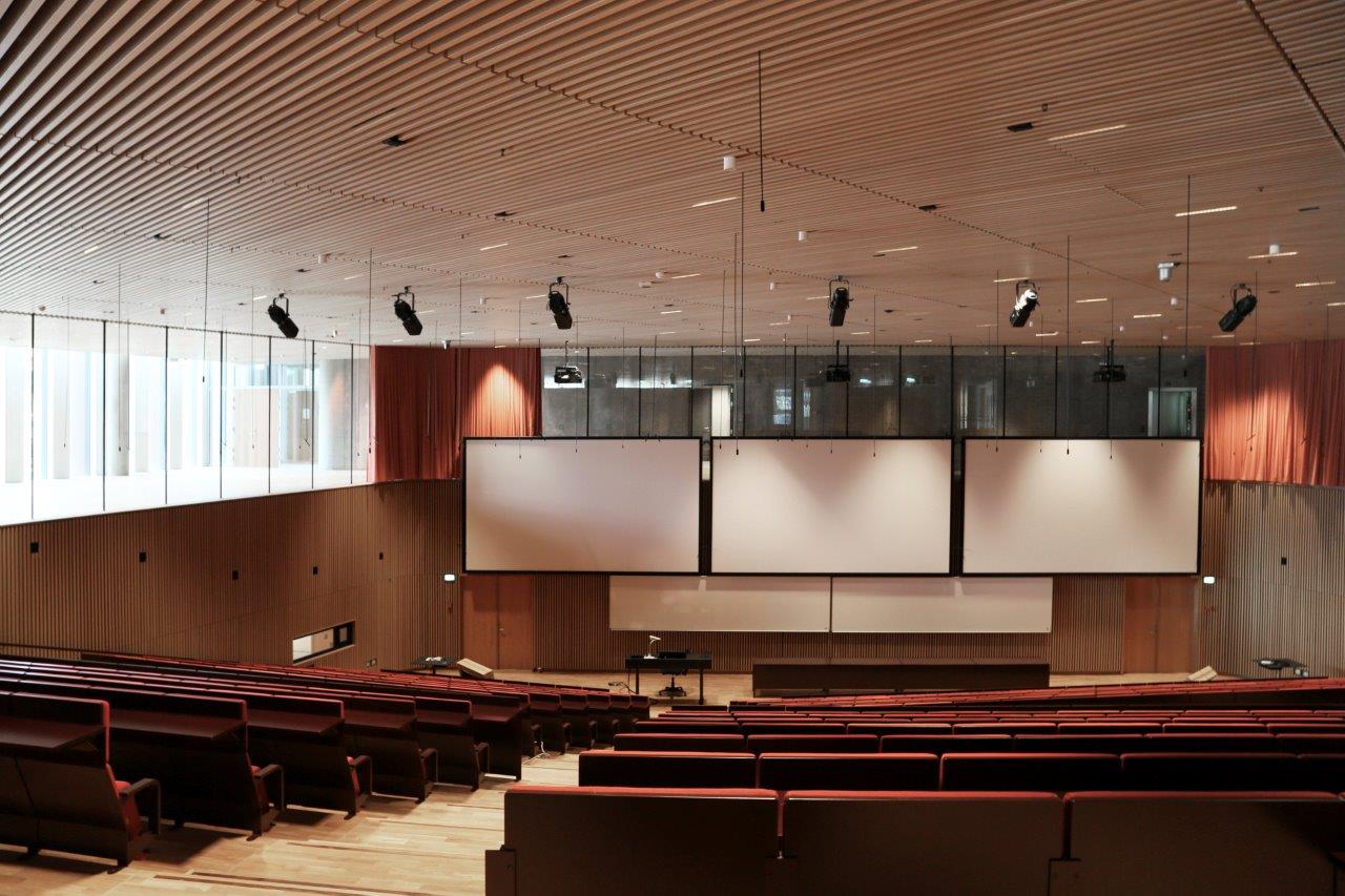 Vonkajší vzhľad stavby vstupuje do dialógu s existujúcim univerzitným komplexom a s mestskou zástavbou, kde prevládajú na priečeliach lícové tehly. Pred zasklenú fasádu je predsadené tienenie. Fasáda je horizontálne členená na polia s výškou jedného podlažia. Tieto polia sú ďalej rozčlenené takmer troma tisíckami vertikálnych medených lamiel. Meď bola pre túto realizáciu zvolená ako bezúdržbový a recyklovateľný materiál. V jej prospech bola aj tradícia medených striech v meste.