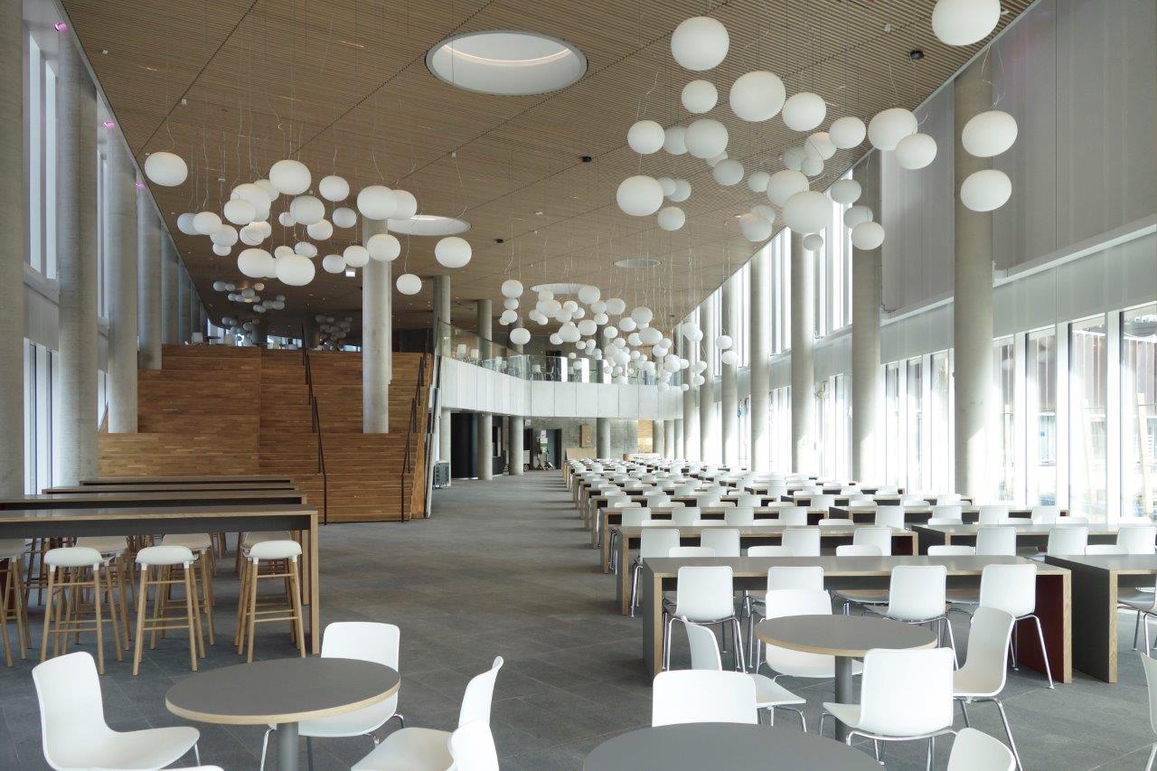 Základňu pätnásťposchodovej výškovej stavby tvorí rad menších objektov, kde sa nachádza spoločné vybavenie: prednáškové sály, učebne, kantína, laboratórium, konferenčné miestnosti a kaviareň spojená s knižnicou.
