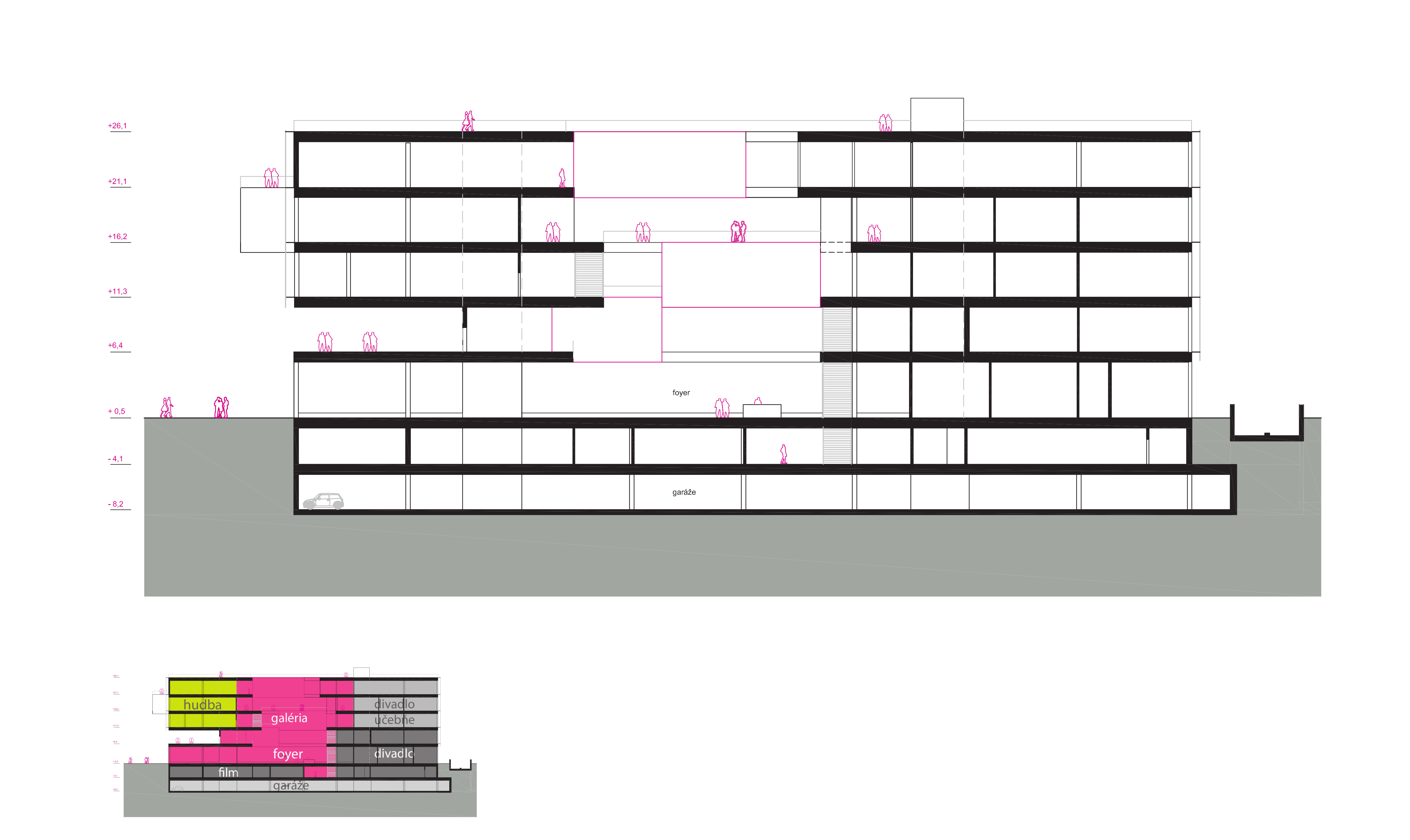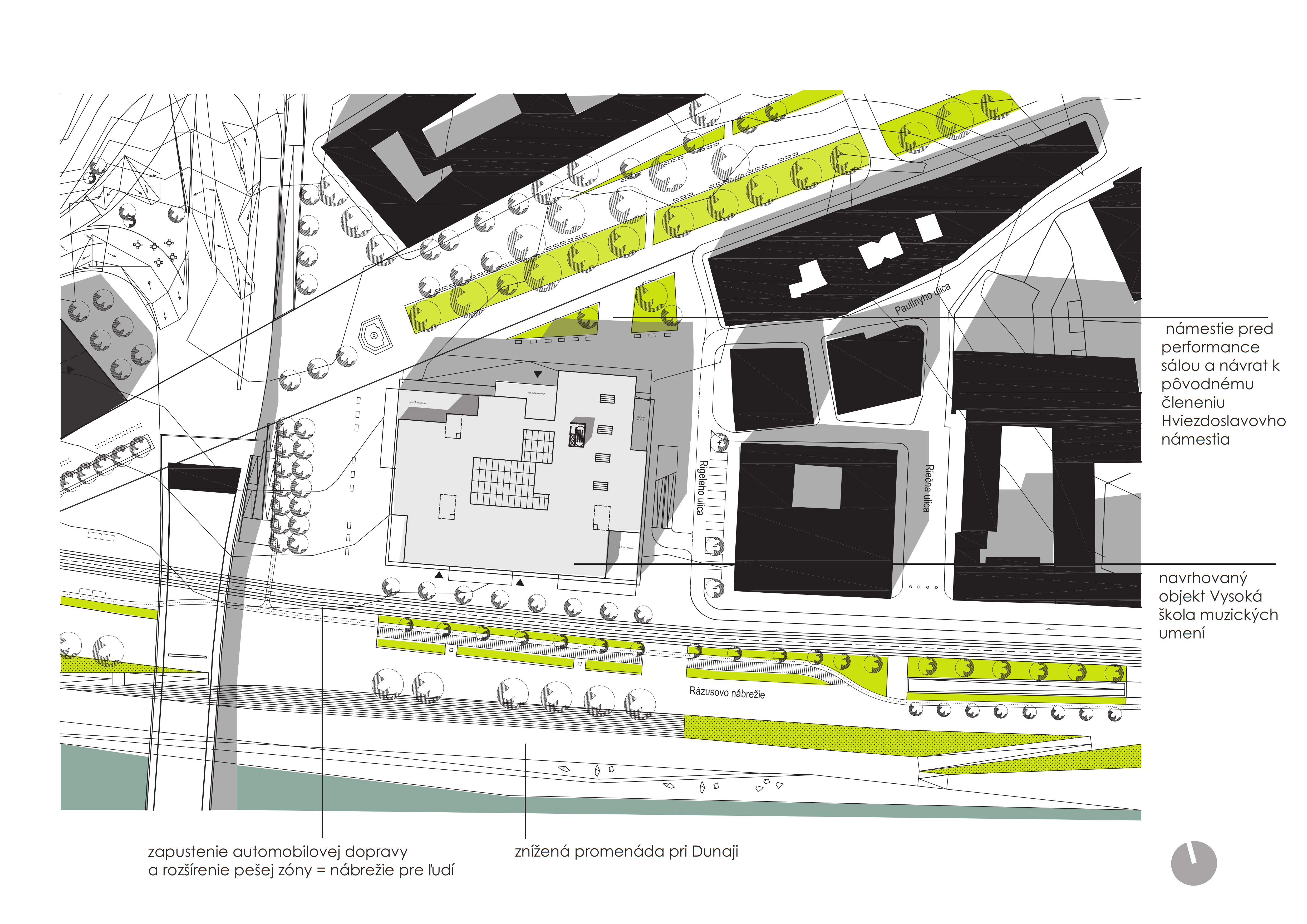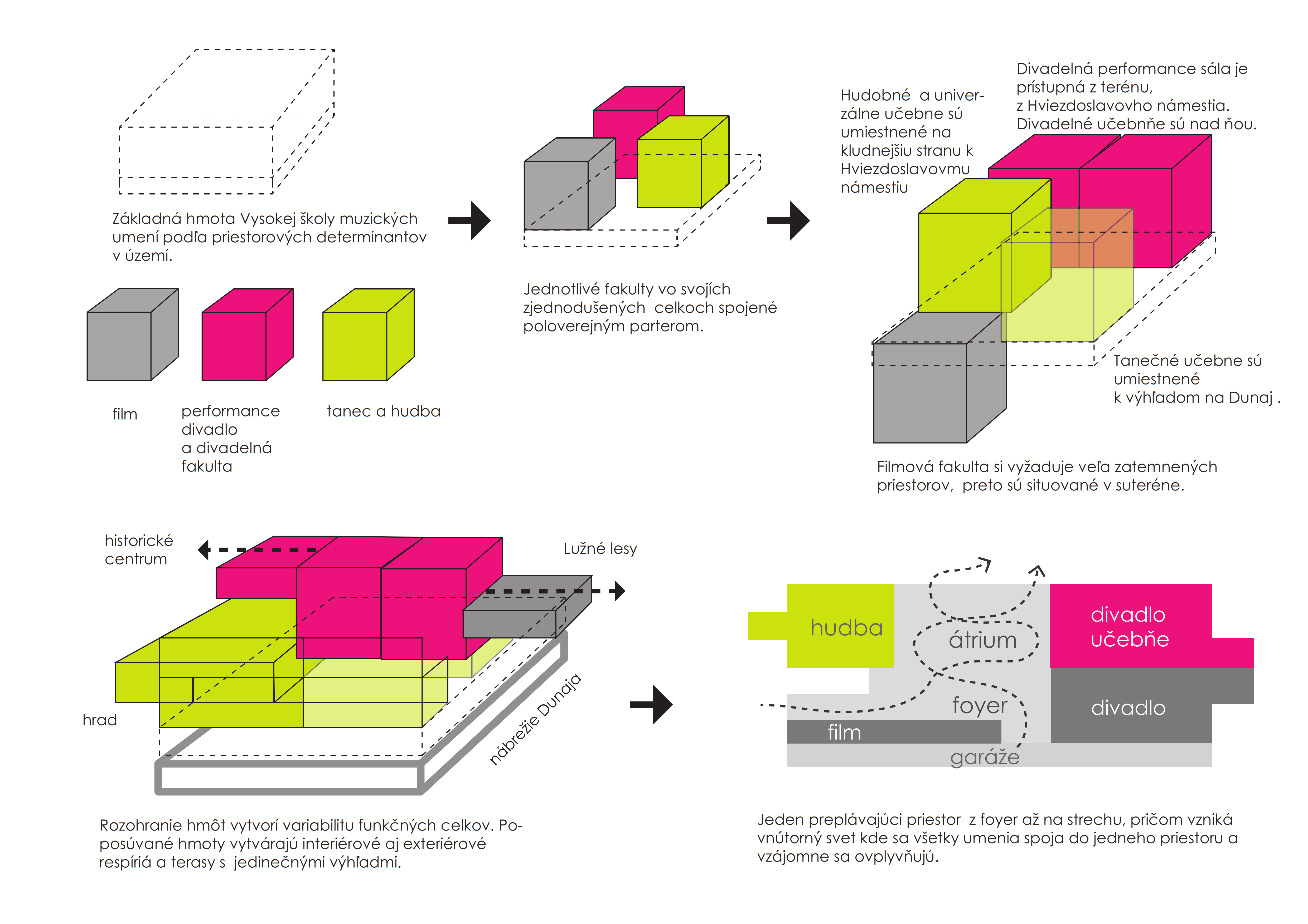 Vysoká škola muzických umení, nie je, len škola. Je to komplexný polyfunkčný kultúrny objekt, ktorom sa spájajú hudba, tanec, divadlo a film v jeden celok. V tomto objekte sa spájajú tri fakulty Fakulta hudby a tanca, Divadelná fakulta a Fakulta televíznej a filmovej produkcie. Tieto odbory sú spolu úzko späté preto je výhodné aby sídlili spolu v jednom objekte. Každý odbor si vyžaduje špecifické priestory, mnohé z nich však môžu zdielať spoločne, napríklad tanečné sály, univerzálne sály alebo televízne štúdio. Tento objekt však nebude čisto introvertný, zámer je vytvoriť aj introvertný priestor pre študentov, ale aj priestory komunikujúce s okolím a verejnosťou. Nachádzame sa na kultúrnej osi, ktorá vedie od už zničeného Parku kultúry a oddychu, takže kultúrna funkcia tu má svoje opodstatnenie. Budova by mala byť v parteri prechodná aj pre verejnosť, v parteri z Hviezdoslavovho námestia je aj vstup do veľkej univerzálnej sály s kapacitou 380miest a vstup do malej sály od nábrežia. Toto miesto by sa mohlo stať kultúrnym centrom ,,mladej,, umeleckej scény, pre všetkých.