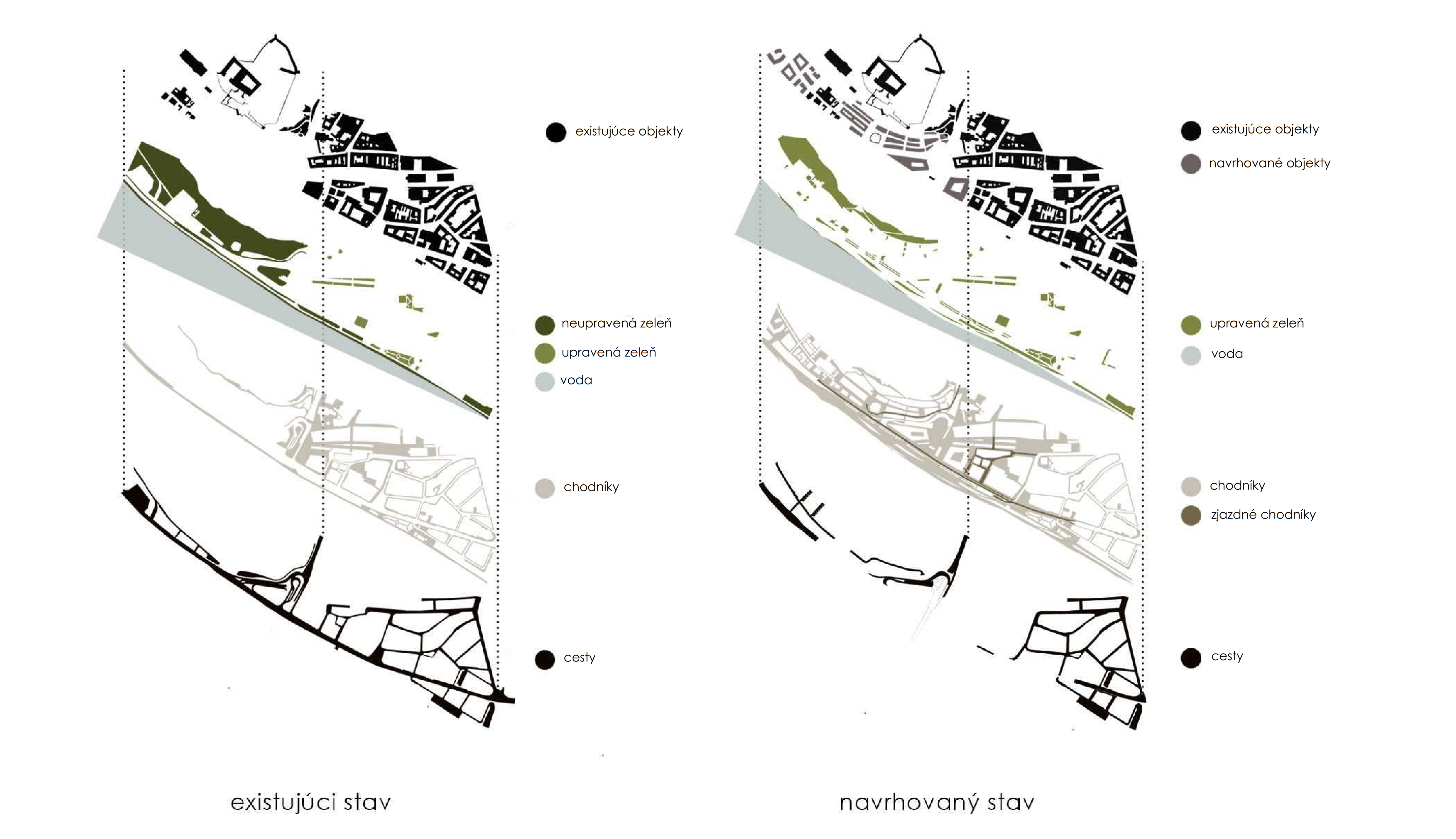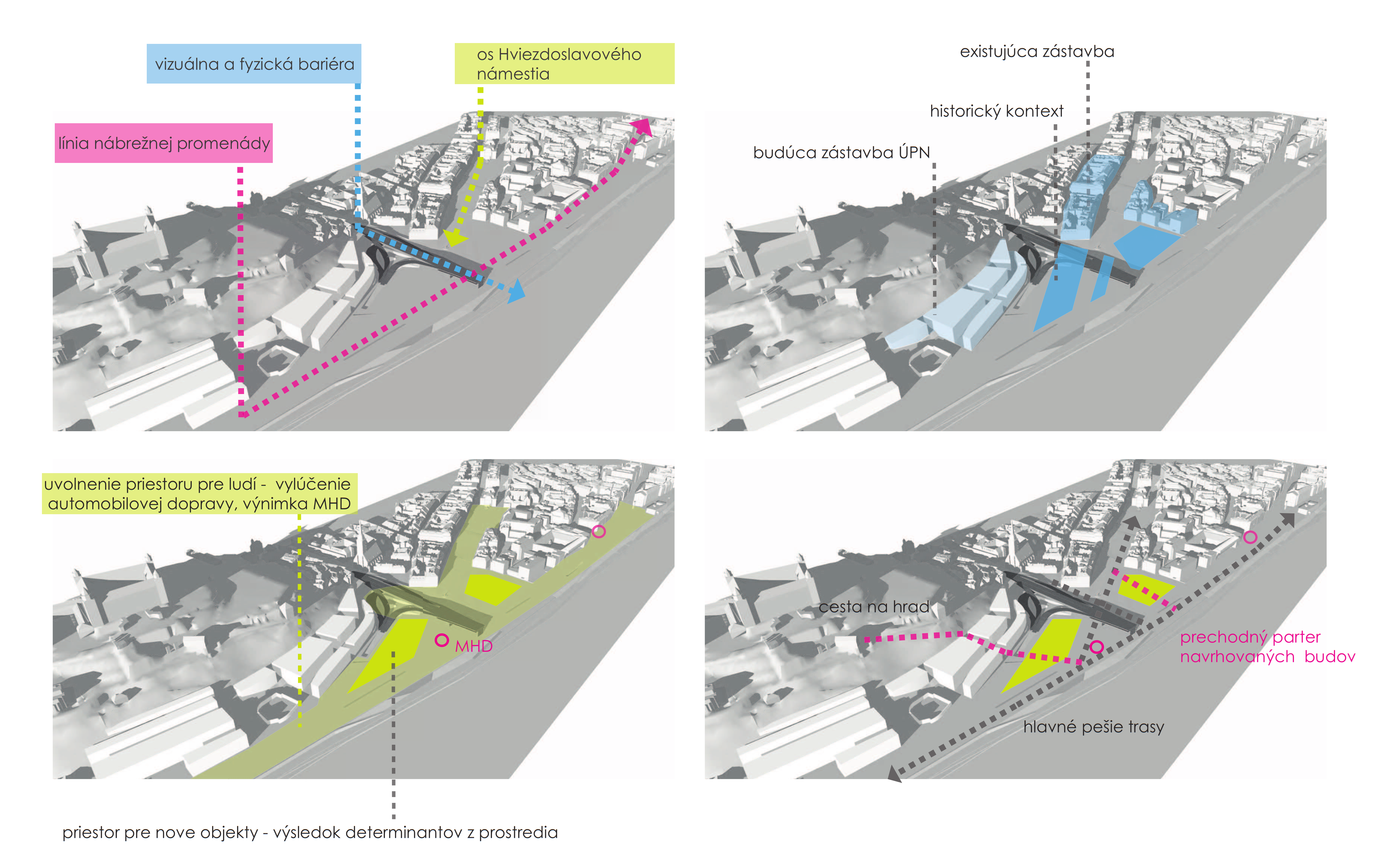 Územie sa nachádza na frekventovanom mieste v úzkom centre Bratislavy, na Rybnom námestí. V tesnej blízkosti je Most SNP a vyústenie Hviezdoslavovho námestia. Celé územie je zasiahnuté dopravnou infraštruktúrou mosta a tiež mestského okruhu, ktorý vedie popri Dunaji. V súčasnosti na riešenom území stojí hotel Danube, na ktorom prebiehajú búracie práce. Popri Dunaji je vedená aj električková trať a zopár autobusových liniek. Tieto majú koncovú zastávku pod Mostom SNP, čo výrazne ovplyvňuje vľúdnosť tohto mestského priestoru. Mostná konštrukcia síce nie je najkrajšia, ale v prípade presunutia tohto depa, by bolo možné túto lokalitu vylepšiť a dať jej novú atraktívnu funkciu, napríklad park, kaviarne, skate park a podobne. V urbanistickej štúdii sme dospeli k radikálnemu riešeniu zapustenia automobilovej dopravy na mestskom okruhu, od Šafárikovho námestia až po River park. Okrem toho sme zapustili aj mostné ramená, práve tie tvoria najväčšiu bariéru v území, a v podzemí sme vytvorili kruhový objazd. Takto môže fungovať doprava a zároveň sa môže predĺžiť línia Hviezdoslavovho námestia a Rybného námestia až k Dunaju. V minulosti sa tu nachádzala najdôležitejšia mestská brána tzv. Vydrická brána, ktorou naposledy prechádzala aj Mária Terézia na korunováciu. Toto miesto v priebehu rokov minulých, prešlo mnohými radikálnymi zmenami. Najskôr bola Vydrica kompletne zdevastovaná a neskôr sa uskutočnila výstavba Mostu SNP, ktorá výrazne zmenila výraz tohto územia.