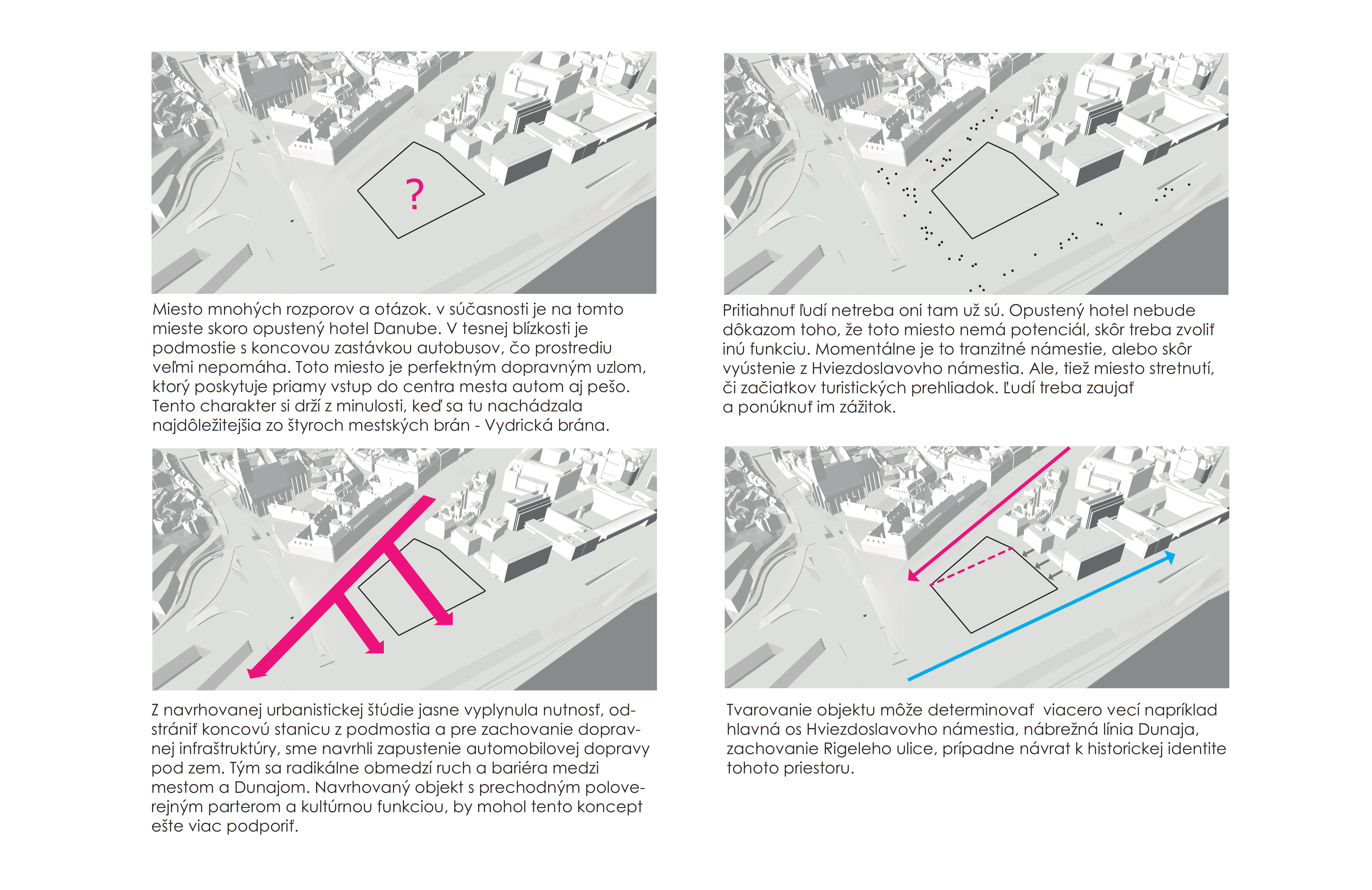 Územie sa nachádza v Bratislave, v historickom centre, na Rybnom námestí. Územie je významným dopravným uzlom, spája dopravné ťahy zo všetkých okolitých štvrtí mesta cez Staromestskú ulicu vedie jediná priama cesta do centra mesta. Územie je plné potenciálov, dopravná situácia ich však neguje. Návrh zapustenia automobilovej komunikácie pod úroveň terénu by jednoznačne zlepšil estetickú stránku územia, ale znížil by sa aj hluk a mesto by opäť naplno komunikovalo s Dunajom. Vybudovaním podzemných ciest sa uľahčí aj vstup do podzemných garáží ktoré sú situované na 2PP v navrhovanom objekte. Vzniknutá nábrežná promenáda pripomína staré časy Pršporku. Urbanistické riešenie objektu je závislé od mnohých okolitých determinantov. Dôležité bolo zachovanie osi Hviezdoslavovho námestia a jeho uličných čiar, uličných čiar na nábreží a celej nábrežnej línie, ktorú udáva majestátna Slovenská národná galéria. Výškový determinant je na tomto mieste dôležitý, pretože pri zachovaní výšky okolitých budov sa zachovajú aj zaujímavé priehľady na miestne dominanty, ako Bratislavský hrad, alebo Dóm Sv. Martina. Navrhovaná budova dodržuje všetky tieto podmienky, pričom na Hviezdoslavovom námestí objekt zámerne otvára priehľad na budovu Nemeckej ambasády od, podľa historických dokumentov bola pôvodná zástavba práve takto.