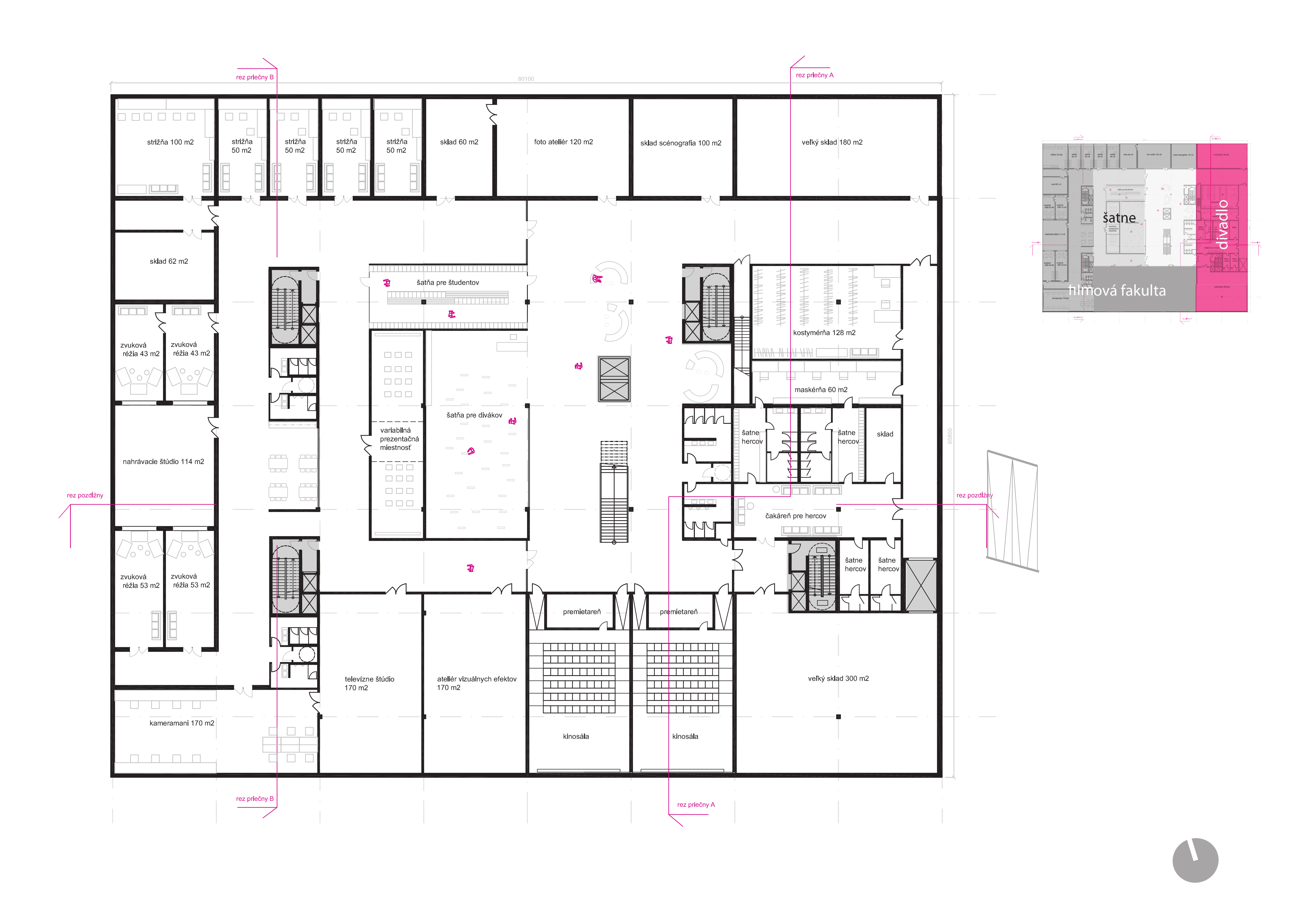 Funkčné a dispozičné riešenie budovy vychádza z funkcie vysokej školy, ale aj kultúrneho centra. Každá z fakúlt má iné plošné, insolačné a aj akustické požiadavky, preto koncipovanie jednotlivých fakúlt v rámci objektu bolo trochu náročnejšie. Pod objektom sú dva suterény, na 2PP sa nachádza garáž a na 1PP priestory filmovej fakulty a zázemie divadelnej sály ( šatne pre hercov, maskérňa, kostymérňa, sklady kulís a rekvizít ). Parter je riešený ako veľký otvorený priestor s foyer, ktoré môže slúžiť aj na umiestňovanie expozícií, študentských performance vystúpení alebo premietanie študentských filmov. Tento priestor vyúsťuje veľkou galériou cez všetky podlažia až na strechu, kde je prestrešená svetlíkom. Ďalej v parteri sa nachádza knižnica a bistro prístupné aj verejnosti. Pre verejnosť sú hlavne dve univerzálne sály veľká divadelná s kapacitou 380miest a malá prednáškovo- hudobná s kapacitou 200miest. Obe fungujú samostatne bez nutnosti otvorenej školy. Veľká sála má celú zadnú stenu celkom otváravú pomocou mobilných stien, tak aby sa mohlo predstavenie napríklad presunúť až von, na Hviezdoslavovo námestie. Jednotlivé fakulty v budove sú segregované tak aby sa v budove ľahko orientovalo a aby boli jednotlivé fakulty obsluhované každé svojím schodiskom. Okrem toho sú v otvorenej galérii umiestnené dva výťahy a schodisko, ktoré putuje po obvode galérie. Tvarovanie budovy sa odvíja od jednotlivých typologických druhov miestností a za účelom vytvorenia respírii a terás. Tieto terasy sú na vybraných miestach , kde poskytujú zaujímavé výhľady na hrad, Dunaj, historické centrum alebo Lužné lesy.